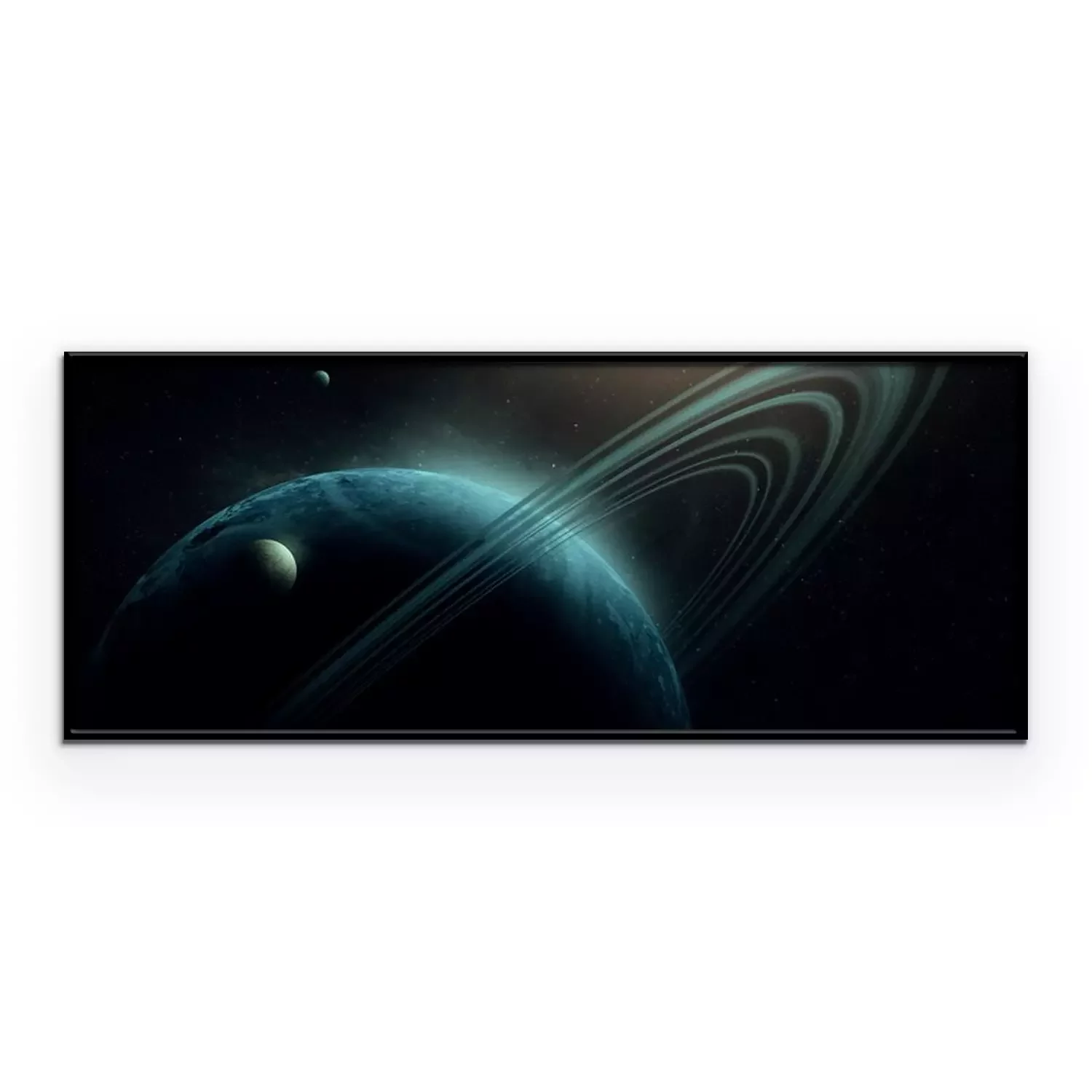 Poster planet with rings and moons, planet and satellites sci fi space background realistic illustration (no NASA images used)