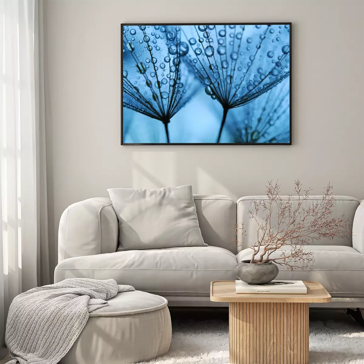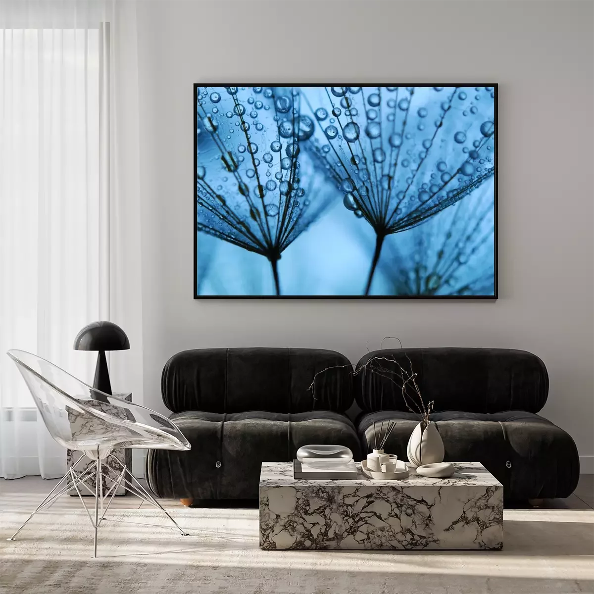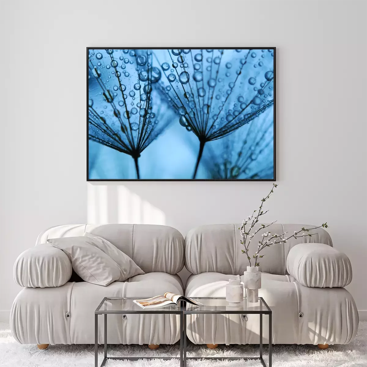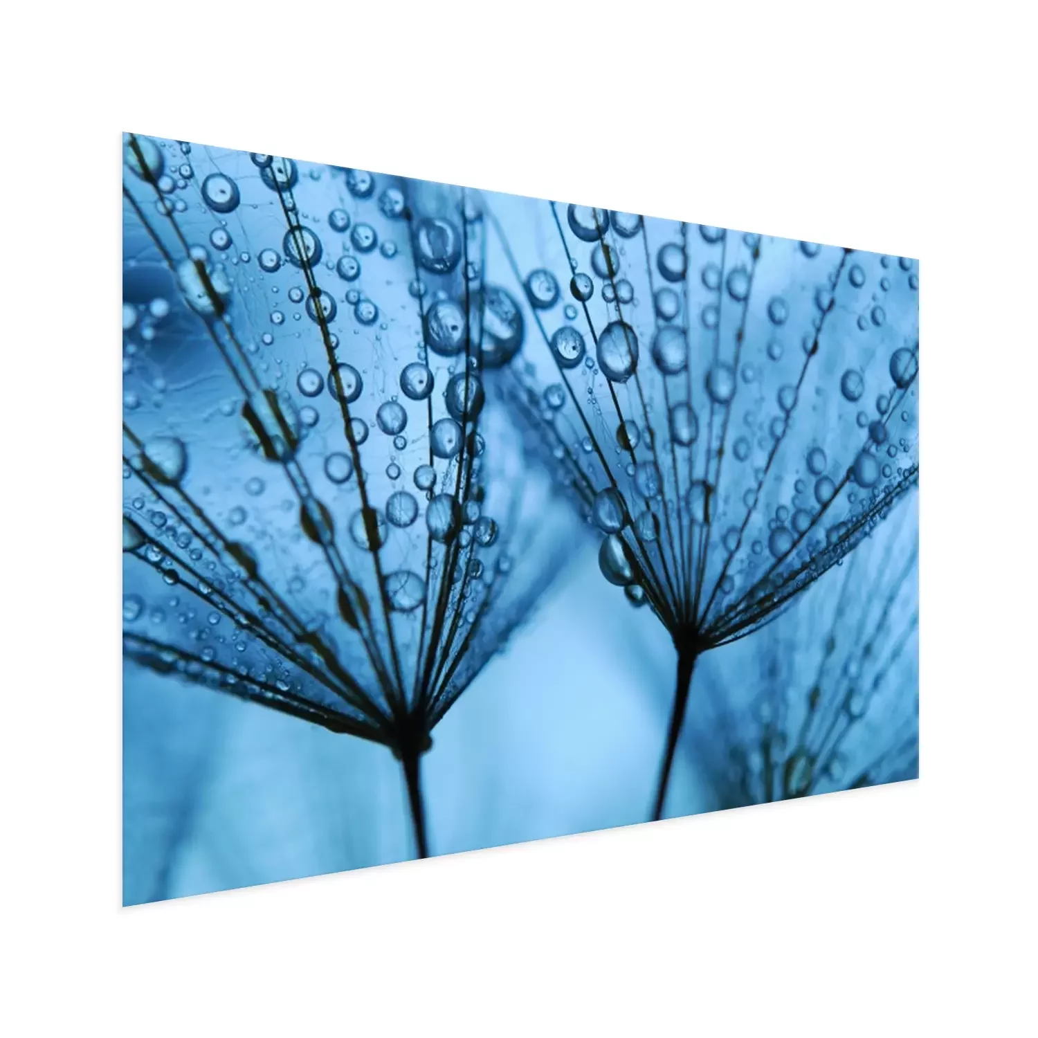 De pluisjes van een paardenbloem zijn bedekt met dauw