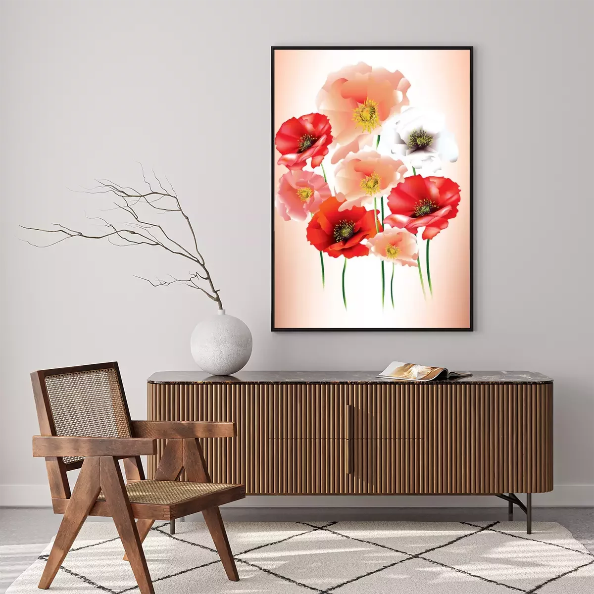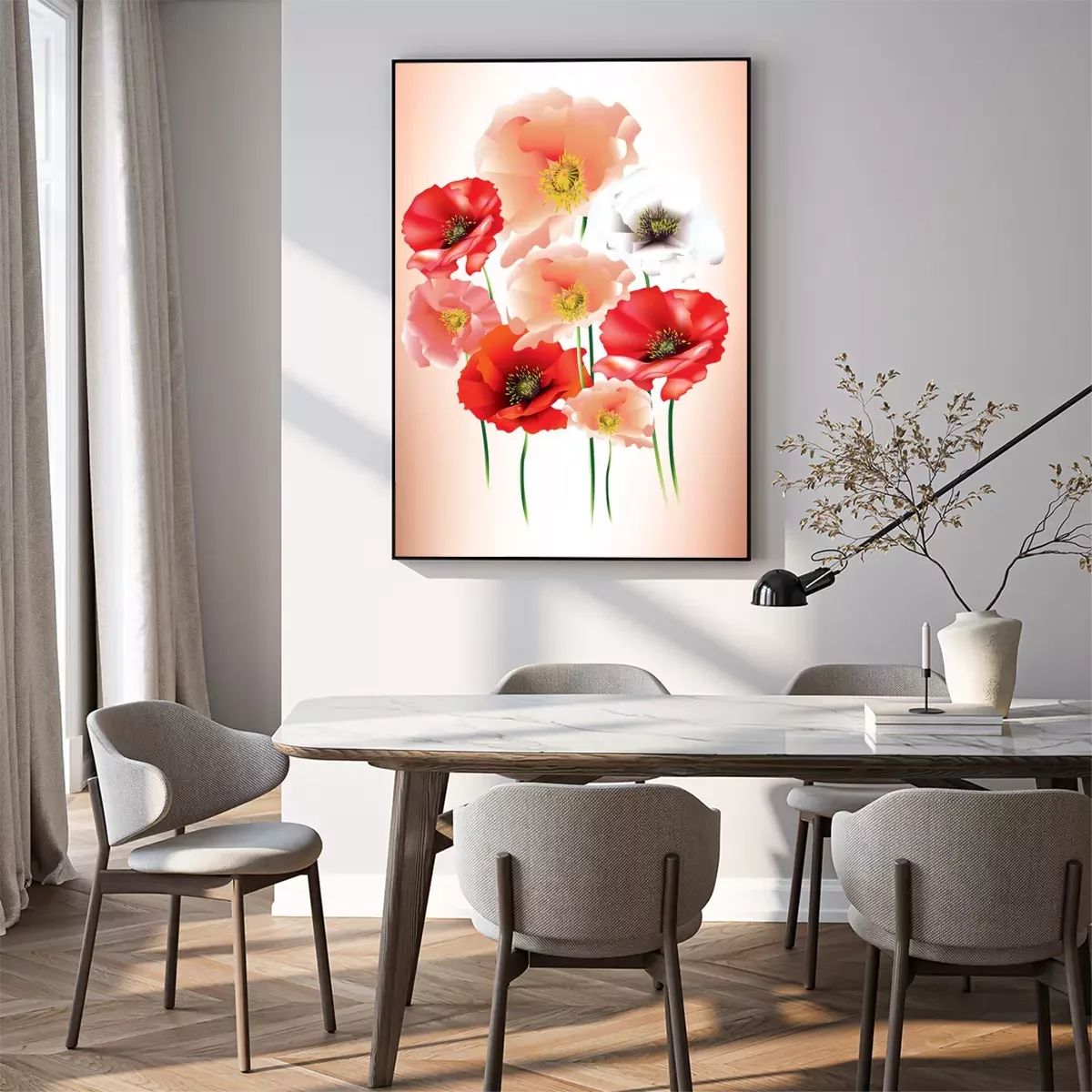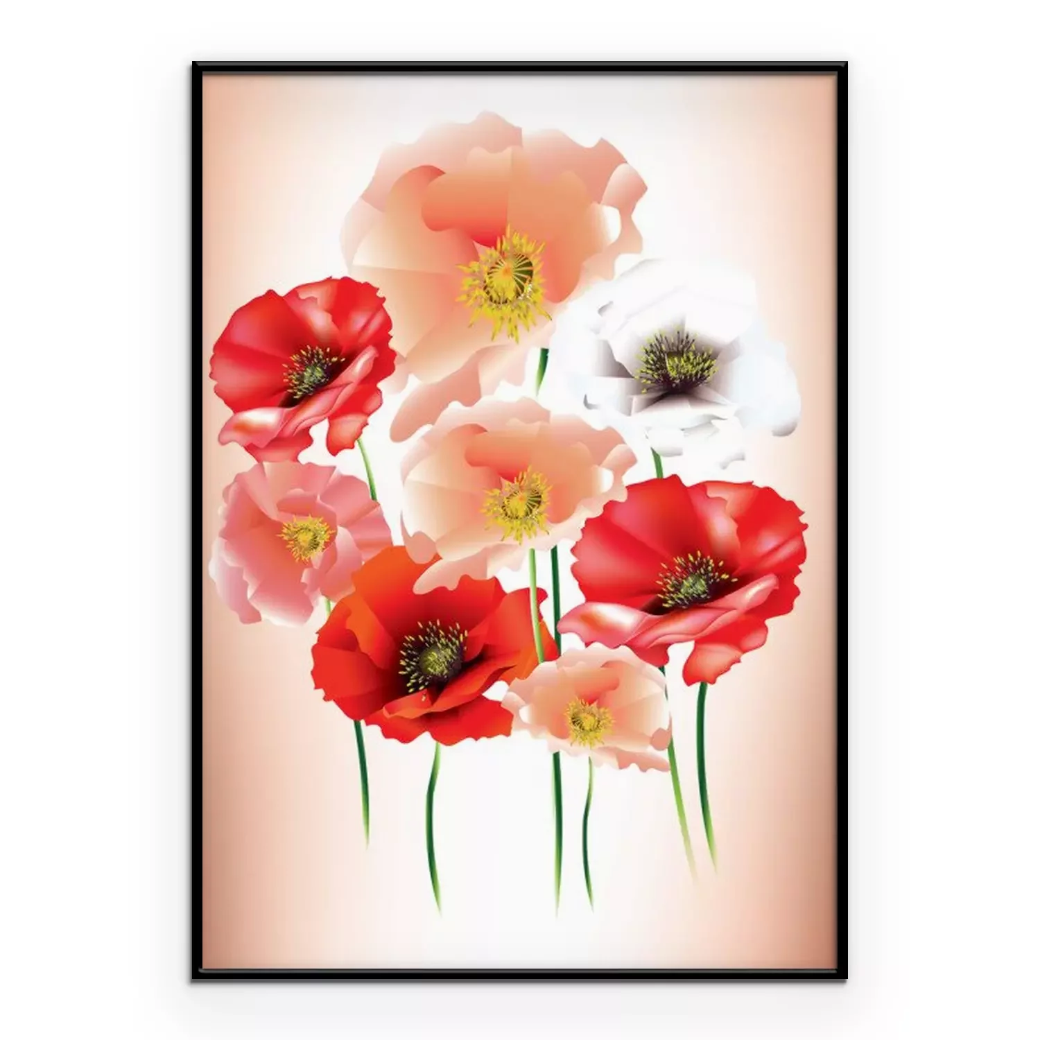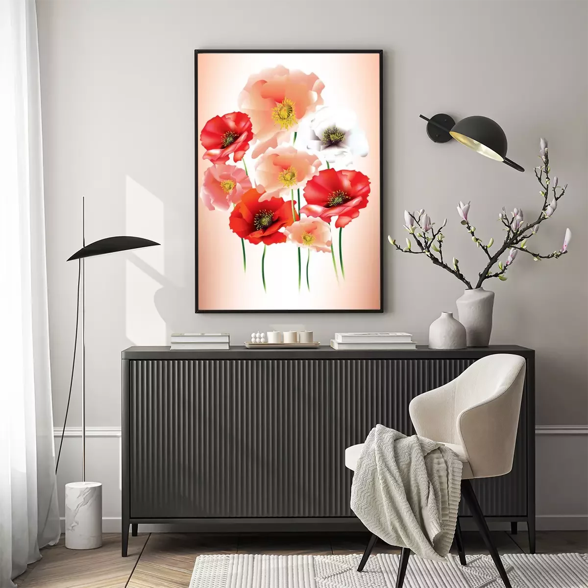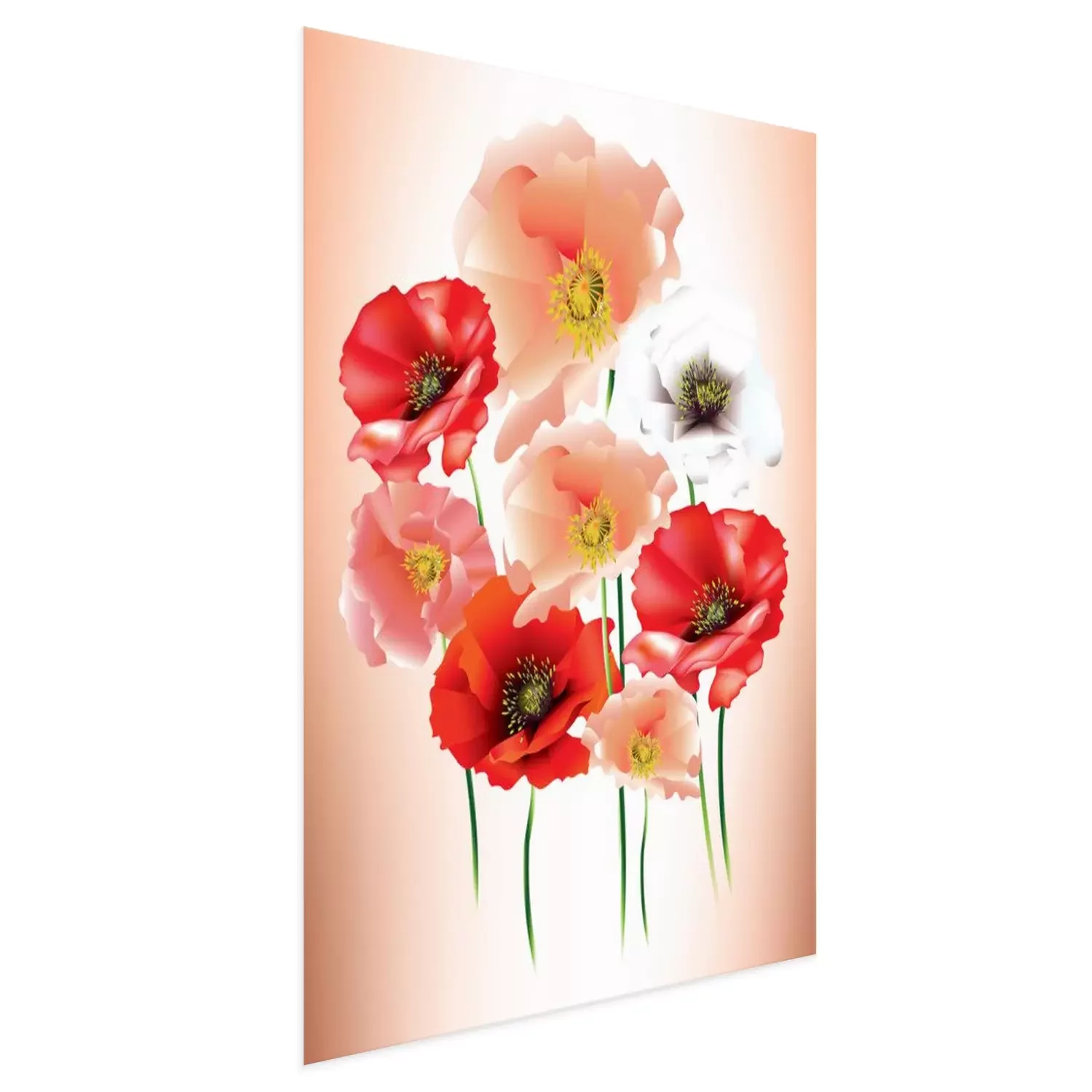Poster: Poederachtige klaprozen en rode klaprozen op een schaduwrijke achtergrond