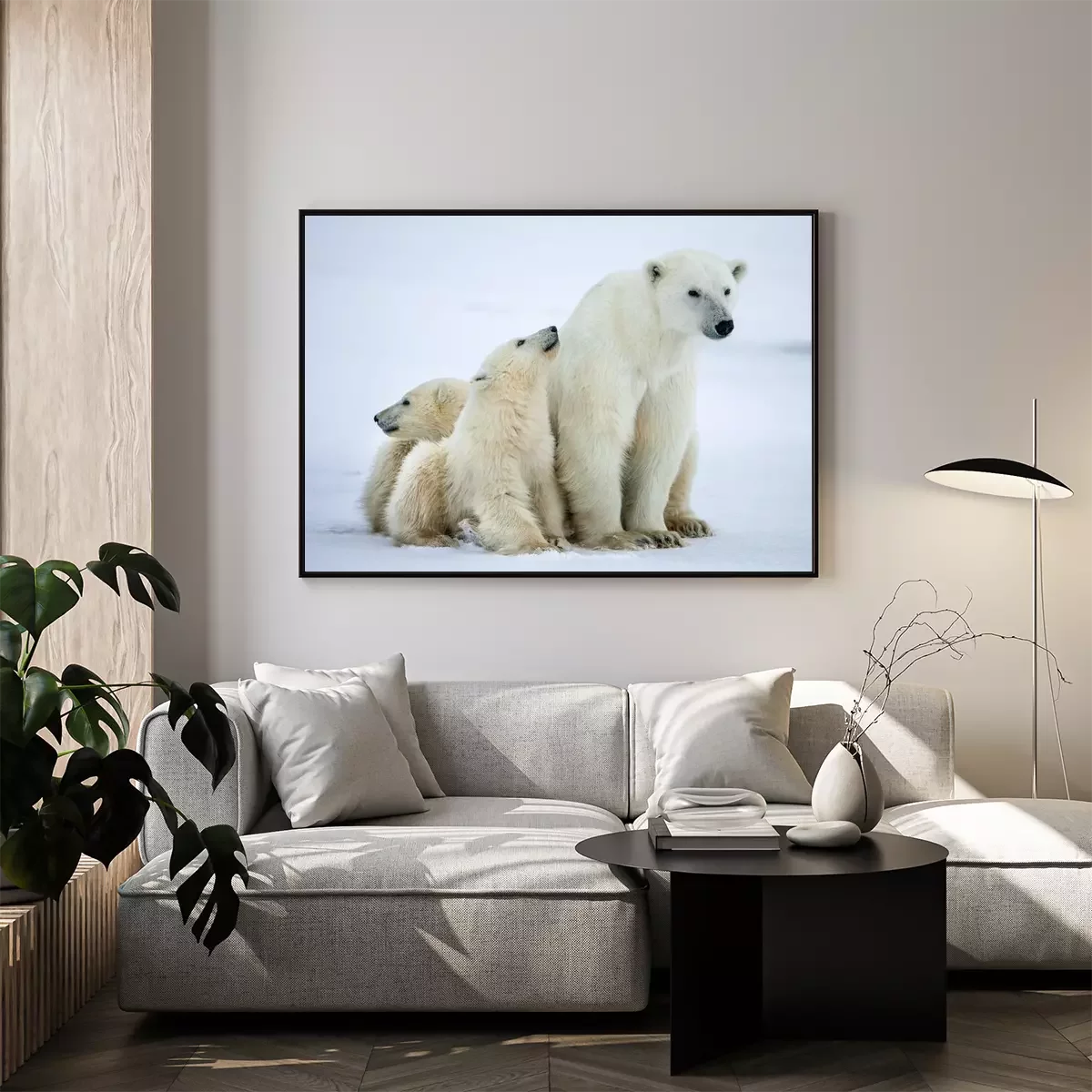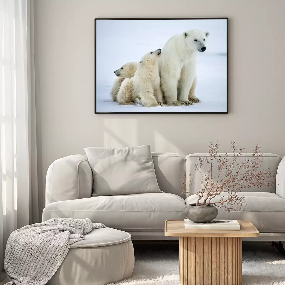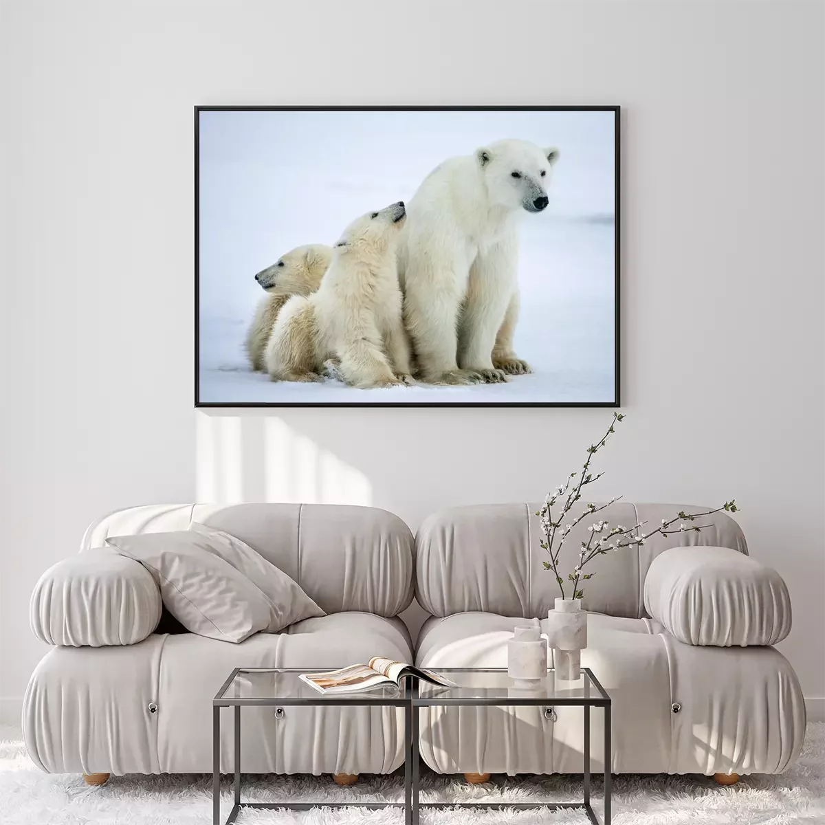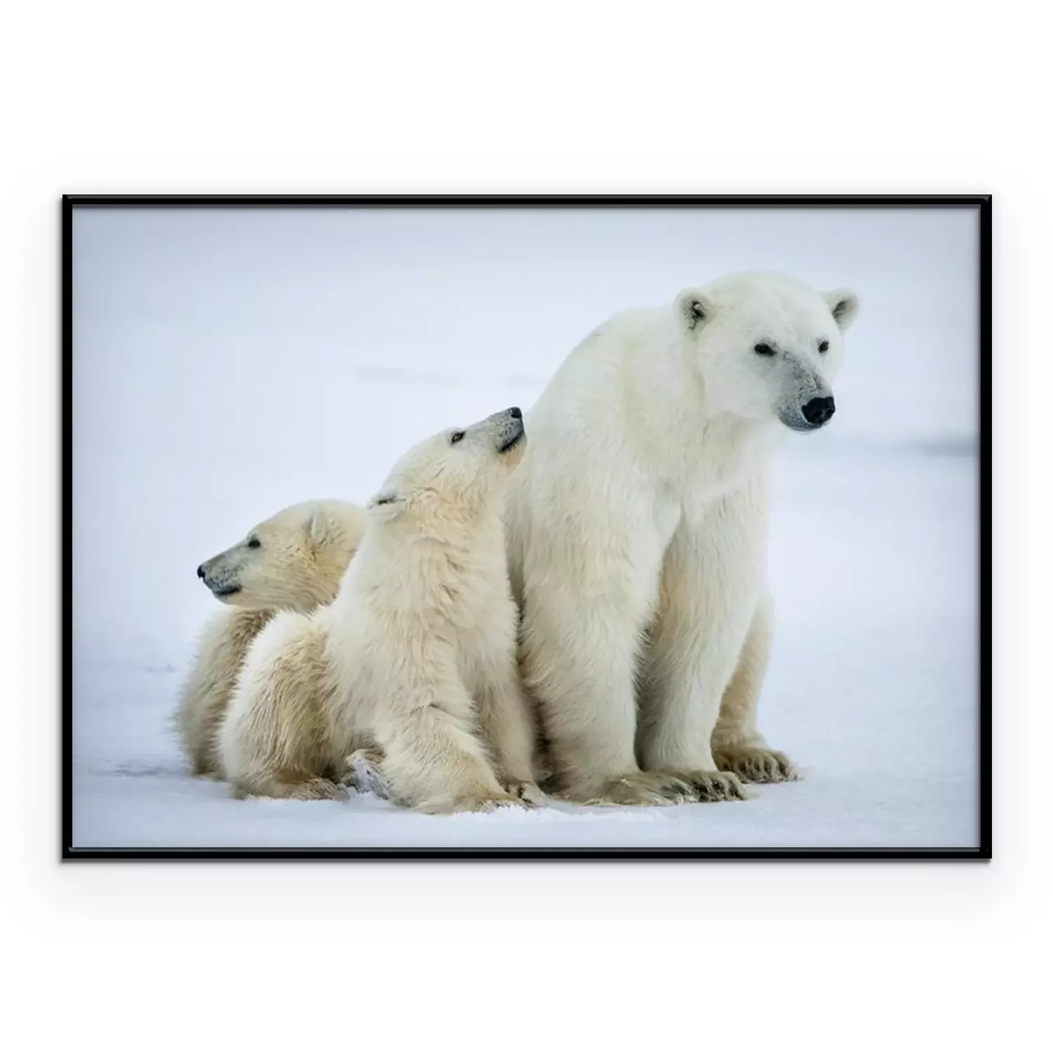 Poster Polar she-beer met welpen. Een Polar berin met twee kleine beer welpen op de sneeuw.