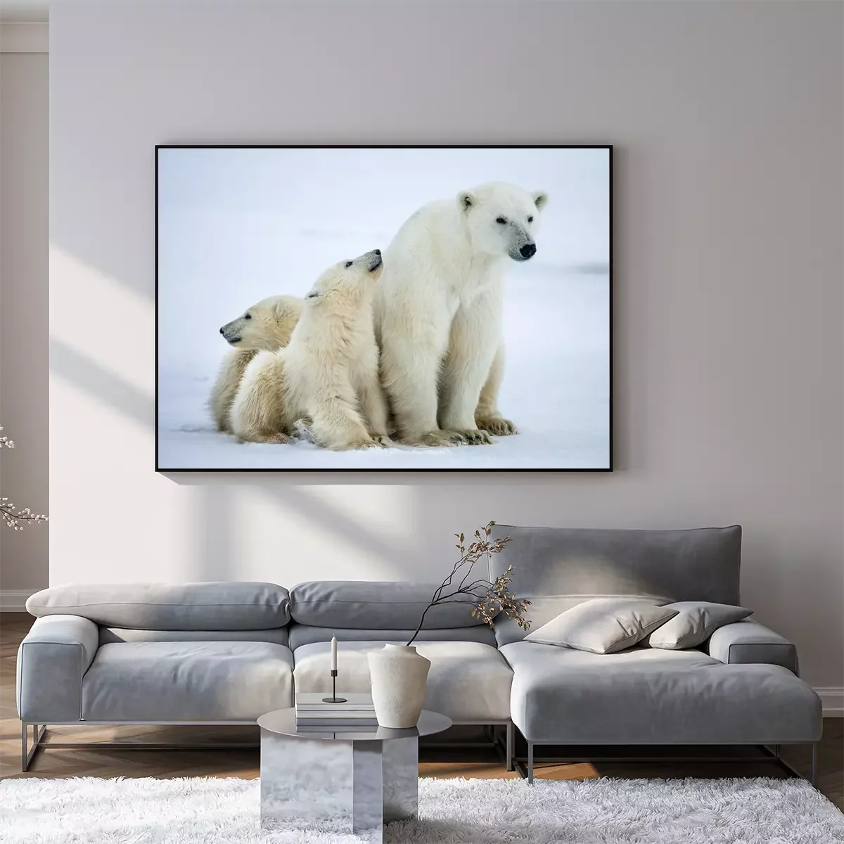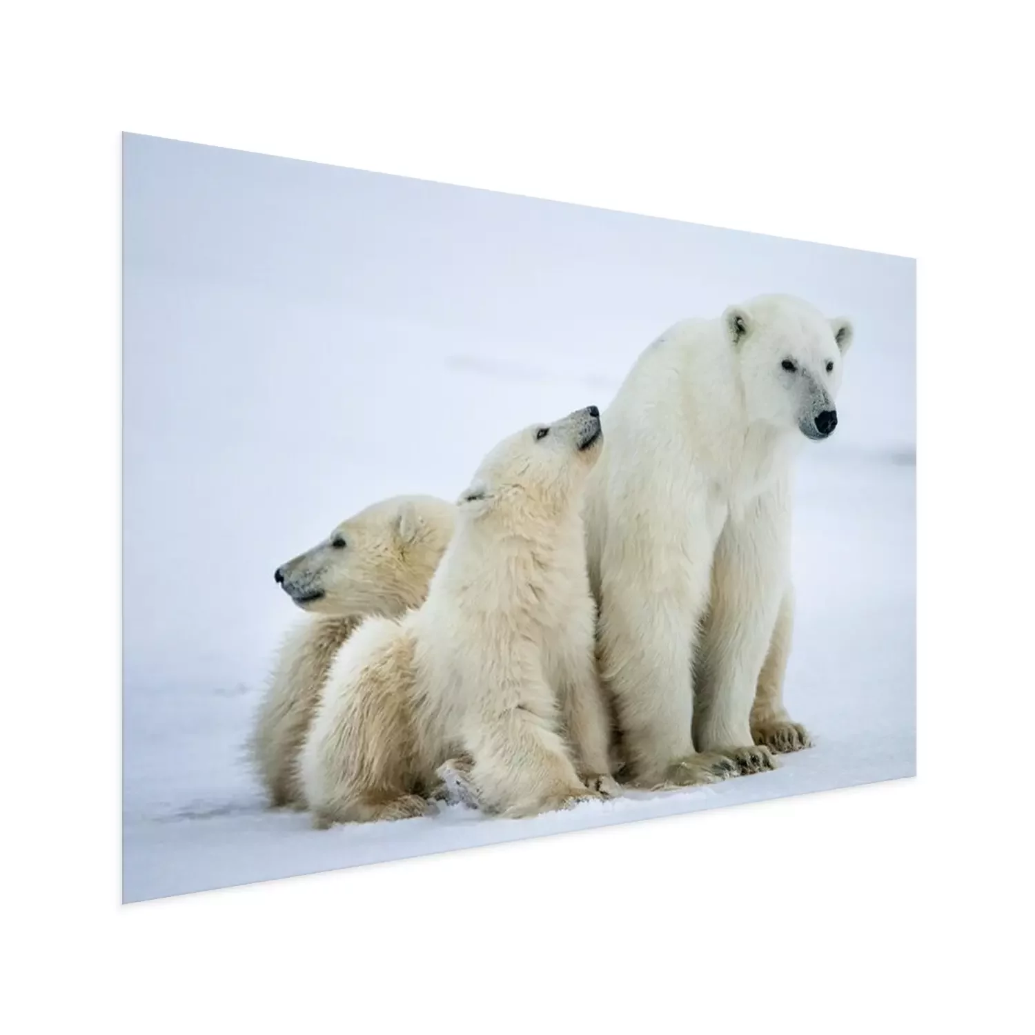 Poster: Polar she-beer met welpen. Een Polar berin met twee kleine beer welpen op de sneeuw.