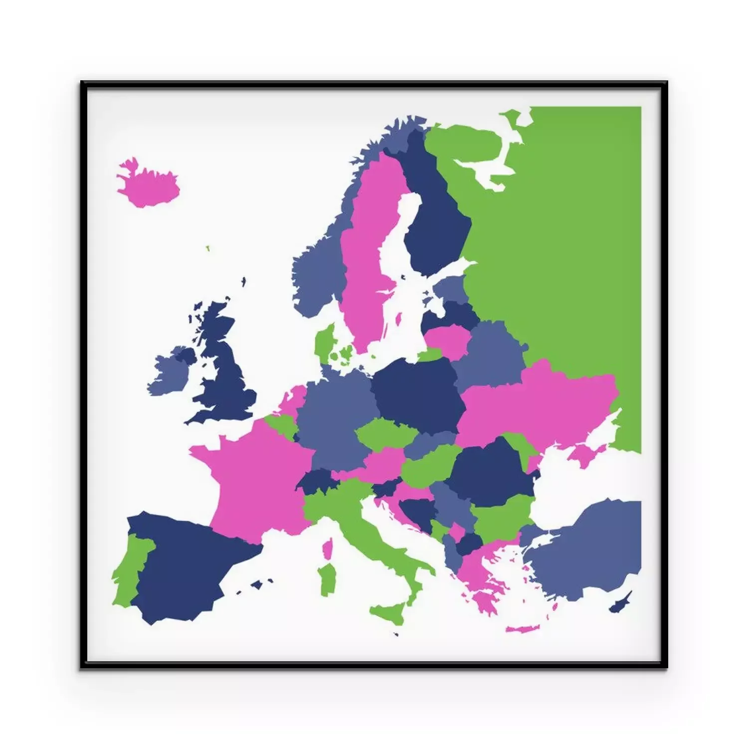 Poster: Politieke kaart van Europa continent in vier kleuren met witte land naamlabels en geïsoleerd op een witte achtergrond. Vector illustratie.