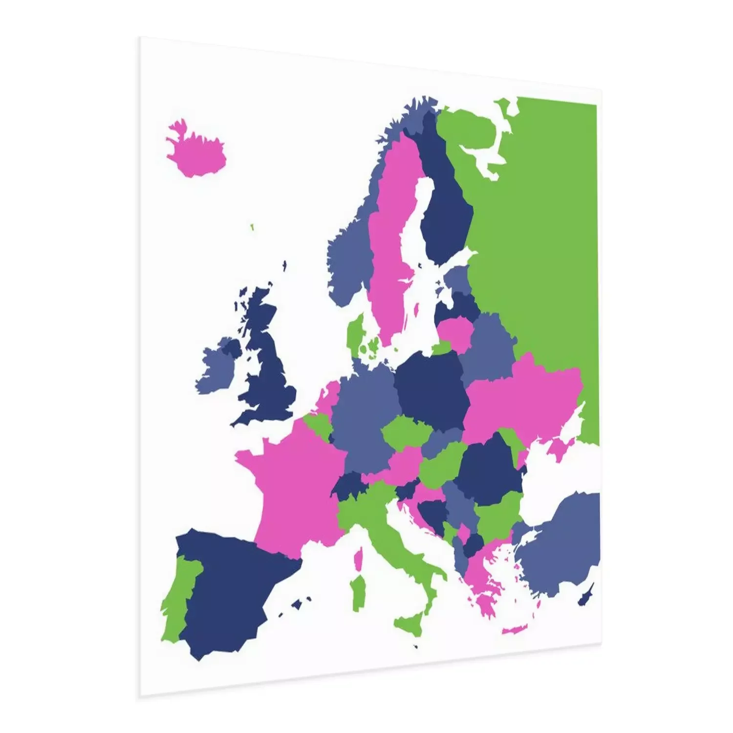 Poster Politieke kaart van Europa continent in vier kleuren met witte land naamlabels en geïsoleerd op een witte achtergrond. Vector illustratie.