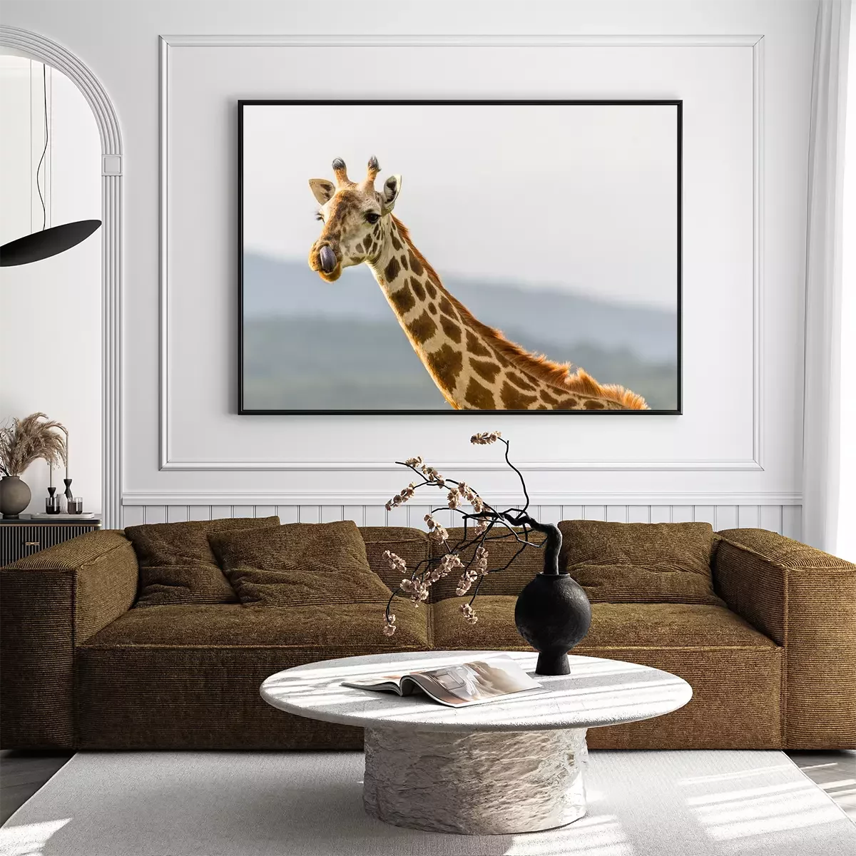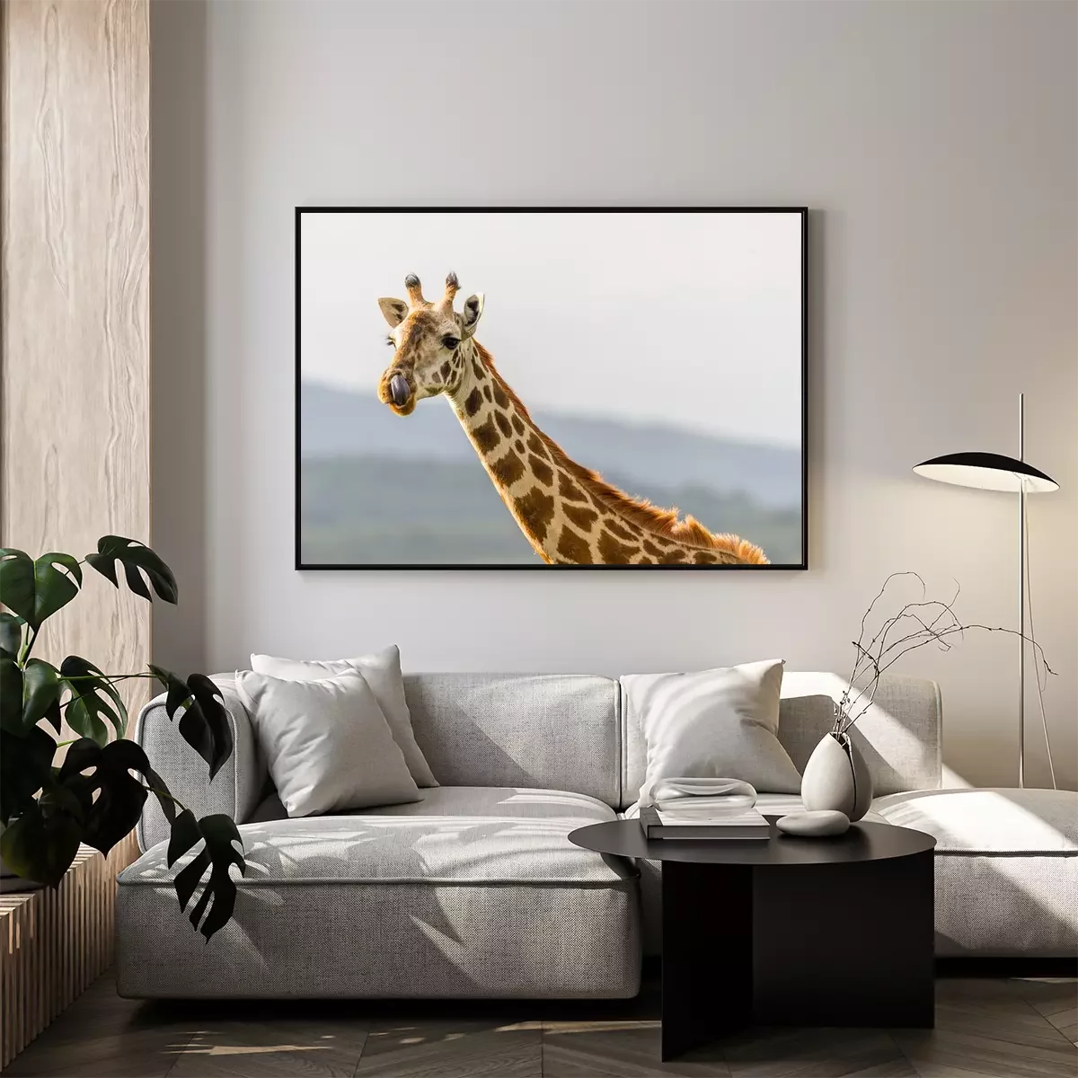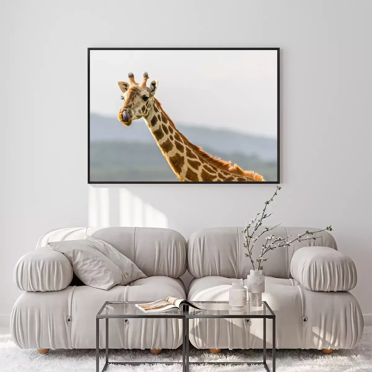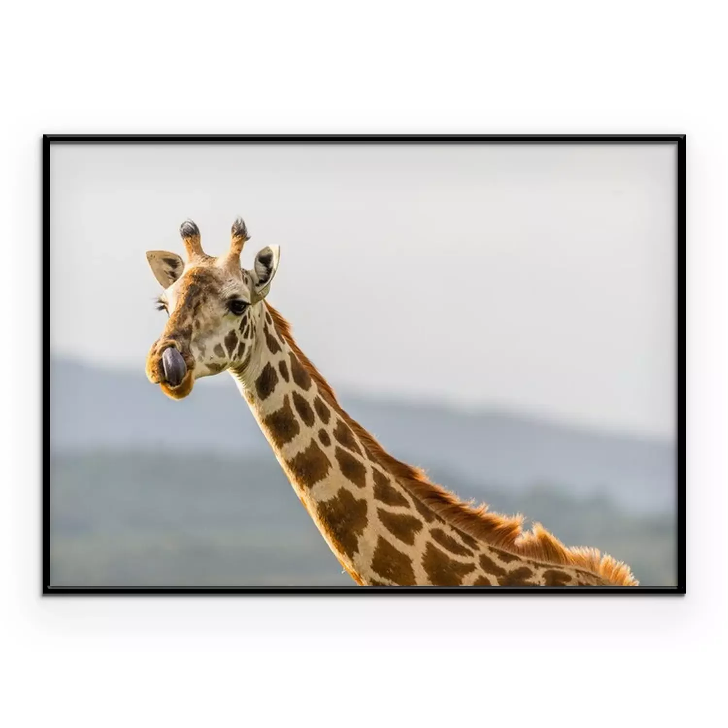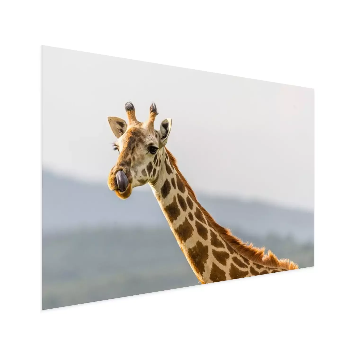 Poster: Portrait einer Giraffe sterven mit ihrer Zunge in der Nase hängt.