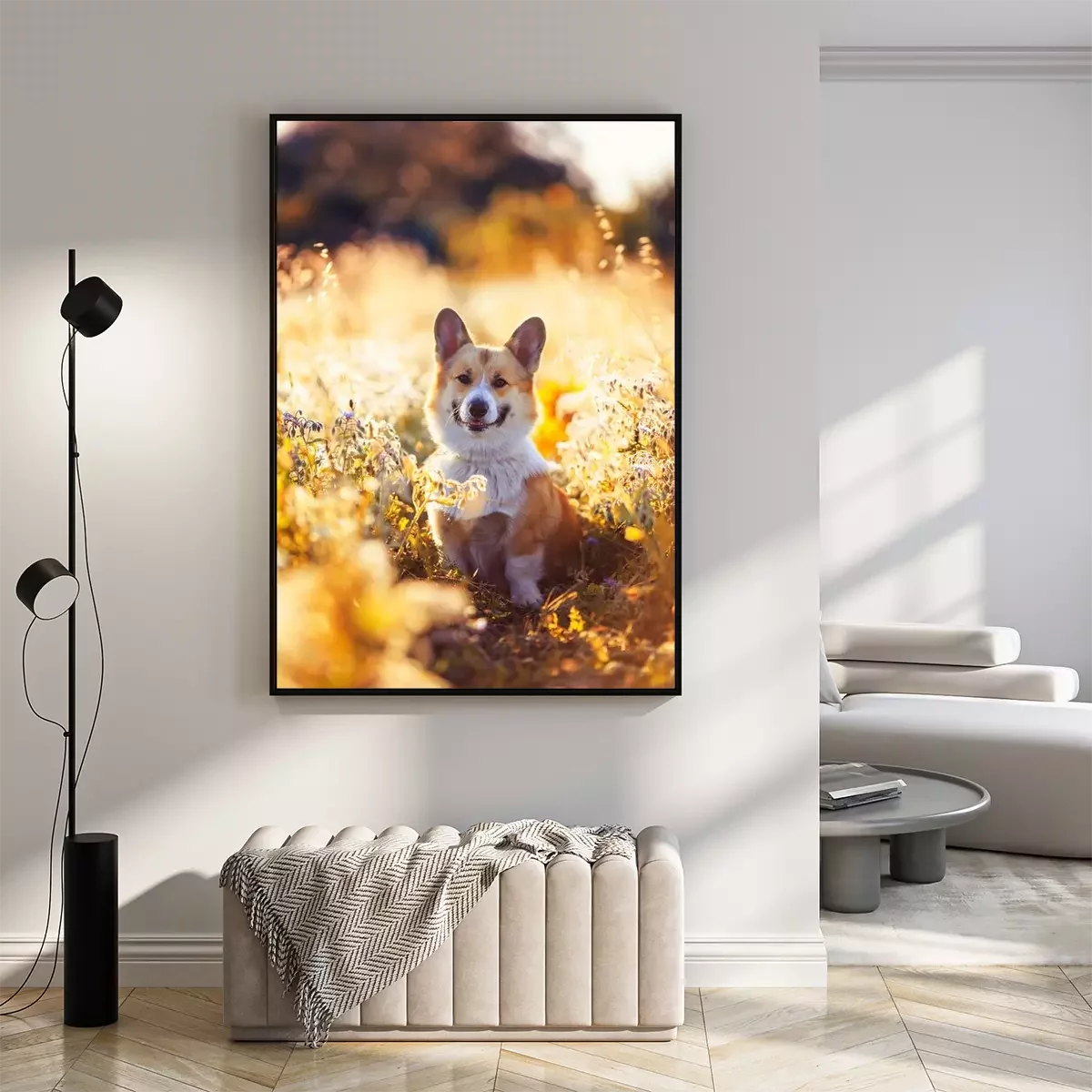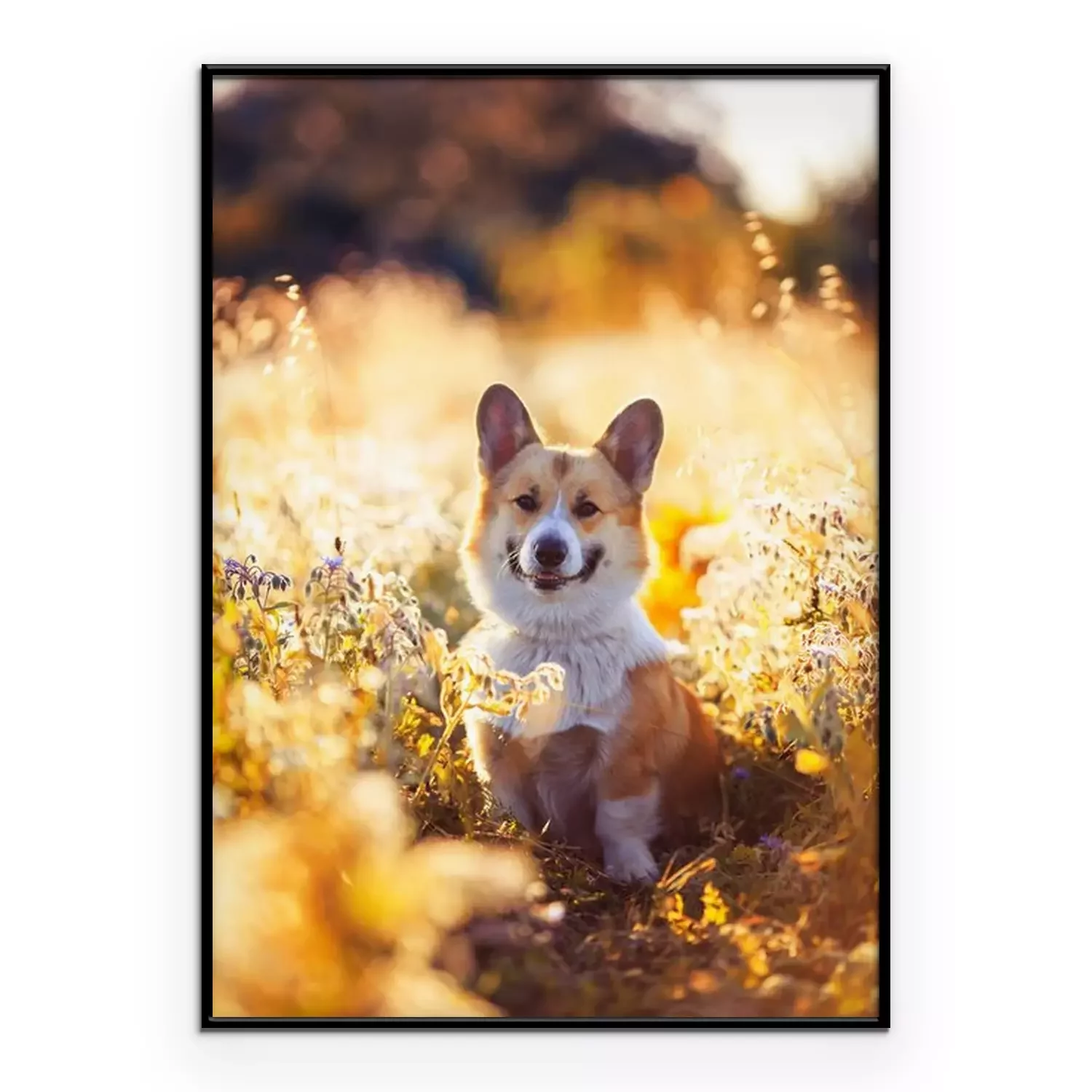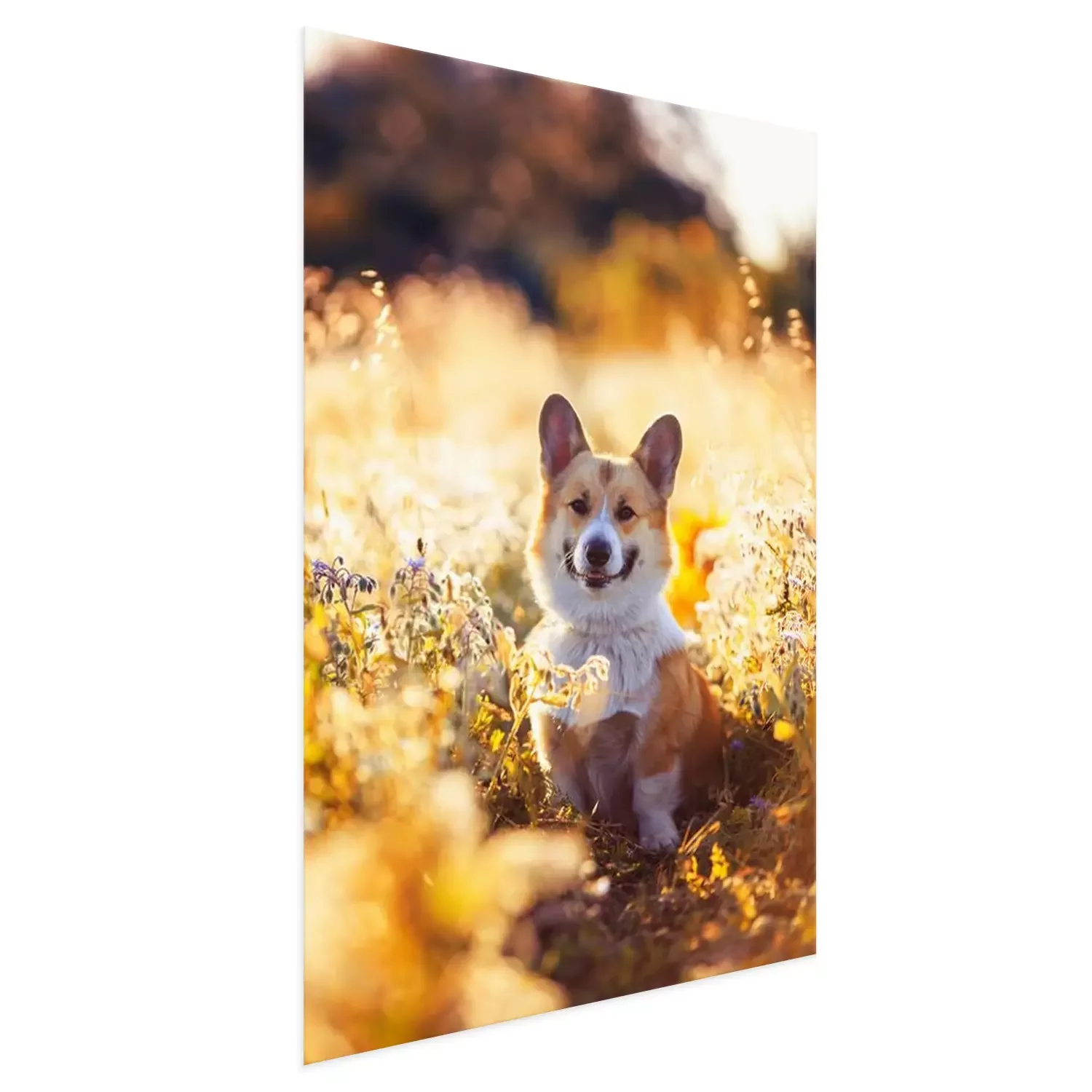 Poster: portrait funny cute puppy dog a red headed Corgi sits on a summer meadow and smiles contentedly against a background bathed in the Golden light of the setting sun flowers and grass