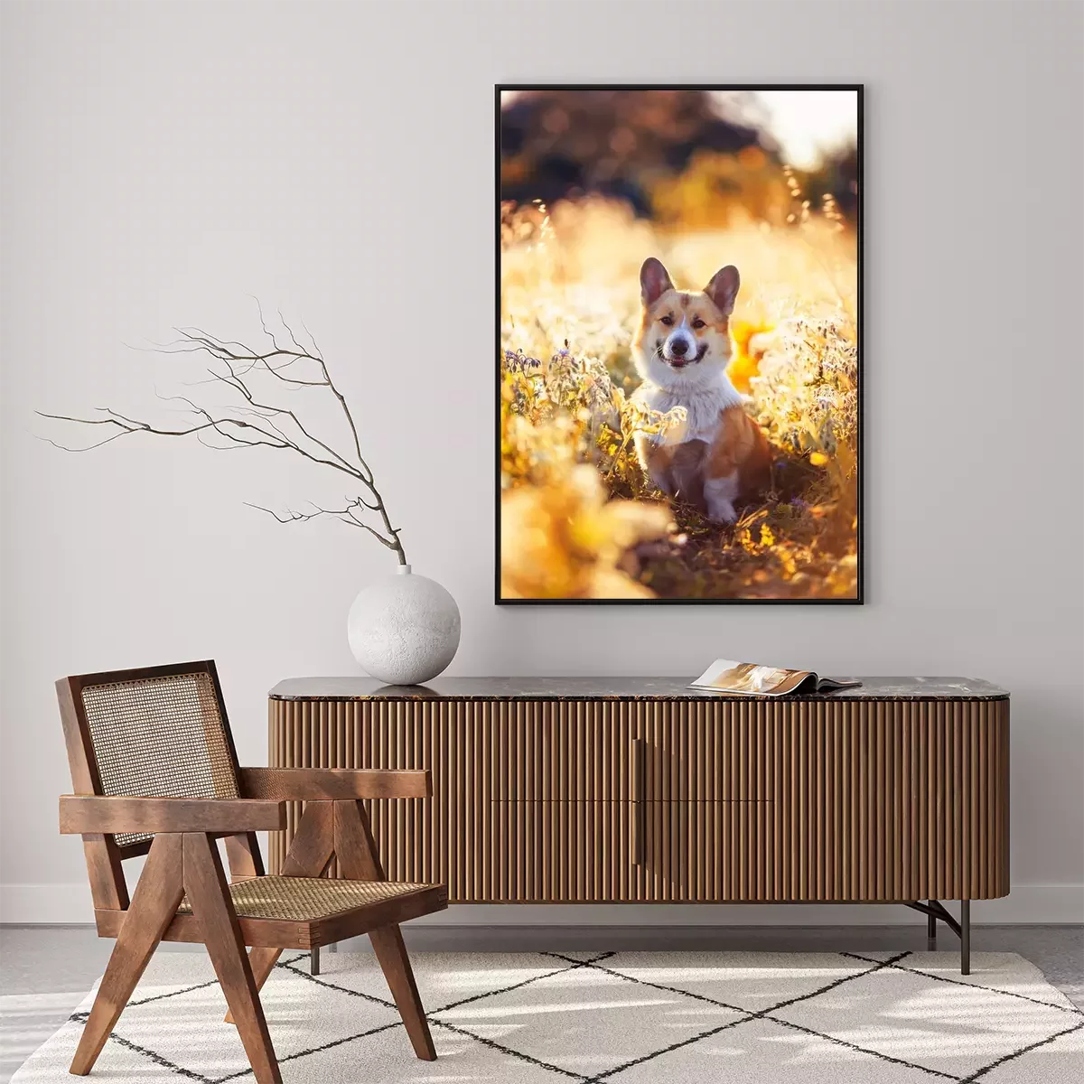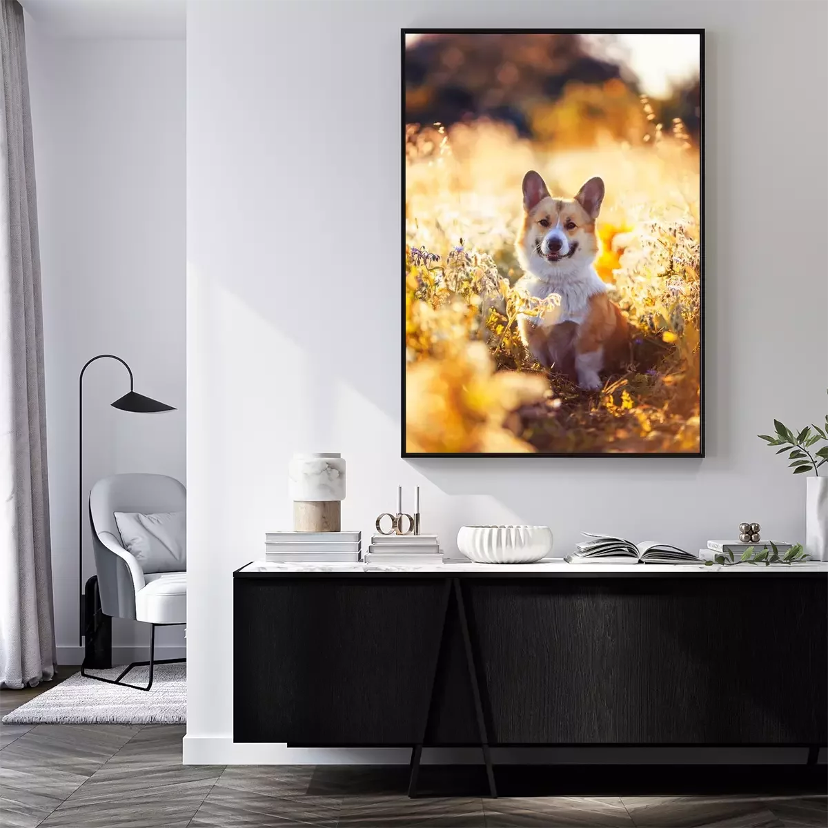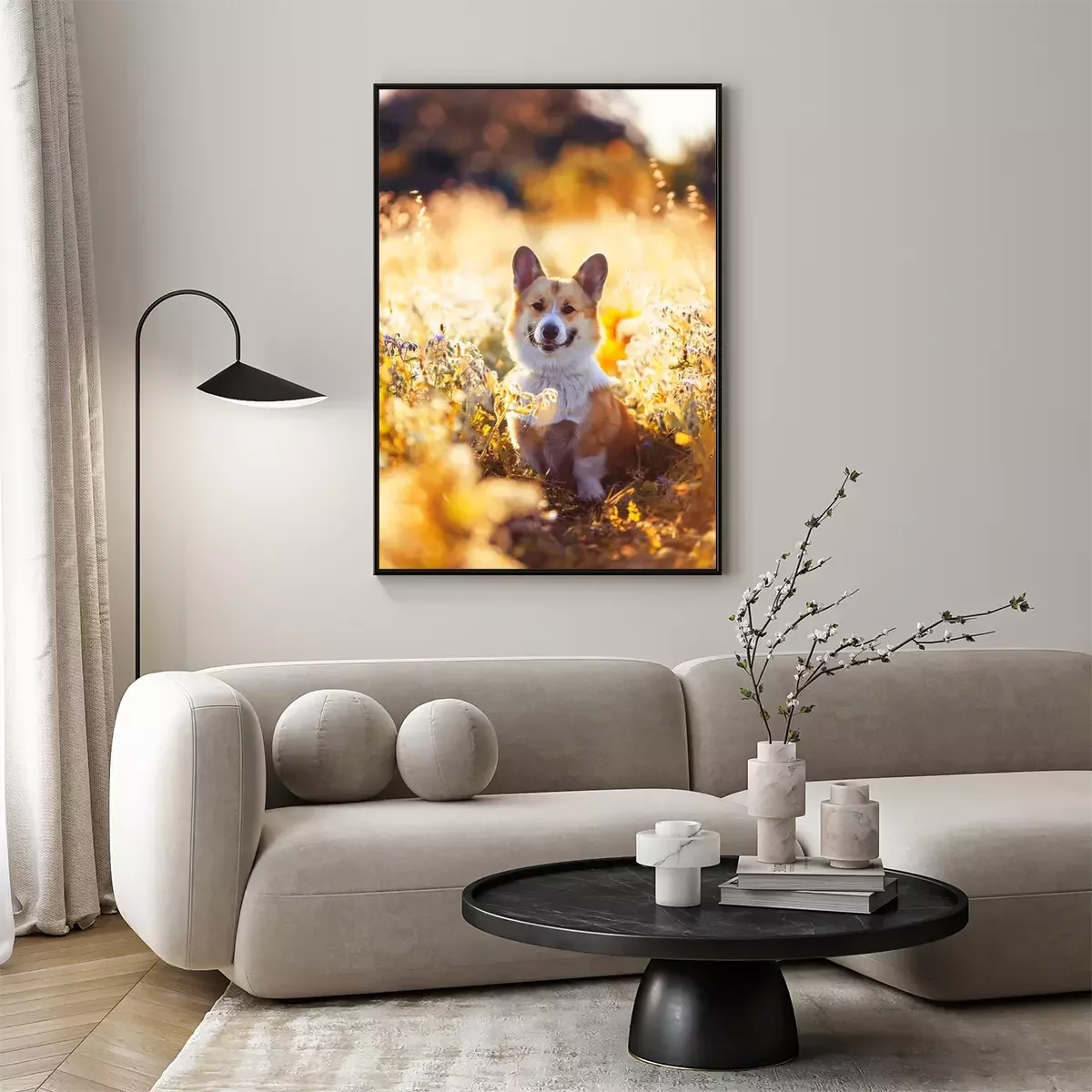 Poster: portrait funny cute puppy dog a red headed Corgi sits on a summer meadow and smiles contentedly against a background bathed in the Golden light of the setting sun flowers and grass