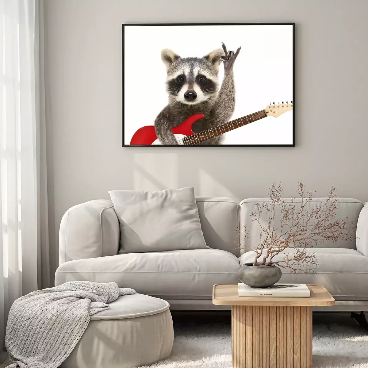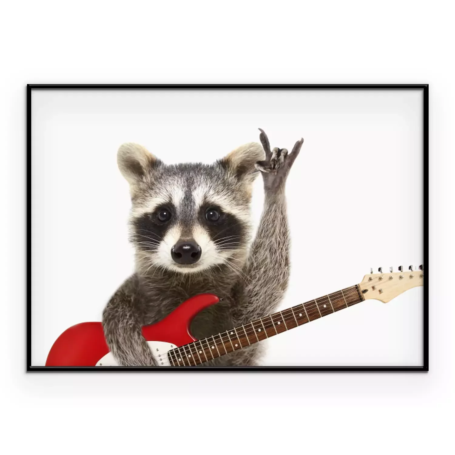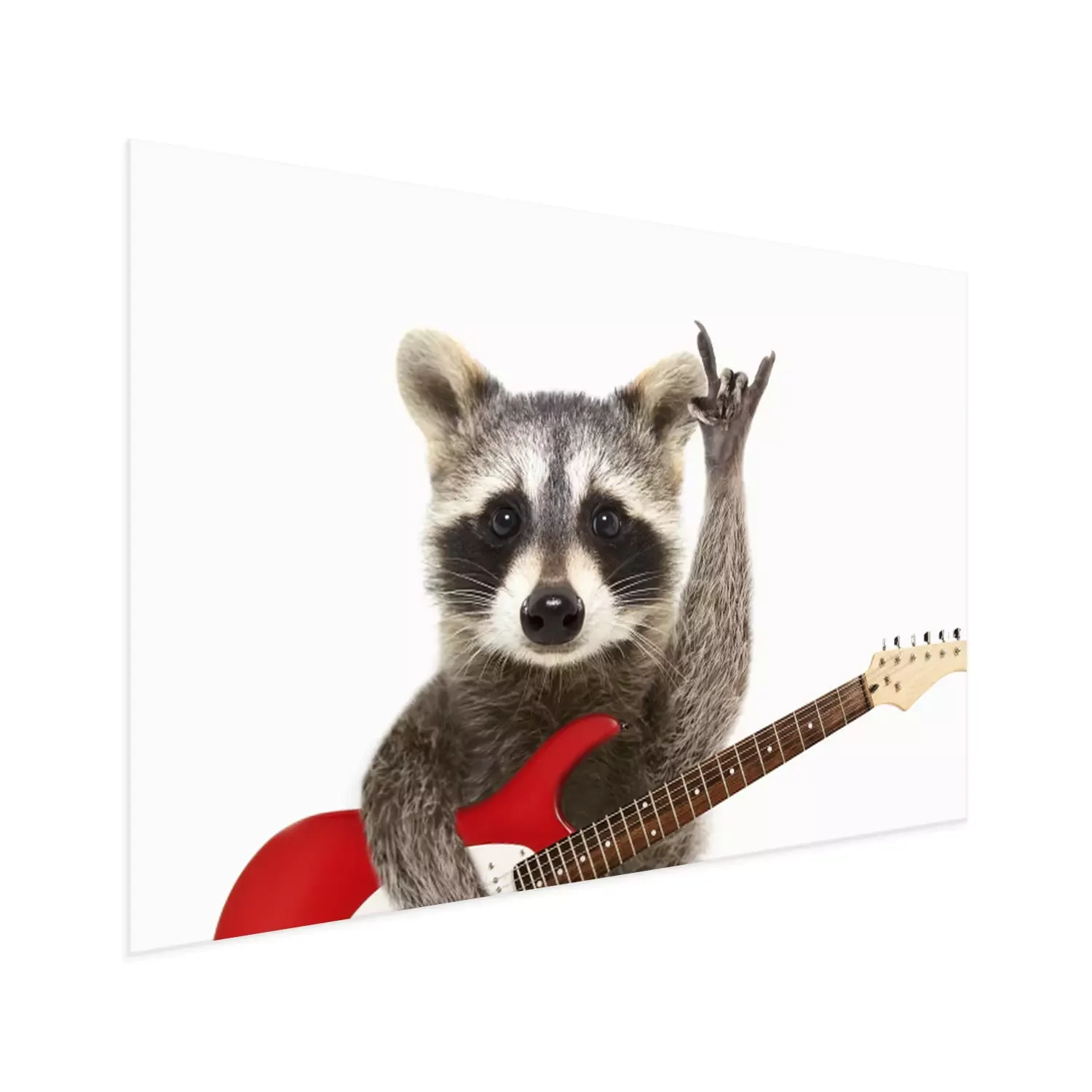 Poster: Portret van een grappige wasbeer met elektrische gitaar, die een rotsgebaar toont, dat op witte achtergrond wordt geïsoleerd