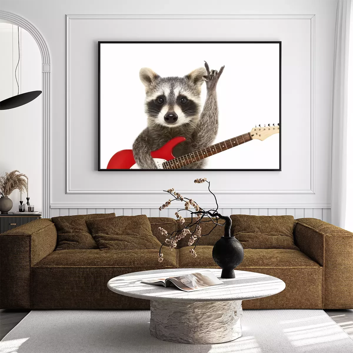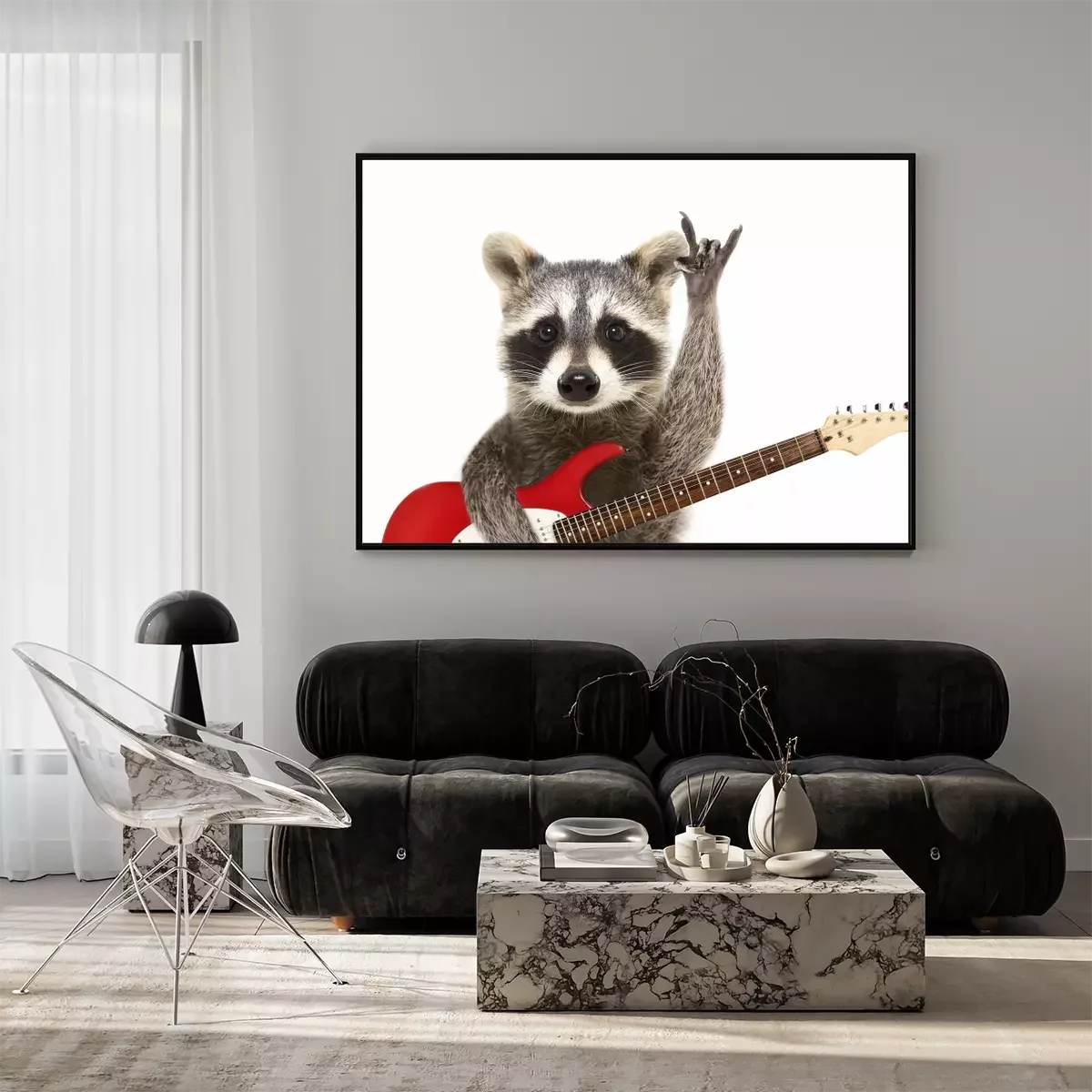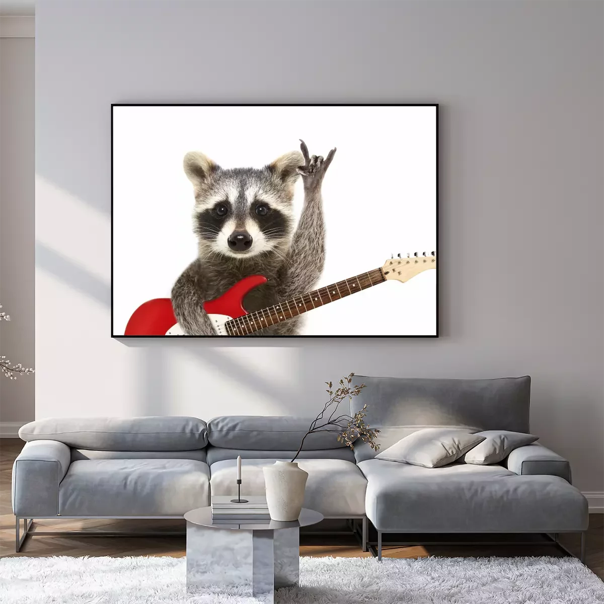Poster: Portret van een grappige wasbeer met elektrische gitaar, die een rotsgebaar toont, dat op witte achtergrond wordt geïsoleerd