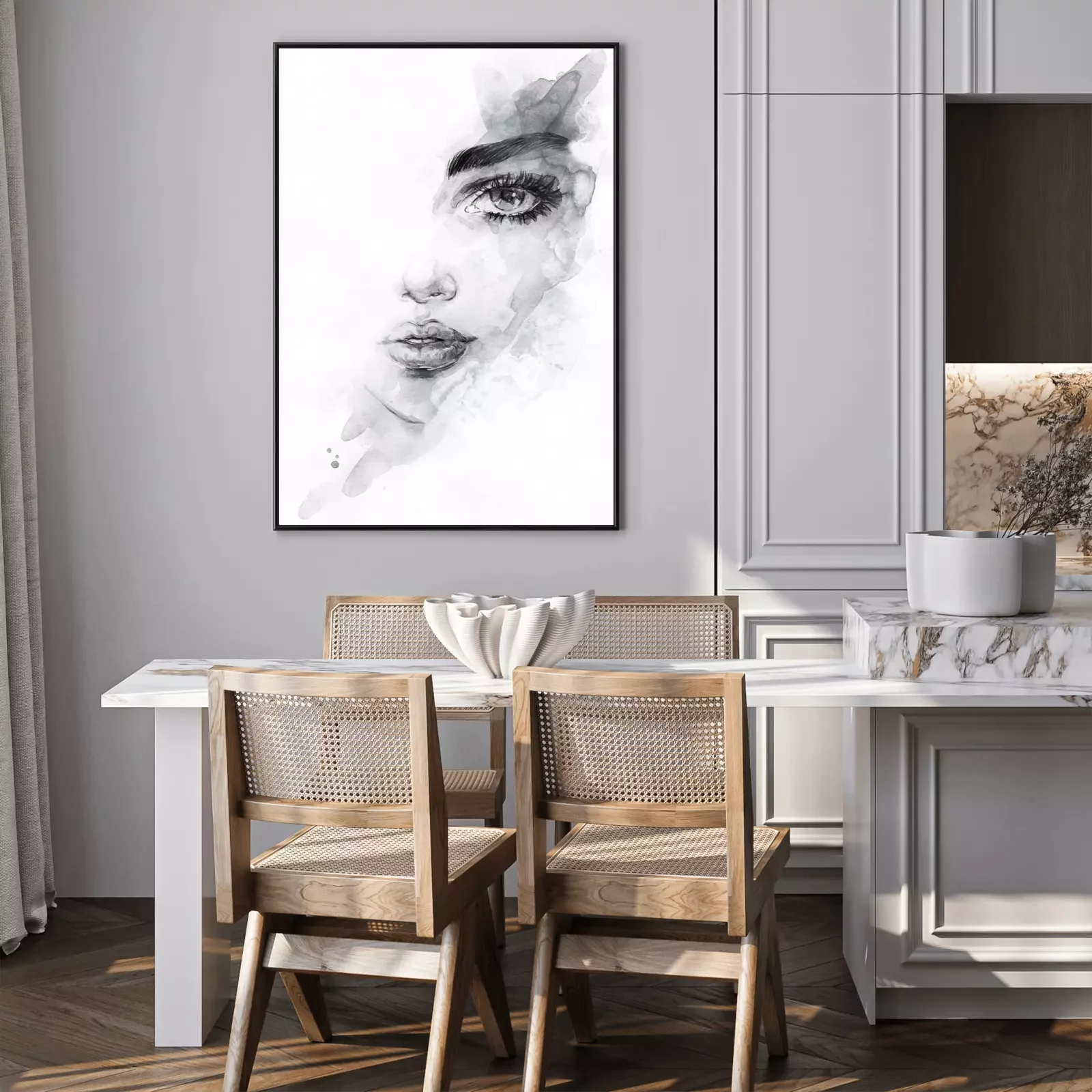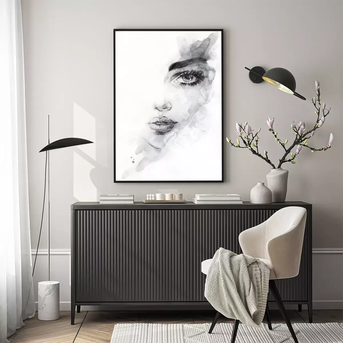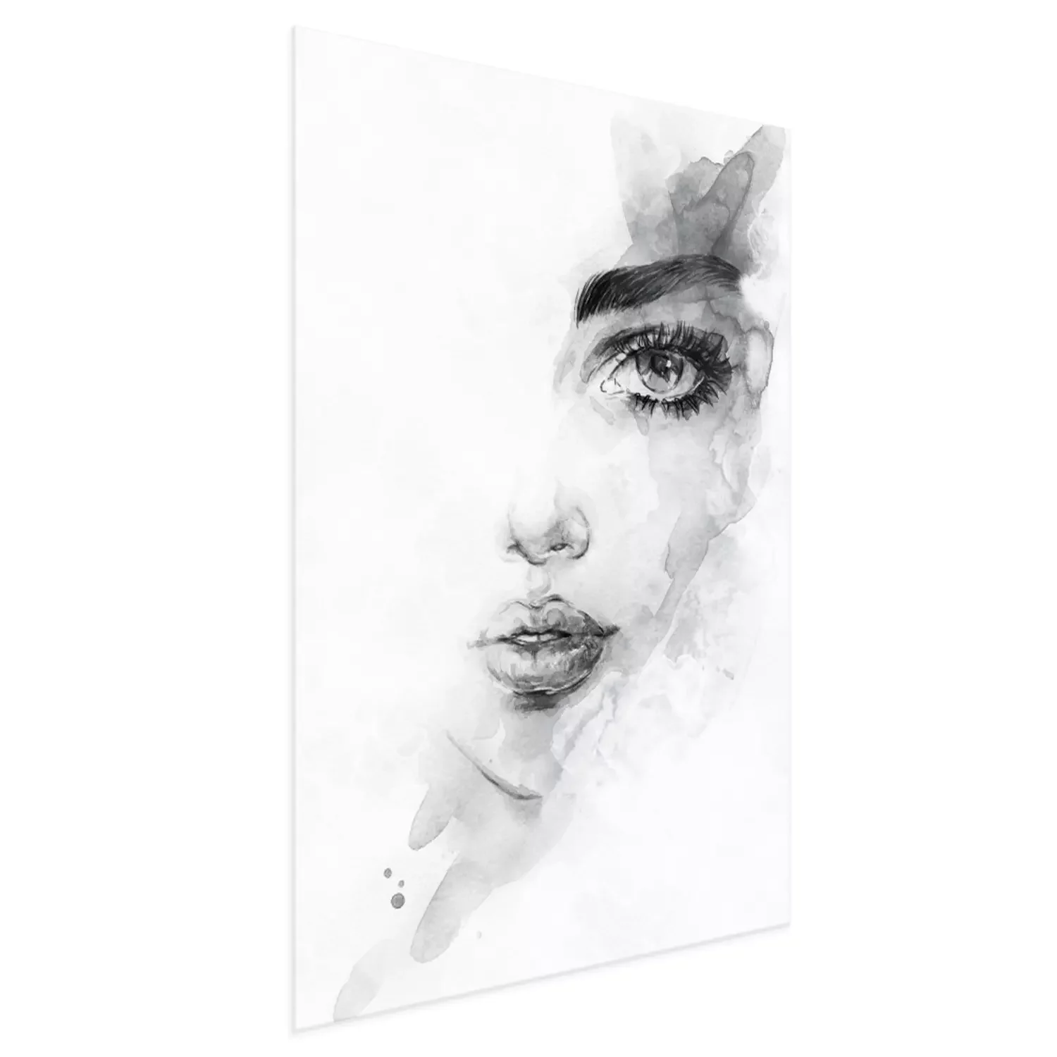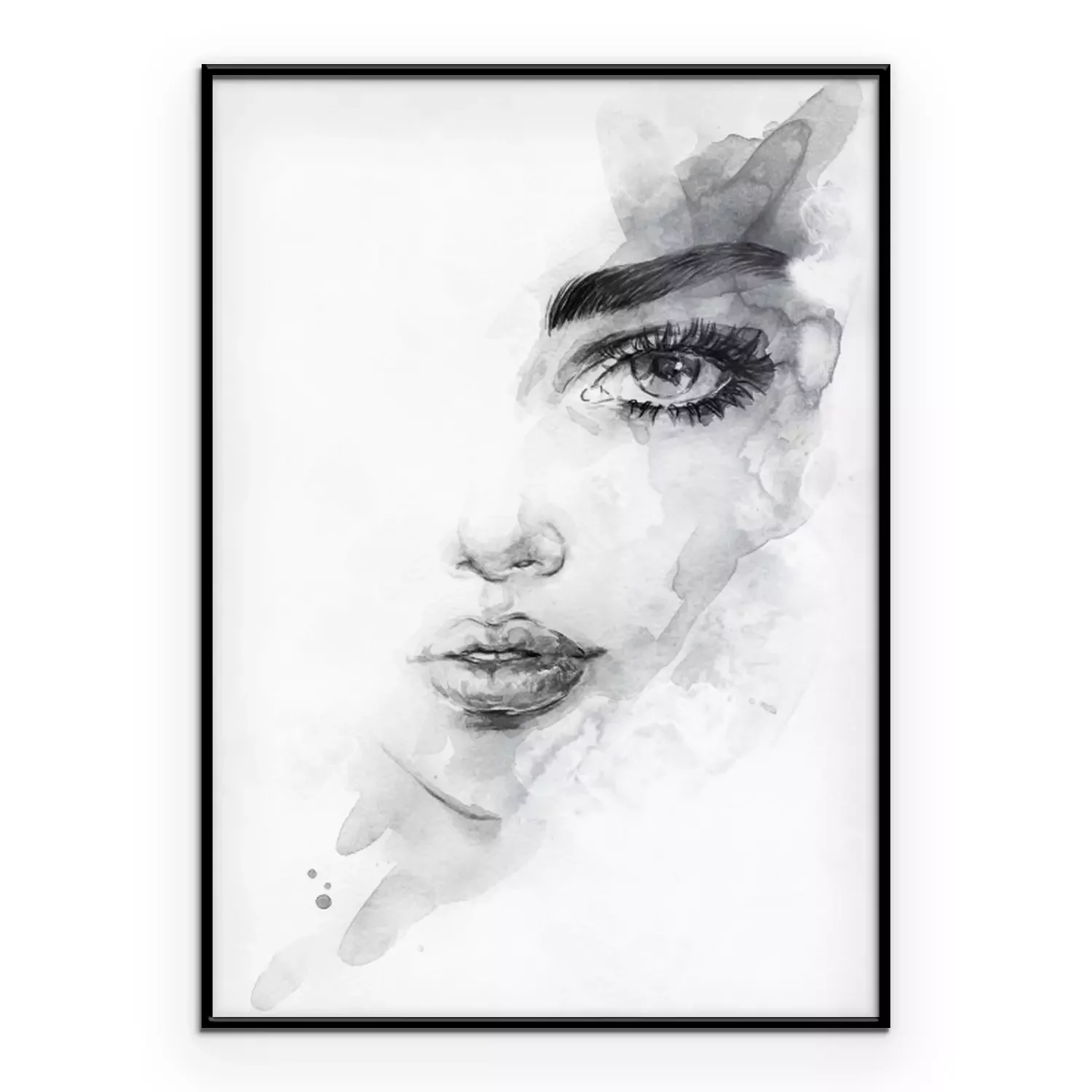 Vrouw gezicht en zwarte aquarel verf spatten