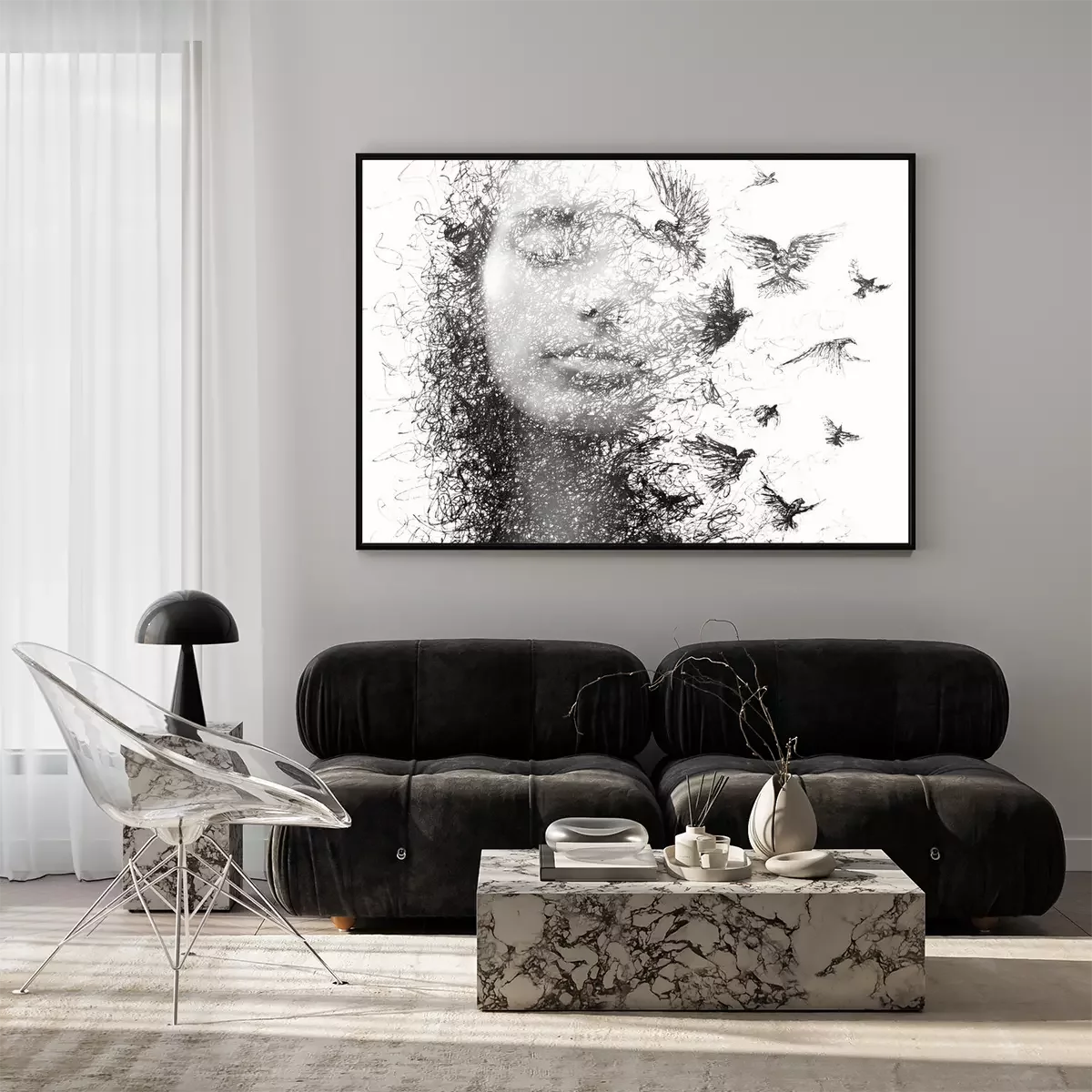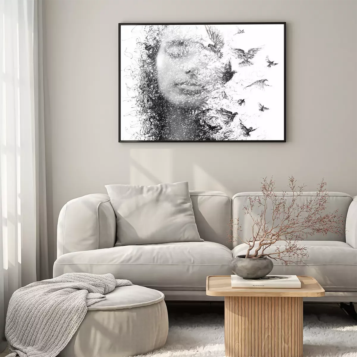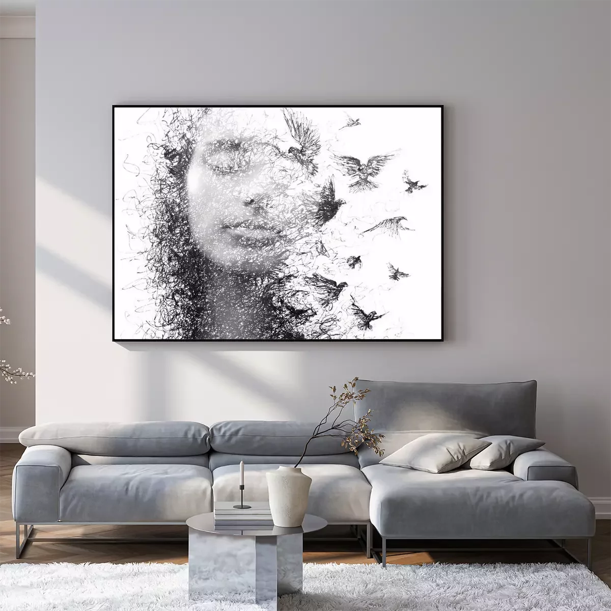 Poster Portret van een vrouw met gesloten ogen en een zwerm vliegende vogels