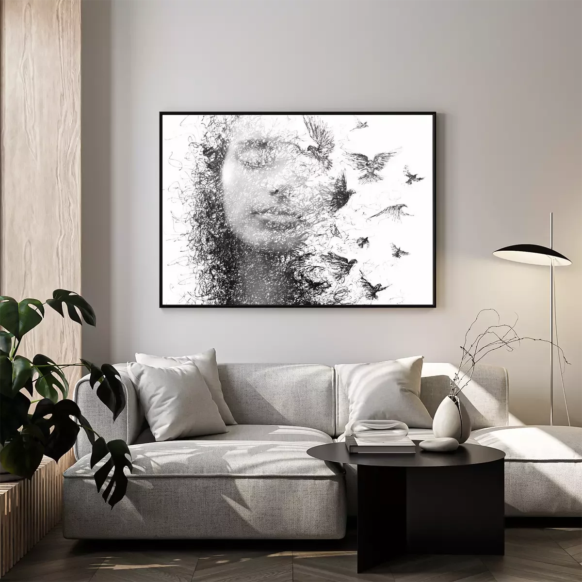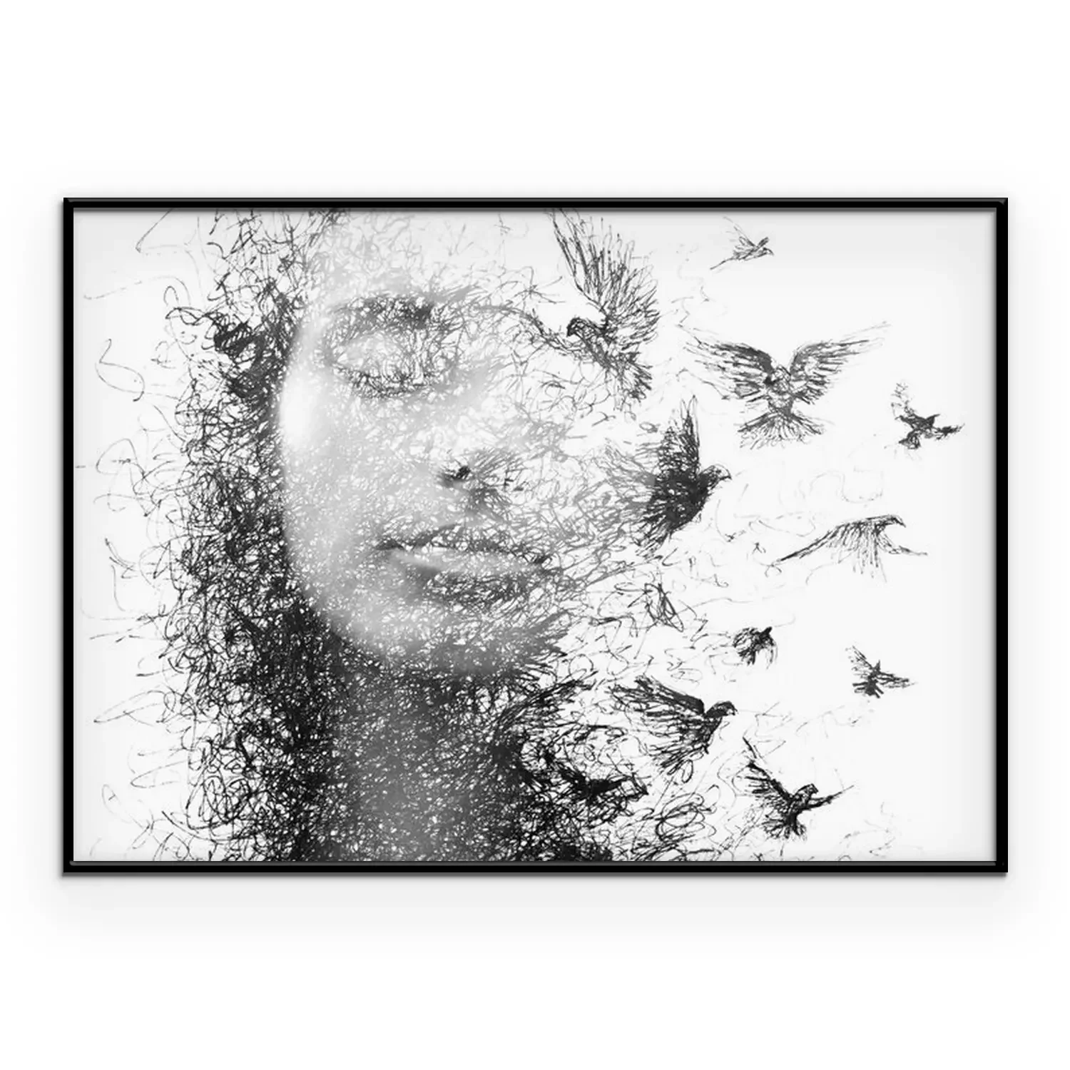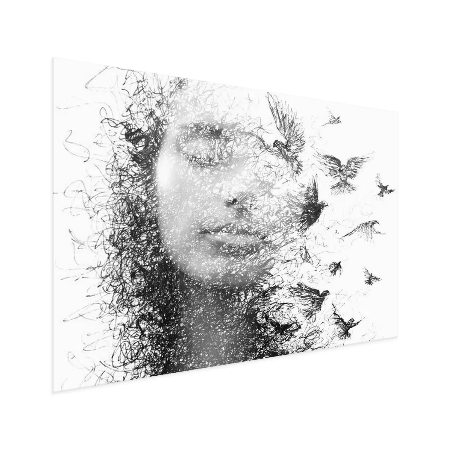 Poster: Portret van een vrouw met gesloten ogen en een zwerm vliegende vogels