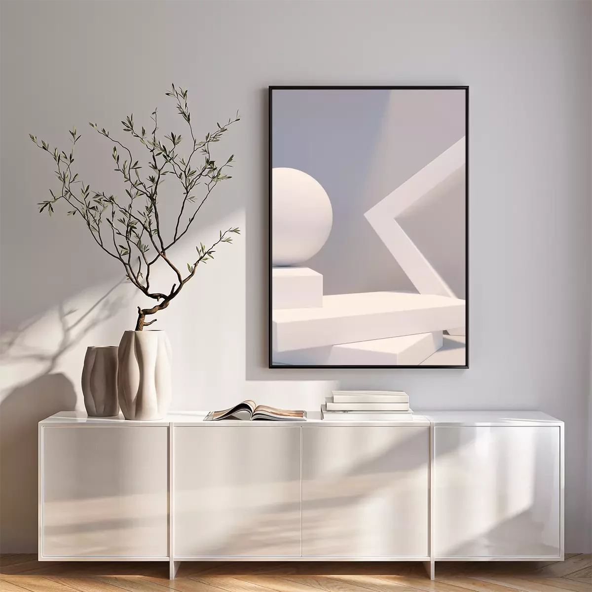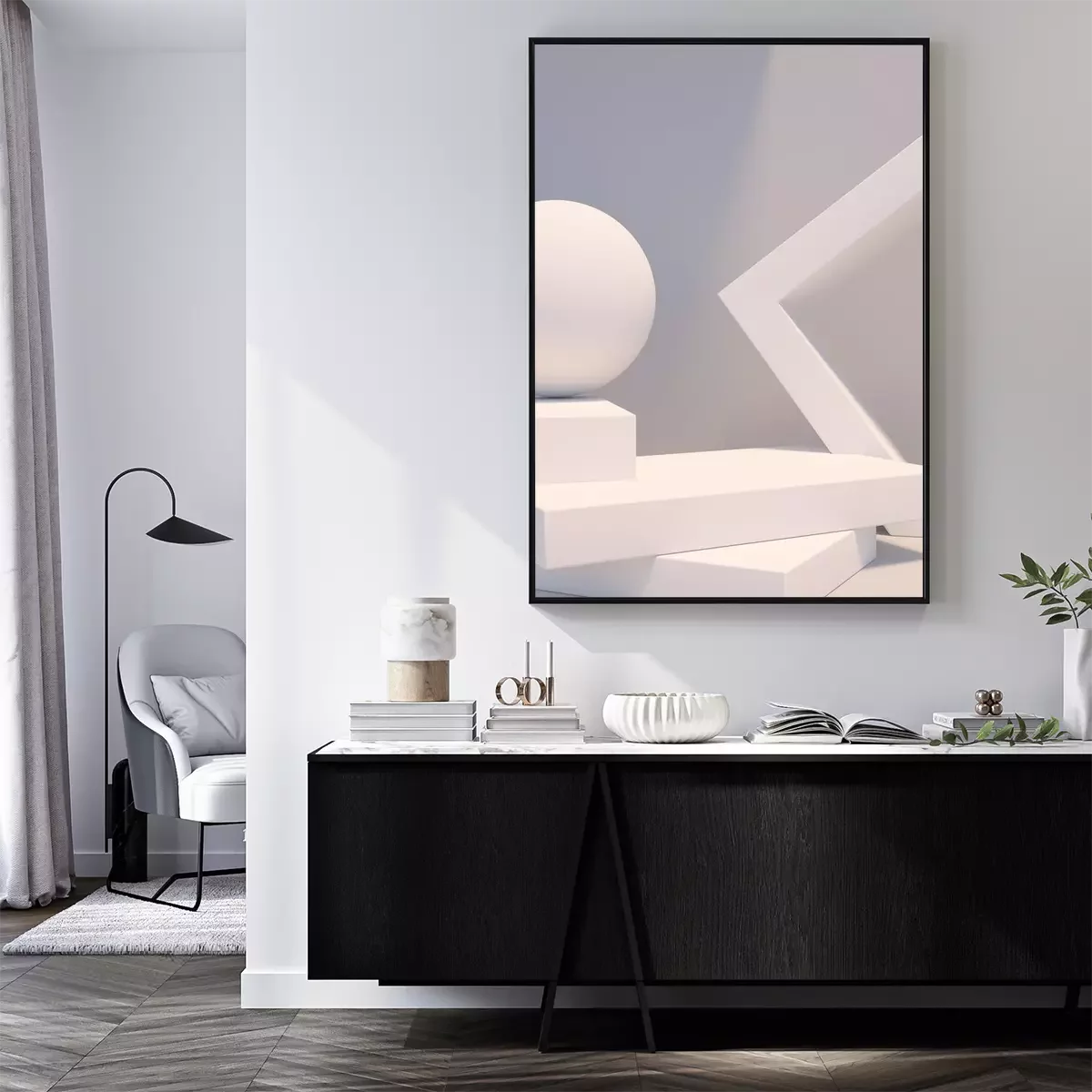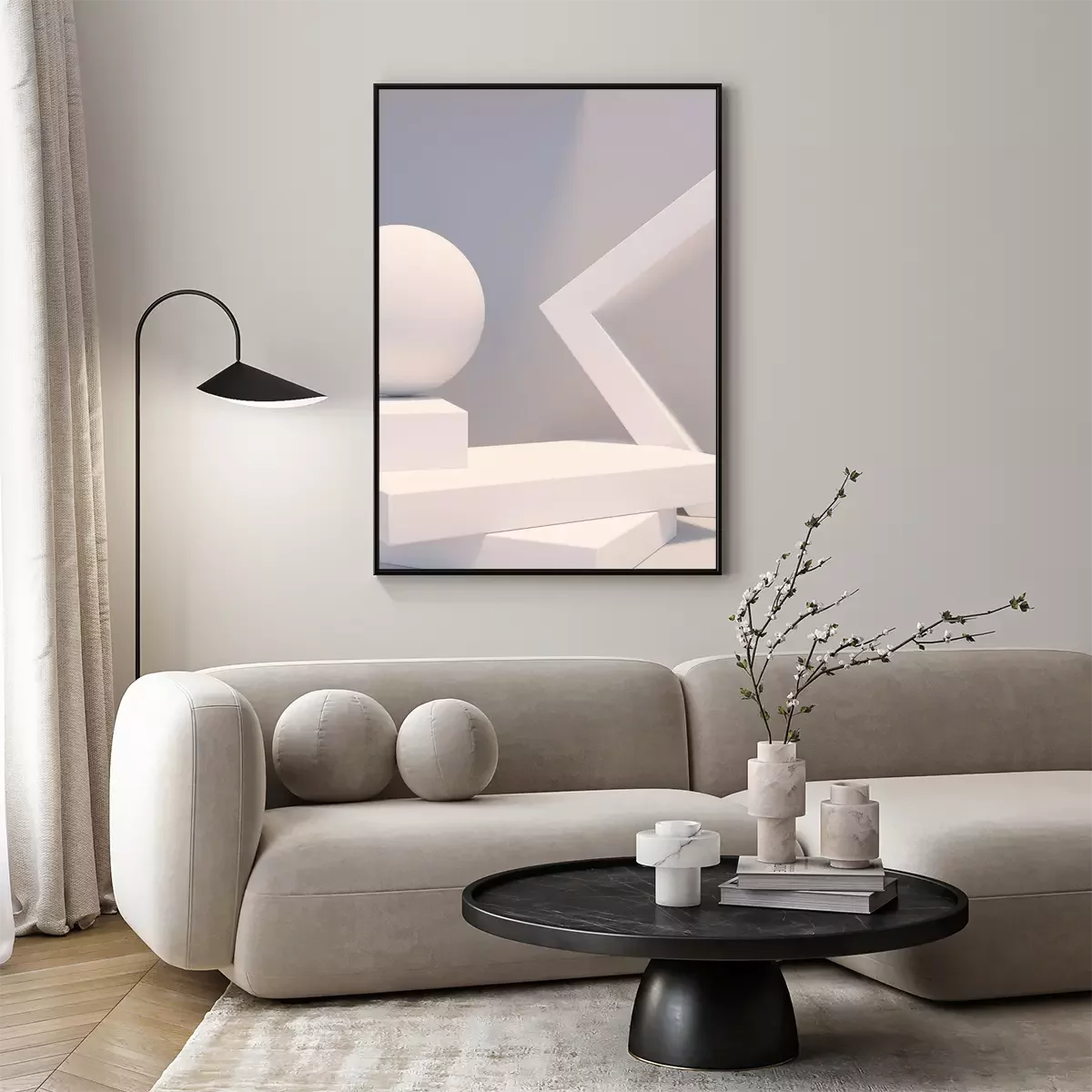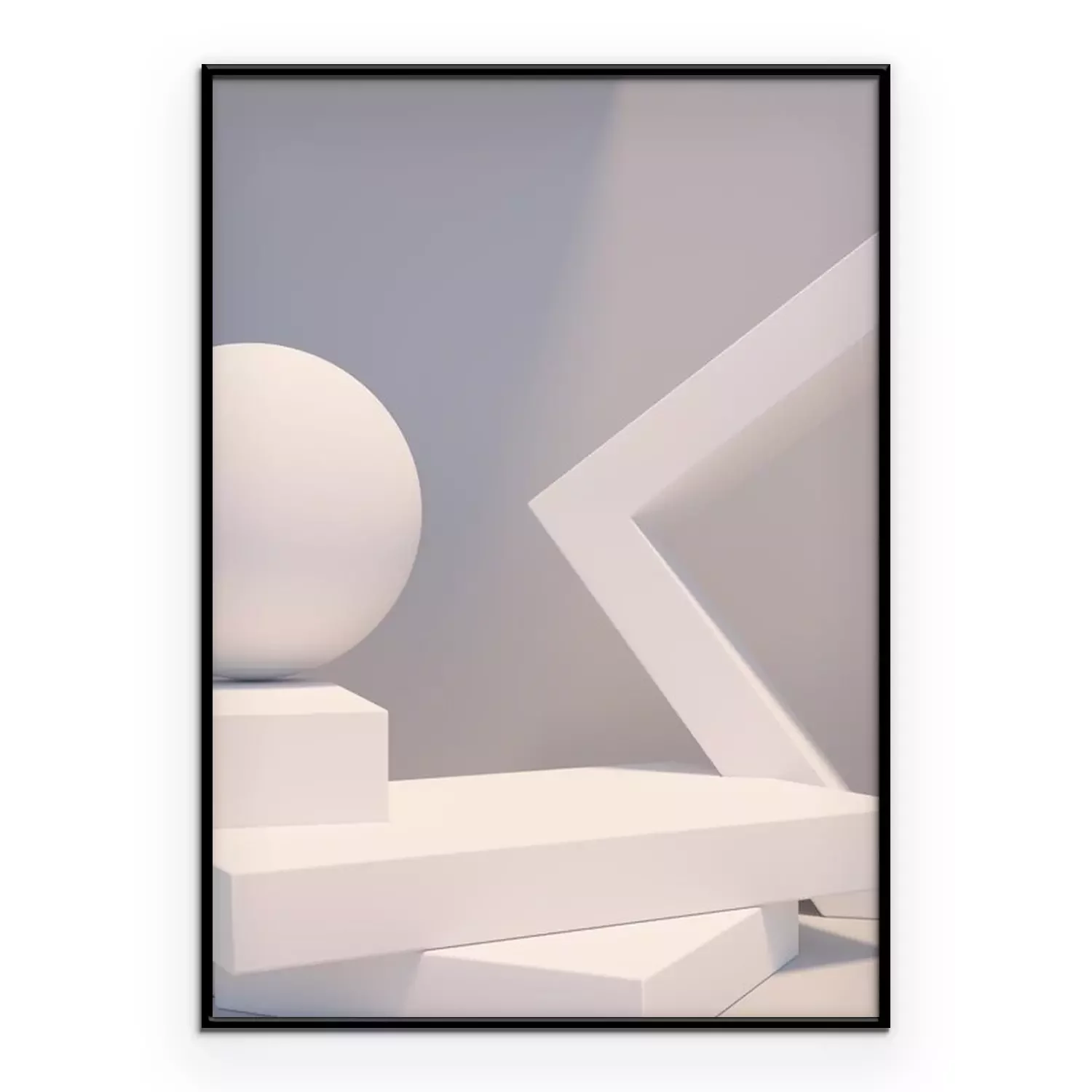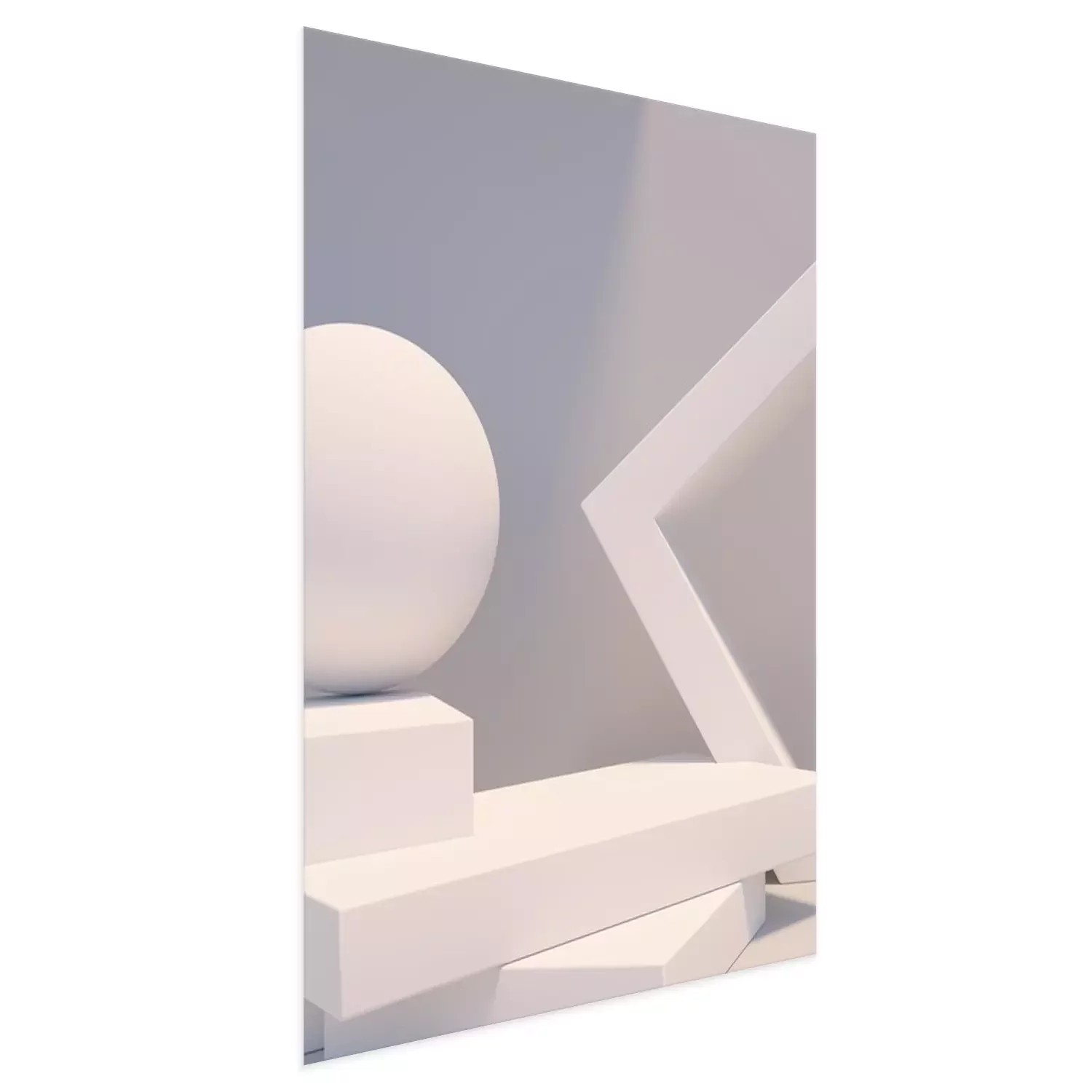 Poster: Product setting podium white abstract minimalistic geometry, minimal light interior, object placement, abstract gray background room, 3d rendering,