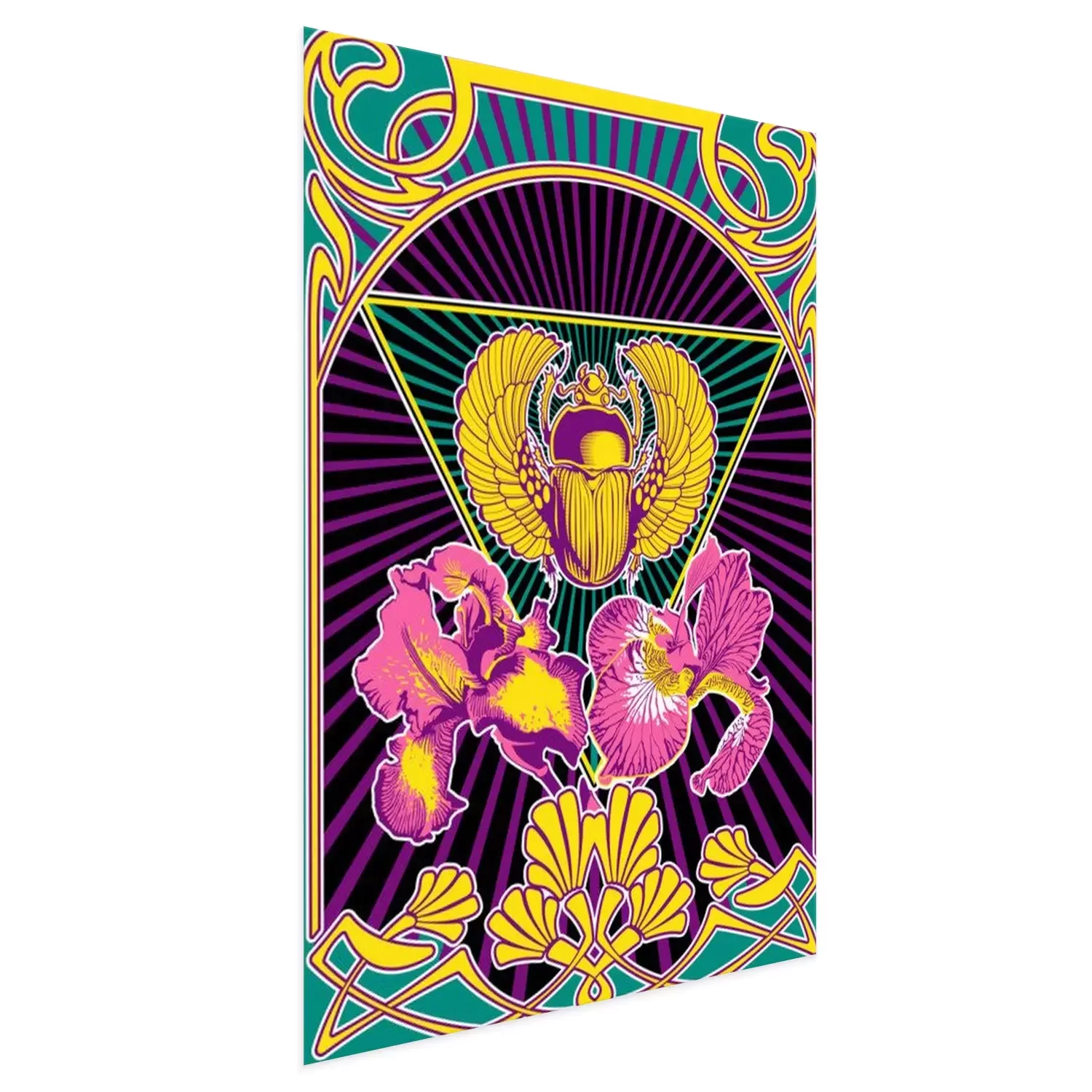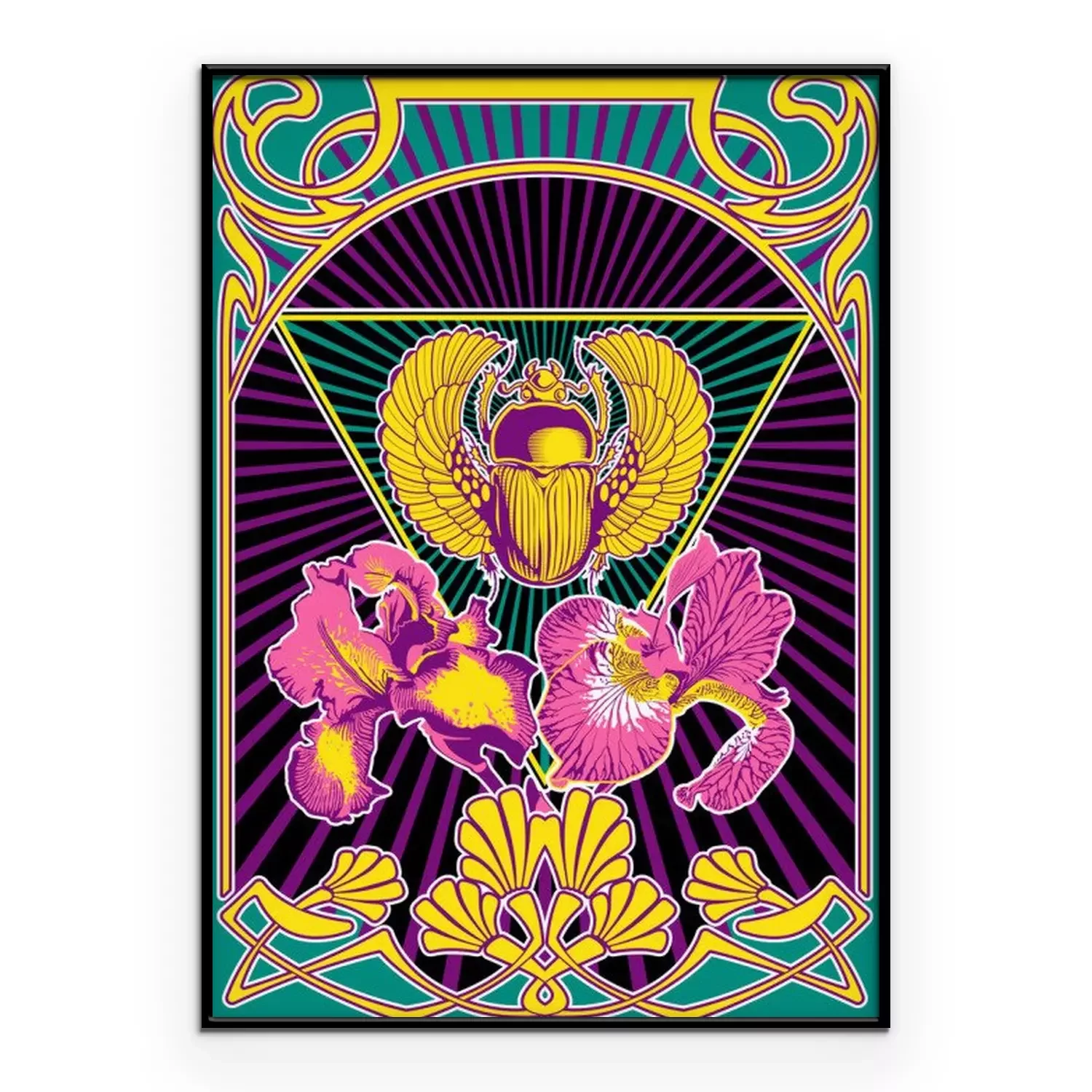 Poster: Psychedelic Art Style Poster, Egyptian Scarab and Iris Flowers, Art Nouveau Frame, Psychedelic Color Combination, 1960s Hippie Music Album Covers Stylization