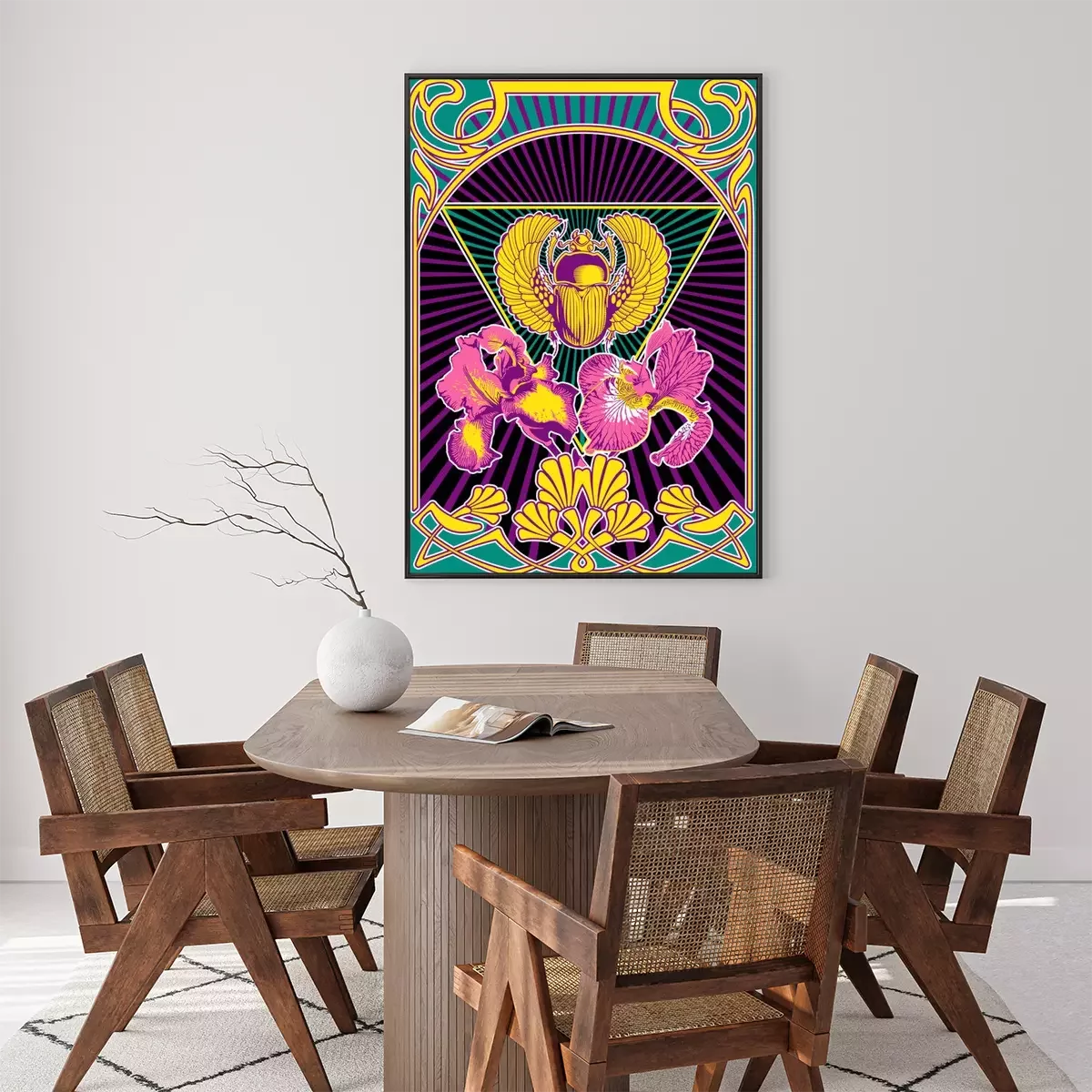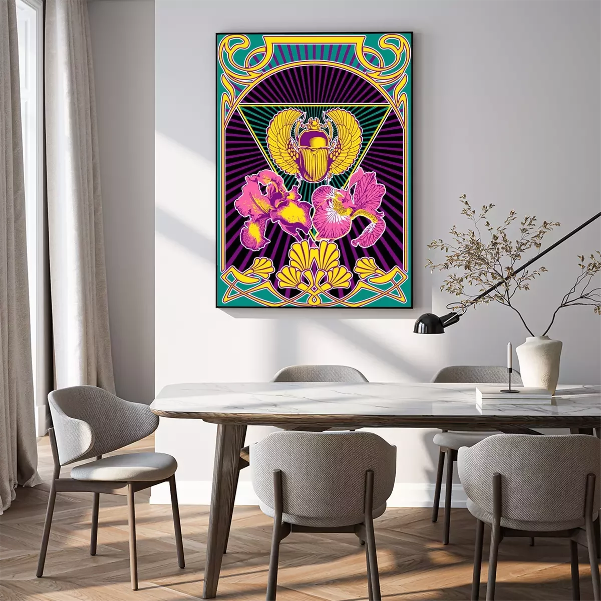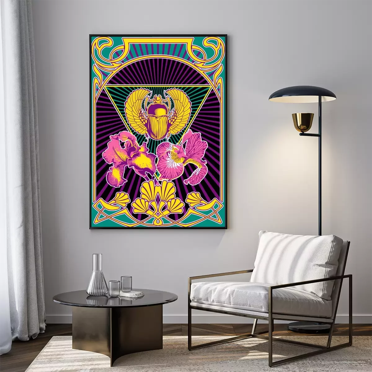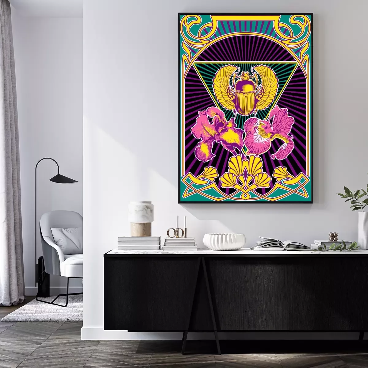 Poster Psychedelic Art Style Poster, Egyptian Scarab and Iris Flowers, Art Nouveau Frame, Psychedelic Color Combination, 1960s Hippie Music Album Covers Stylization