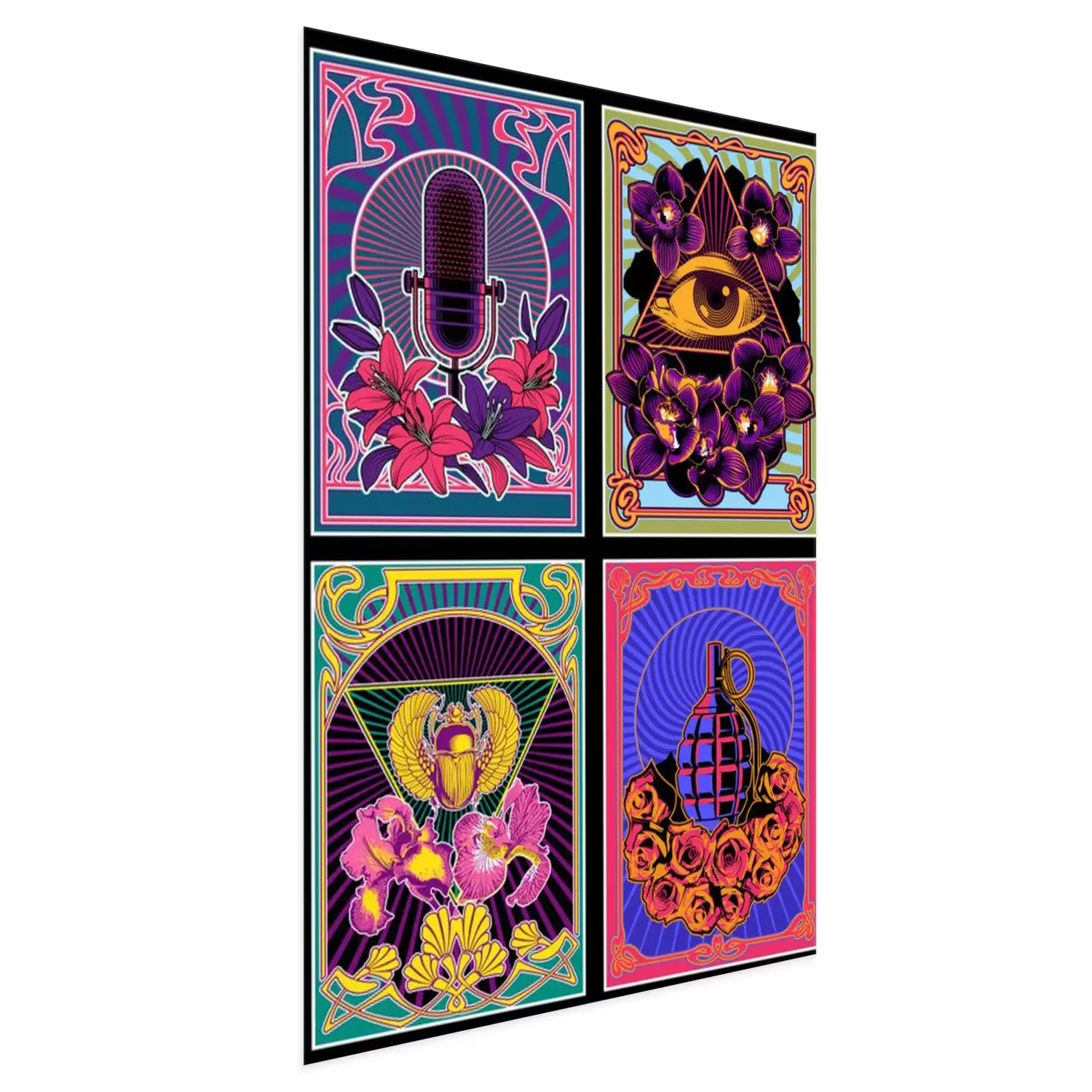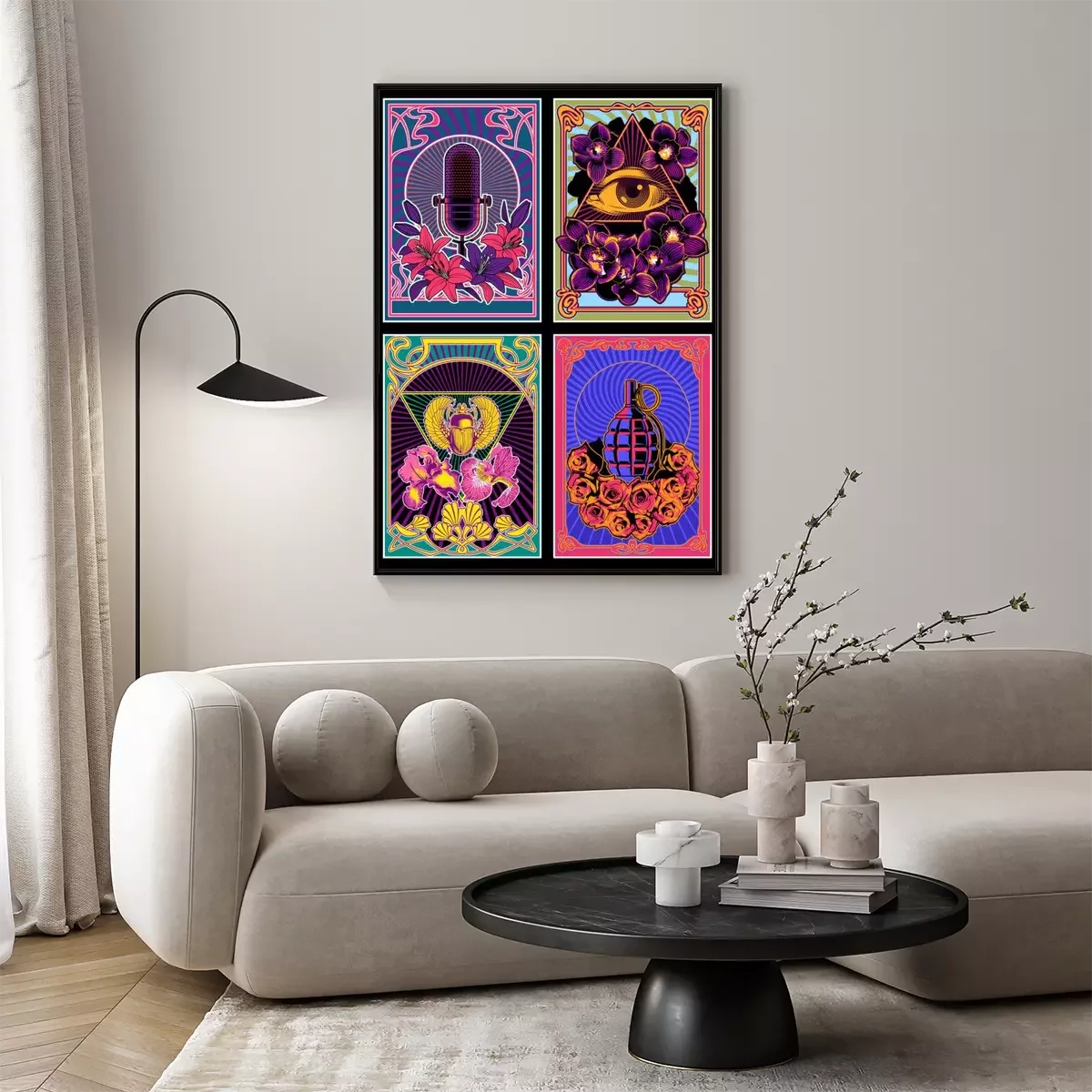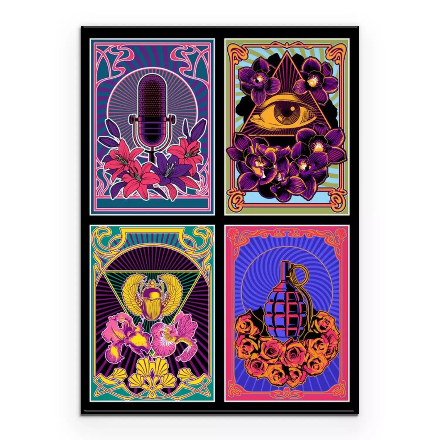 Poster Psychedelic Posters 1960s Hippie Art Style, Microphone, Eye in Triangle, Egyptian Scarab, Grenade, Flowers Psychedelic Colors, Art Nouveau Frames