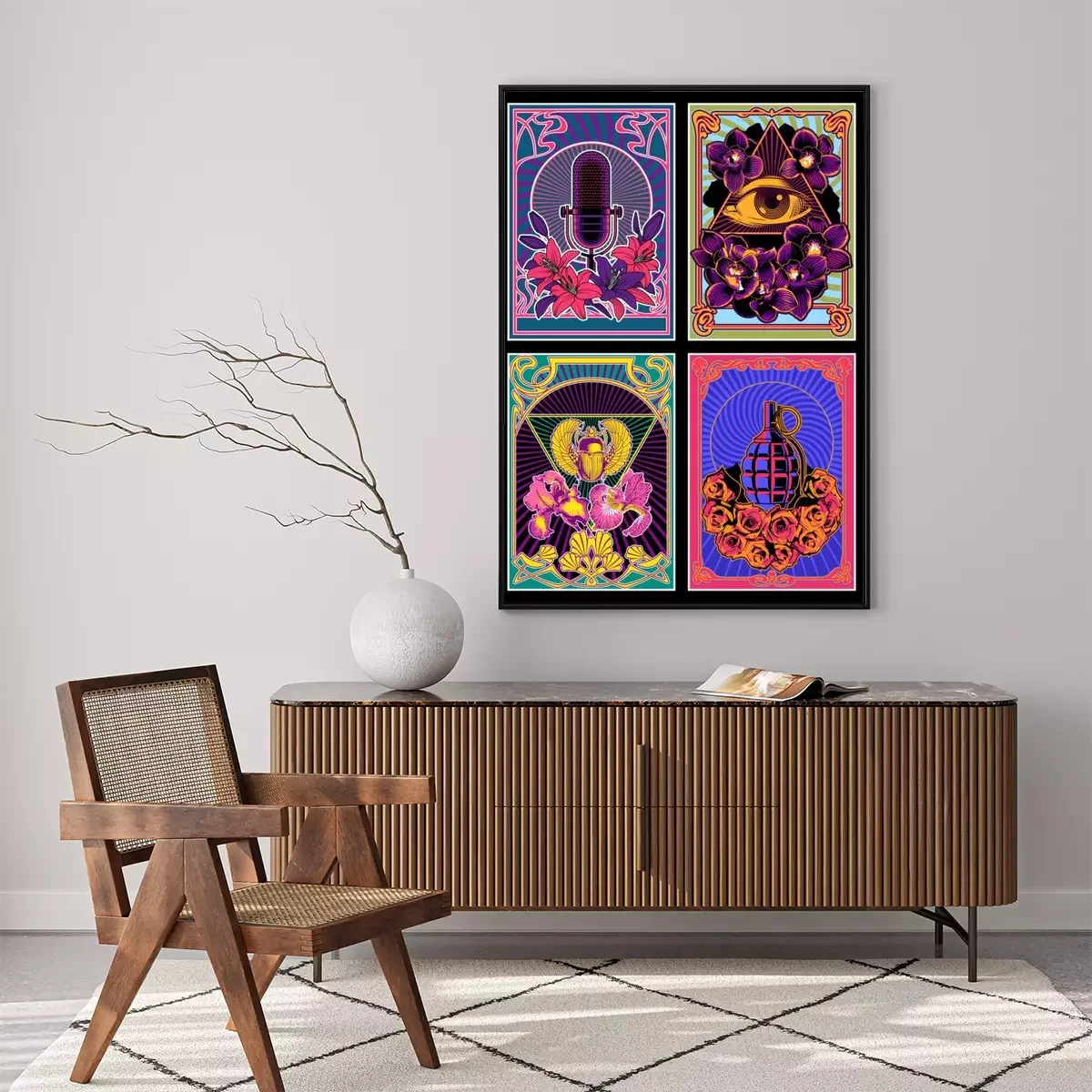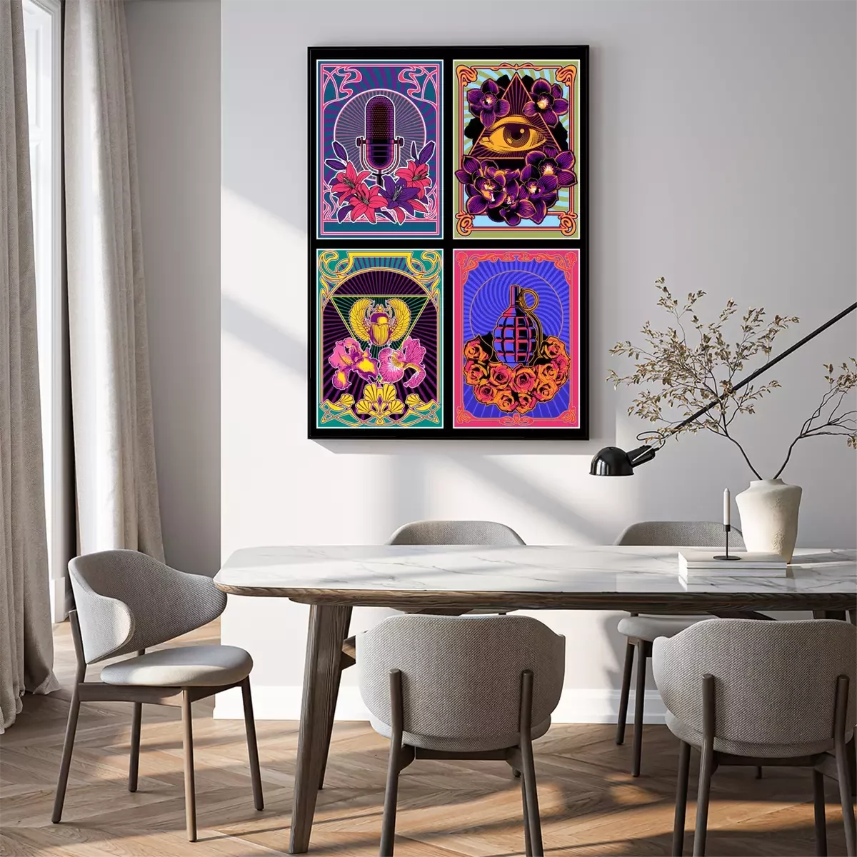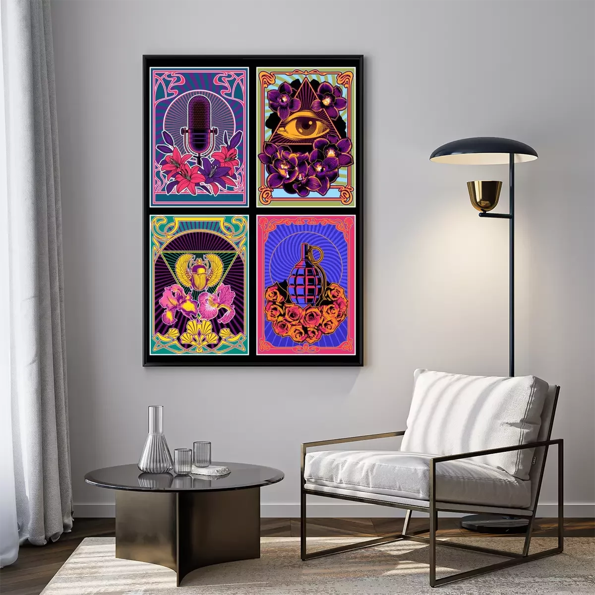 Poster Psychedelic Posters 1960s Hippie Art Style, Microphone, Eye in Triangle, Egyptian Scarab, Grenade, Flowers Psychedelic Colors, Art Nouveau Frames