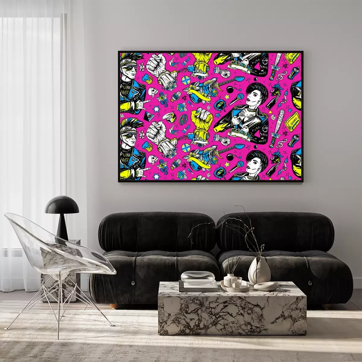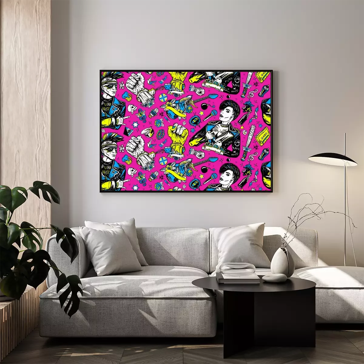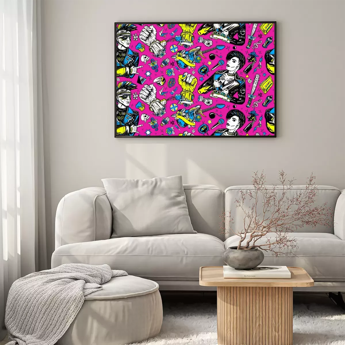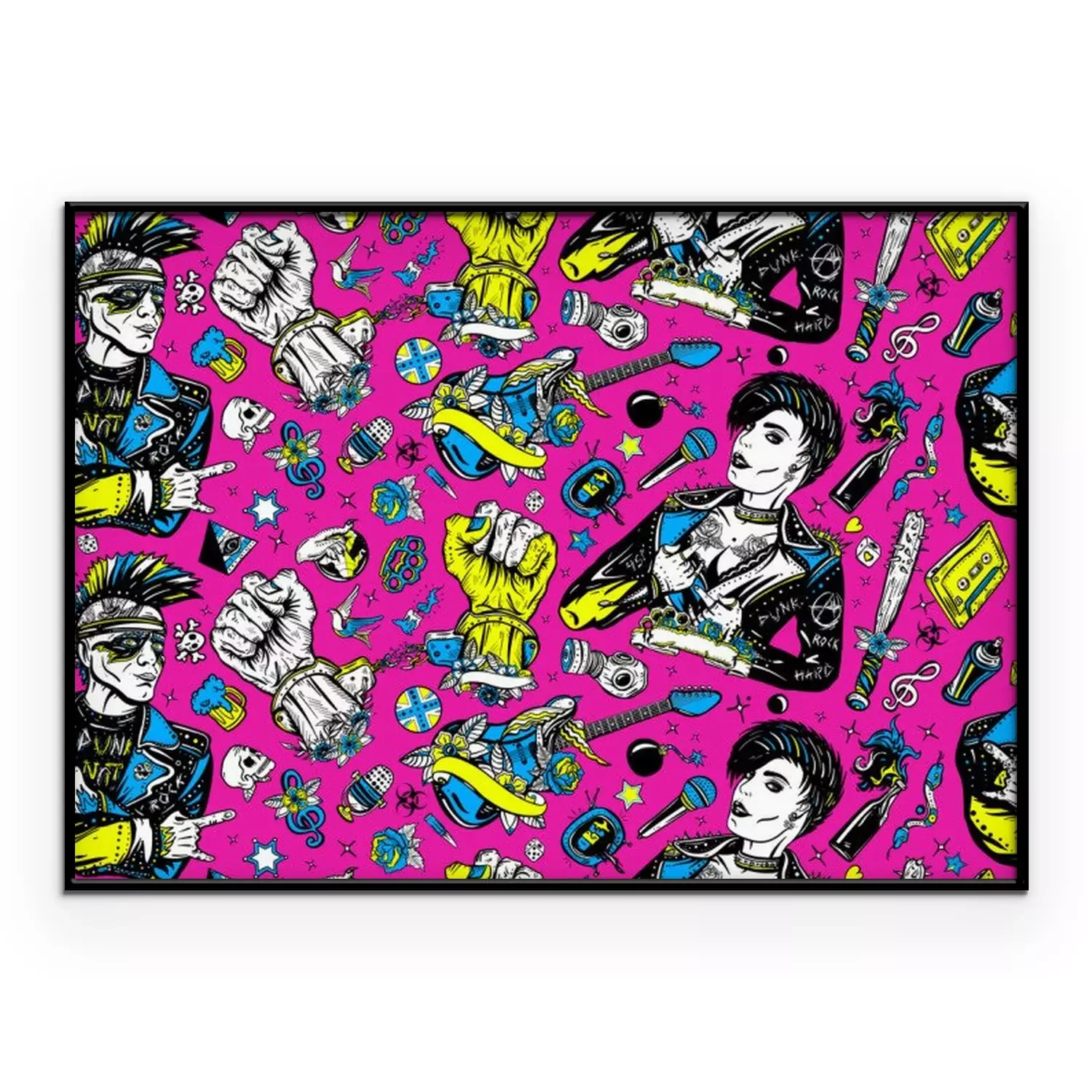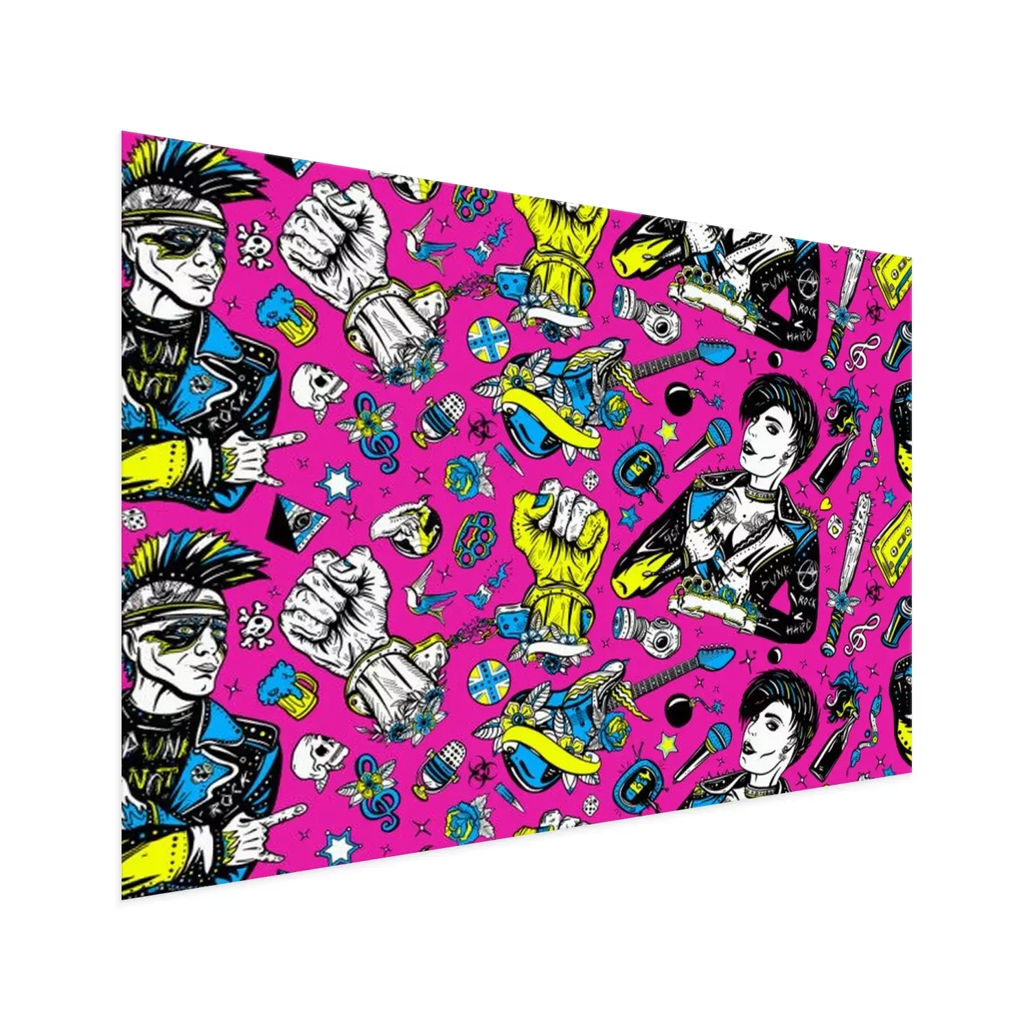 Poster: Punk and rock music seamless pattern. Punker with mohawk hairstyle, rock woman, guitarist girl. Hooligans lifestyle. Street culture concept. Electric guitar. Anarchy art. Old school tattoo style
