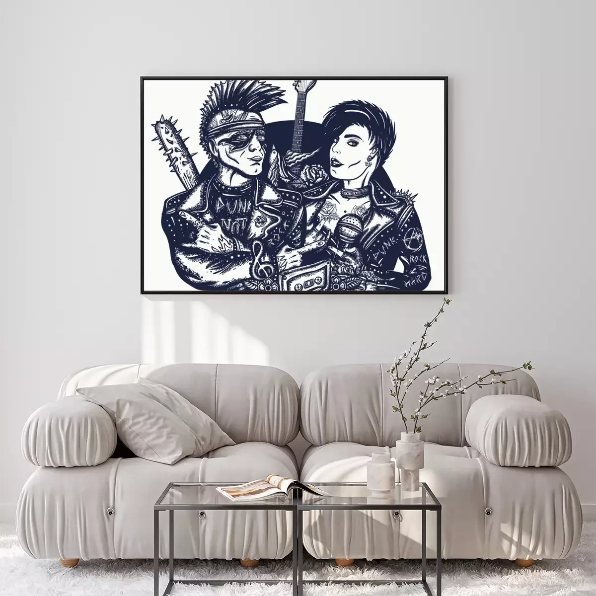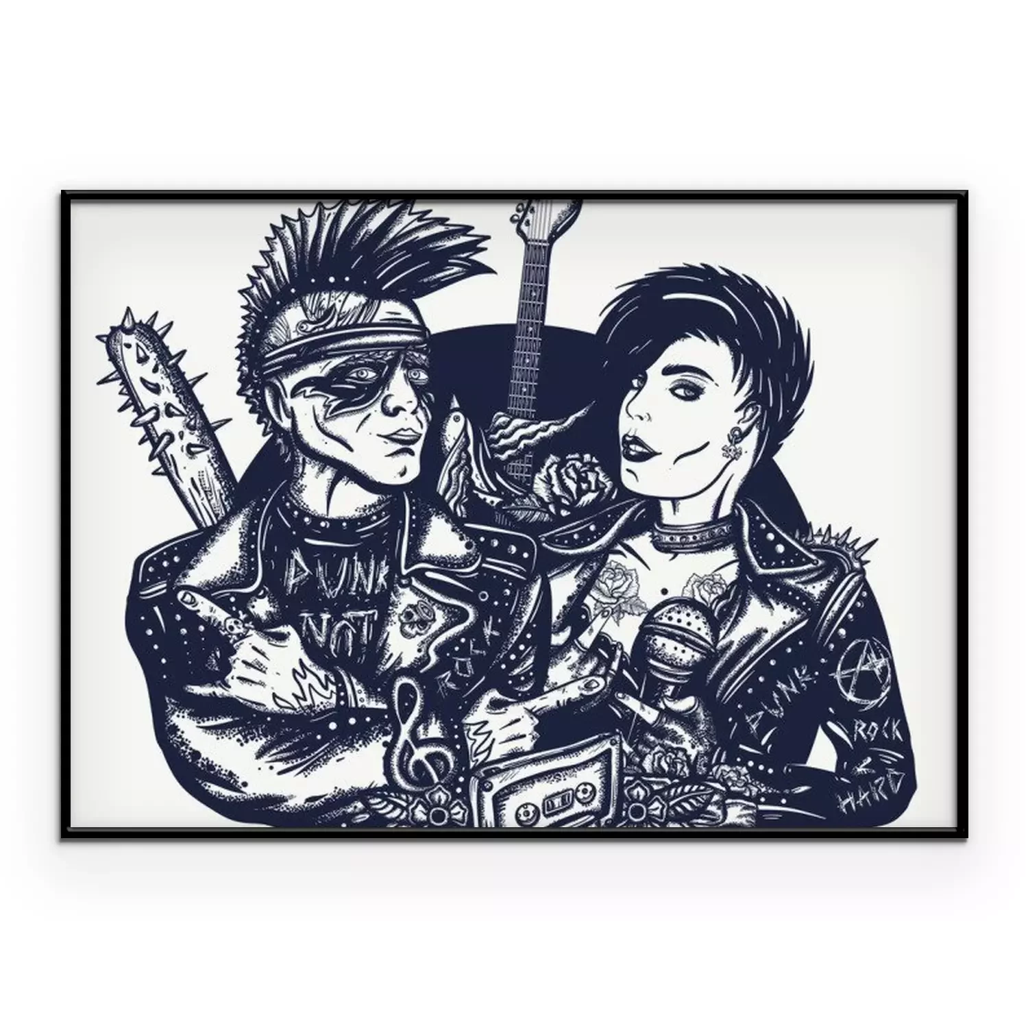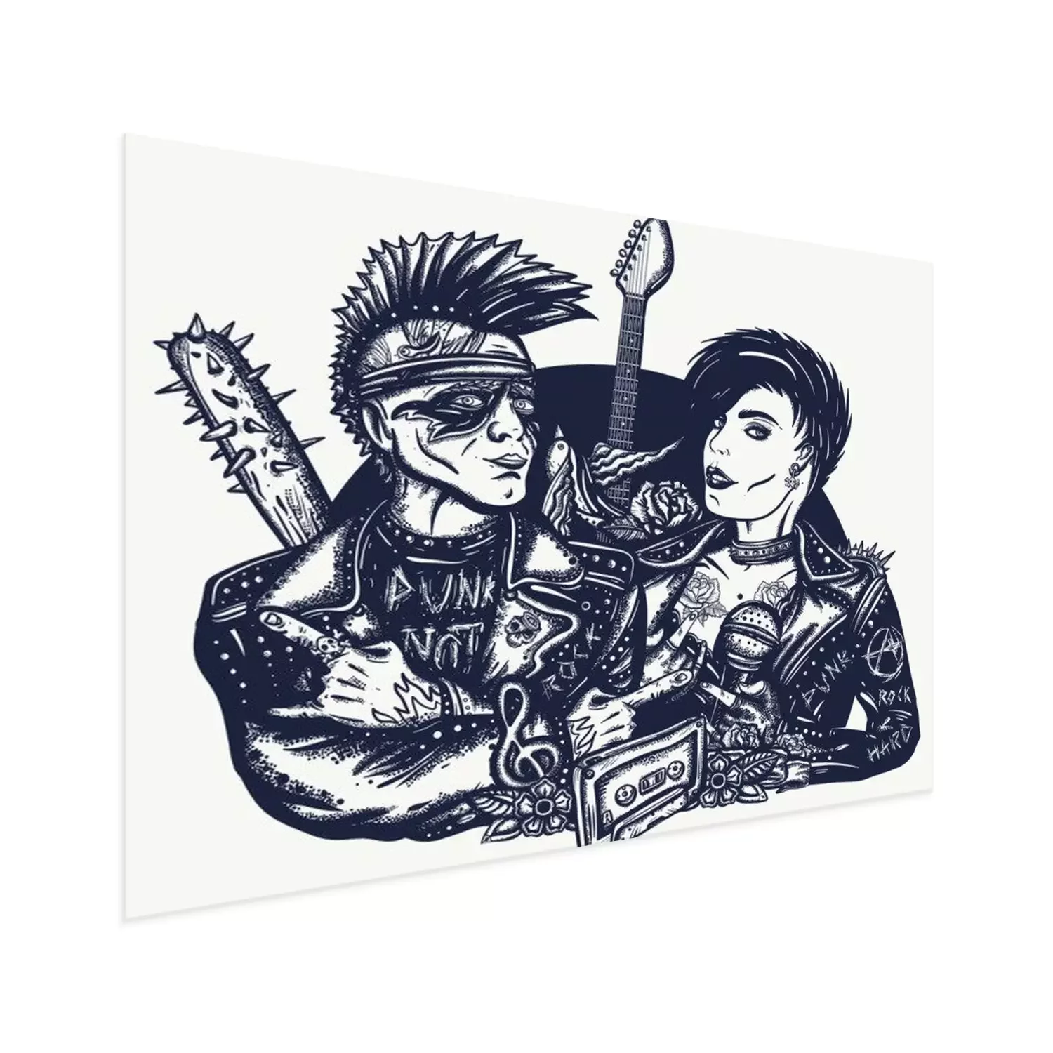 Poster: Punk music. Musicians and electric guitar. Street music culture. Tattoo and t-shirt design. Punker with mohawk hairstyle, guitarist. Anarchy art. Rock and roll couple. Hooligans lifestyle