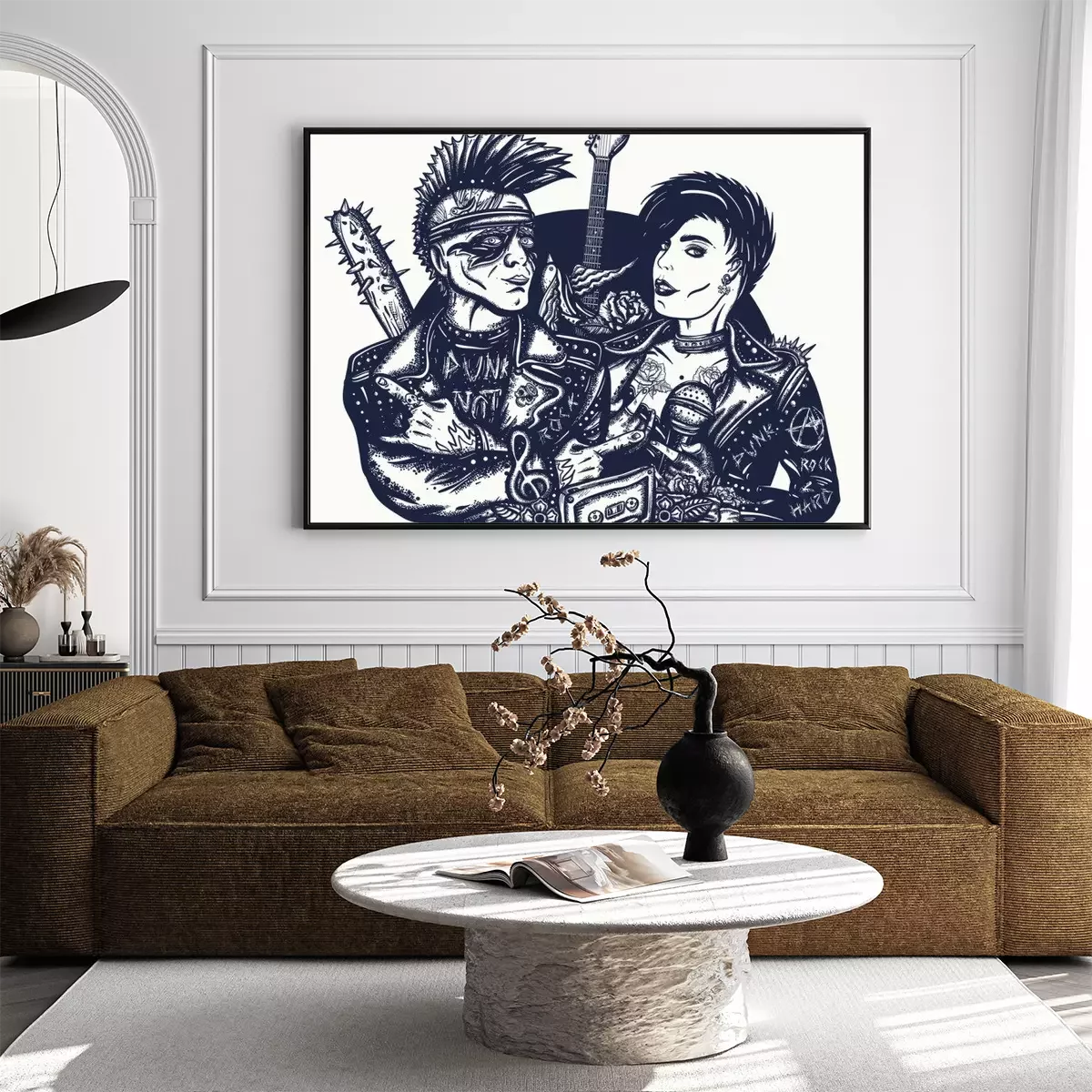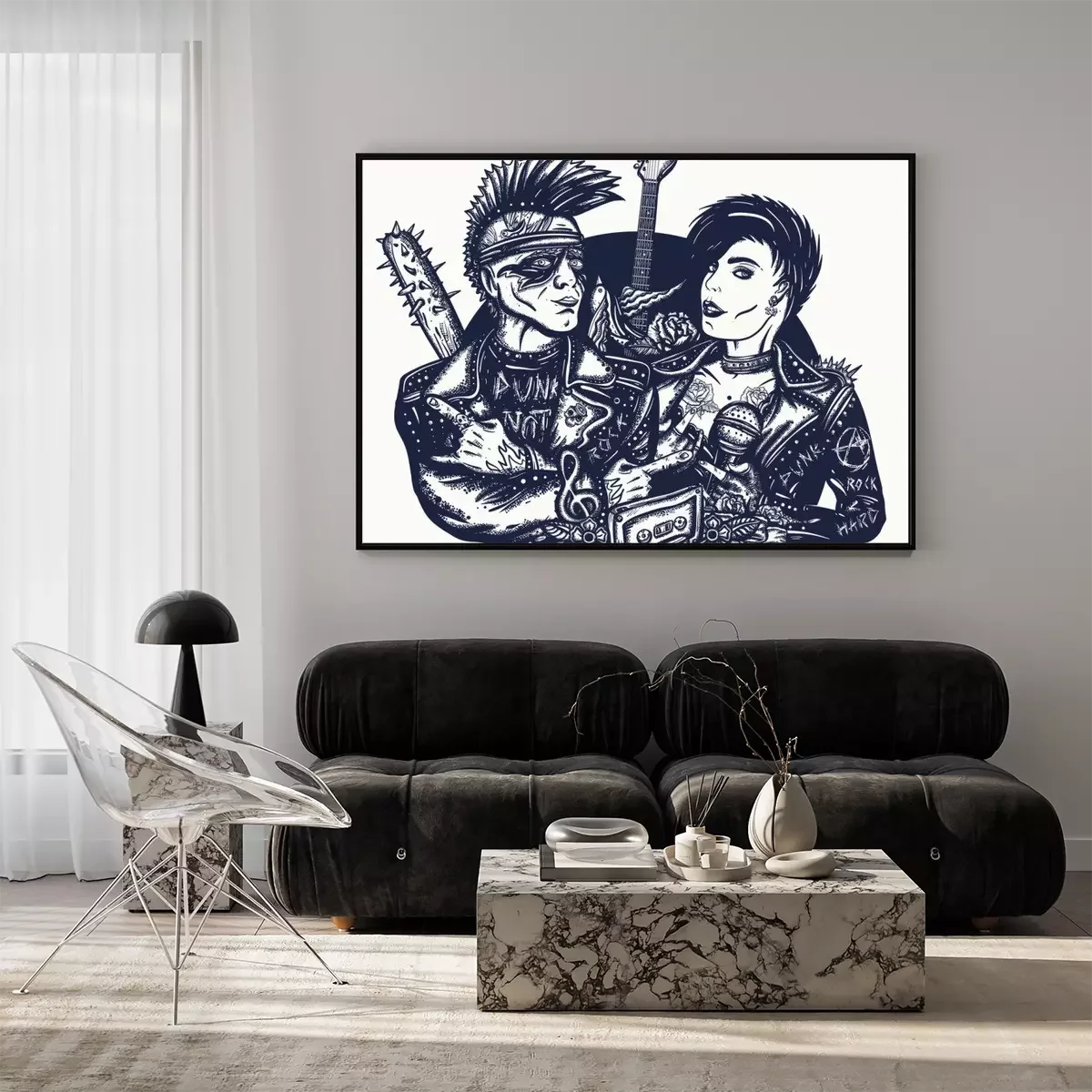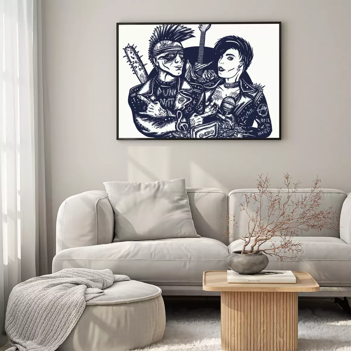 Poster: Punk music. Musicians and electric guitar. Street music culture. Tattoo and t-shirt design. Punker with mohawk hairstyle, guitarist. Anarchy art. Rock and roll couple. Hooligans lifestyle
