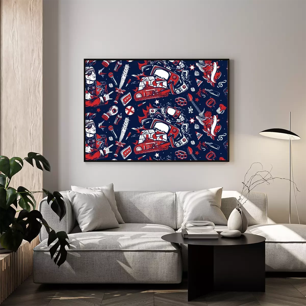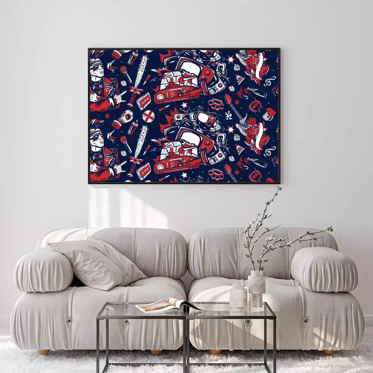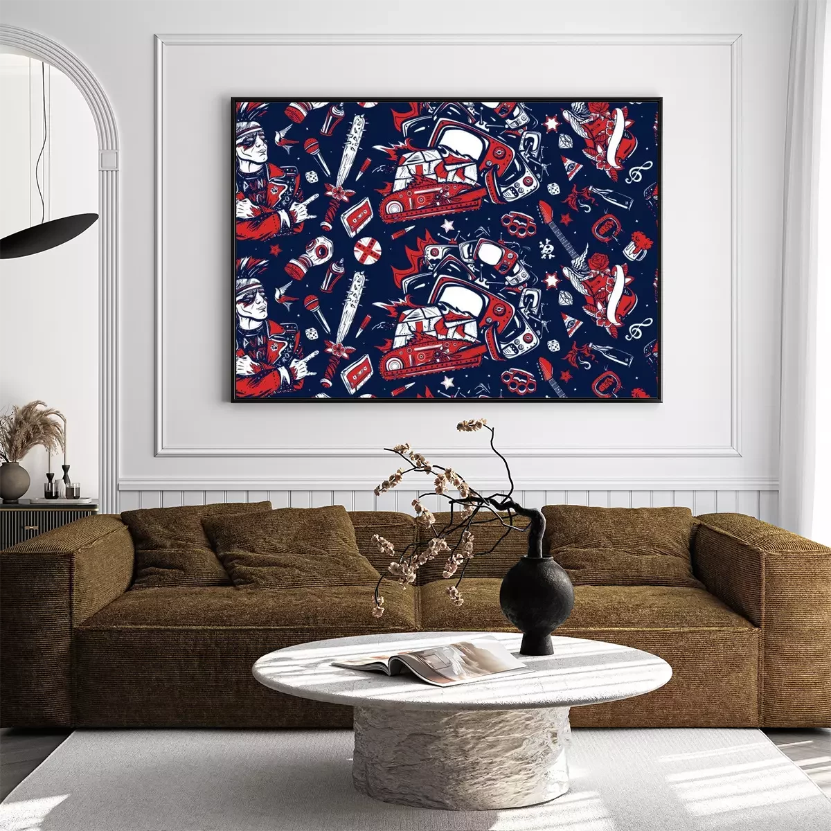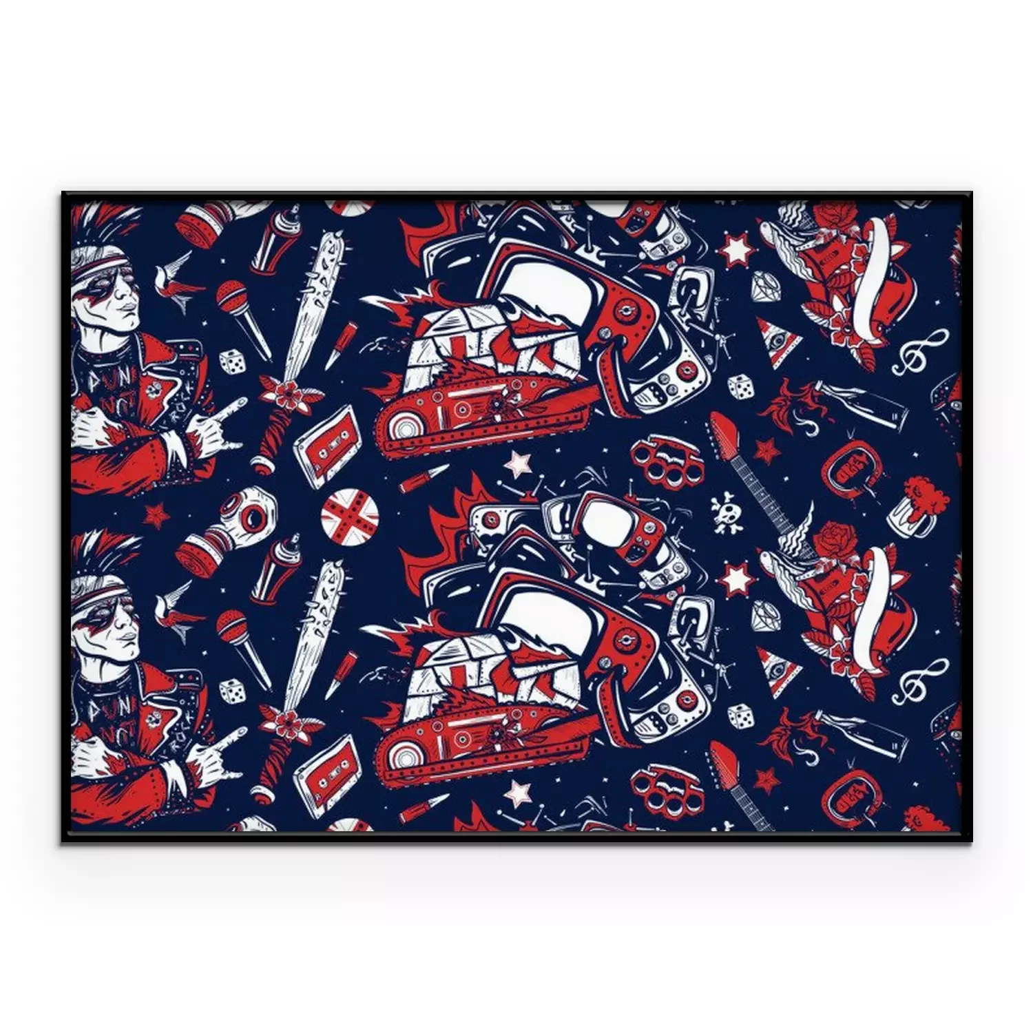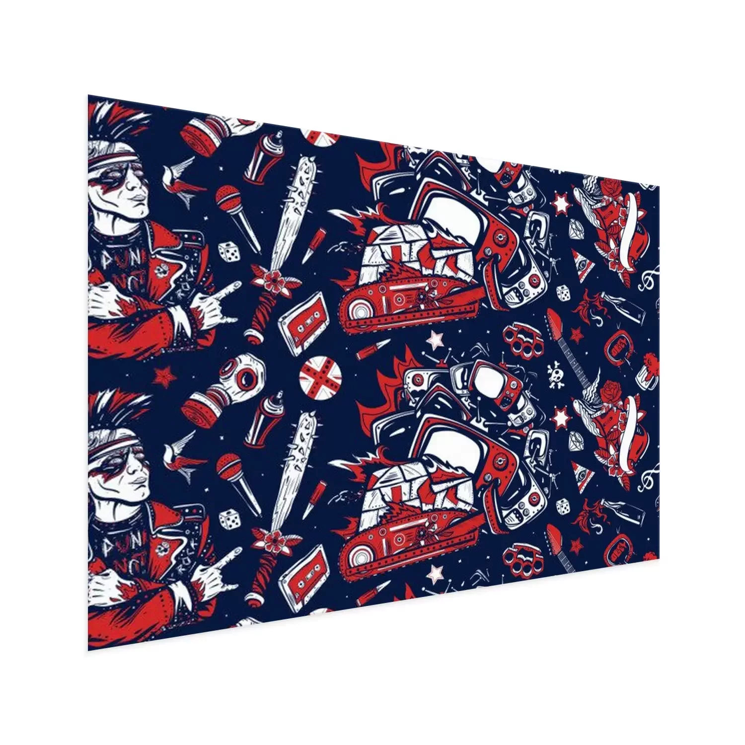 Poster Punk rock music. Street culture musical art. Hooligans lifestyle. Electric guitar. Anarchy. Consumer society. Protest concept. Seamless pattern. Punker with mohawk hairstyle, audio type, bulldozer