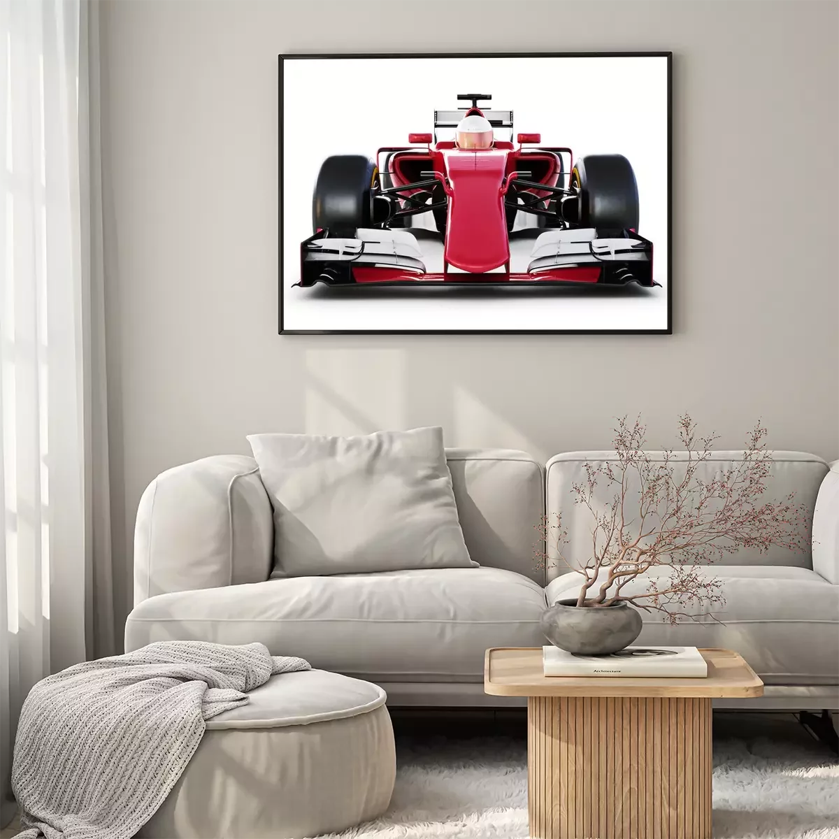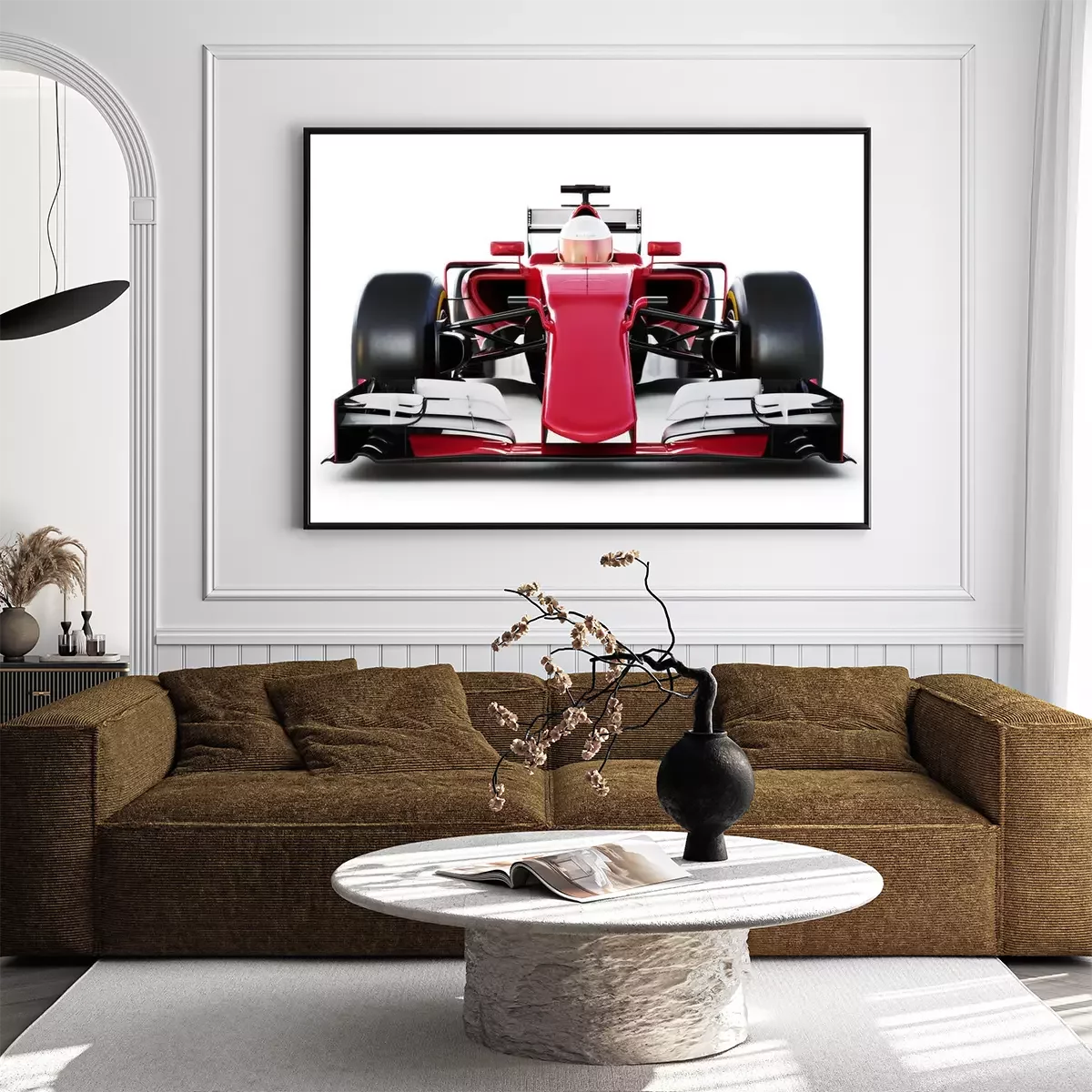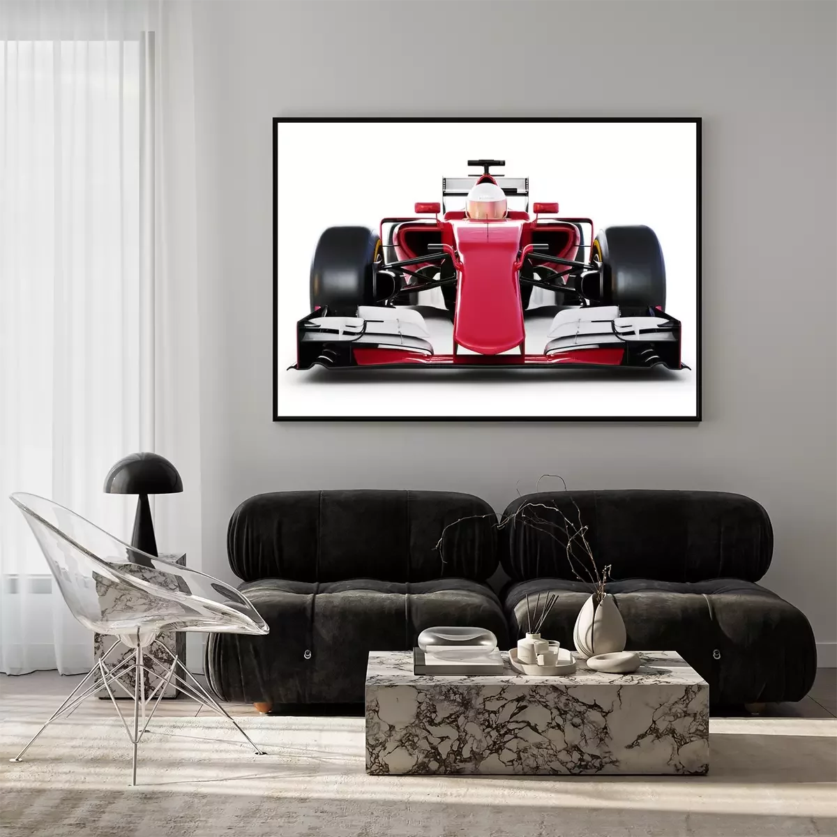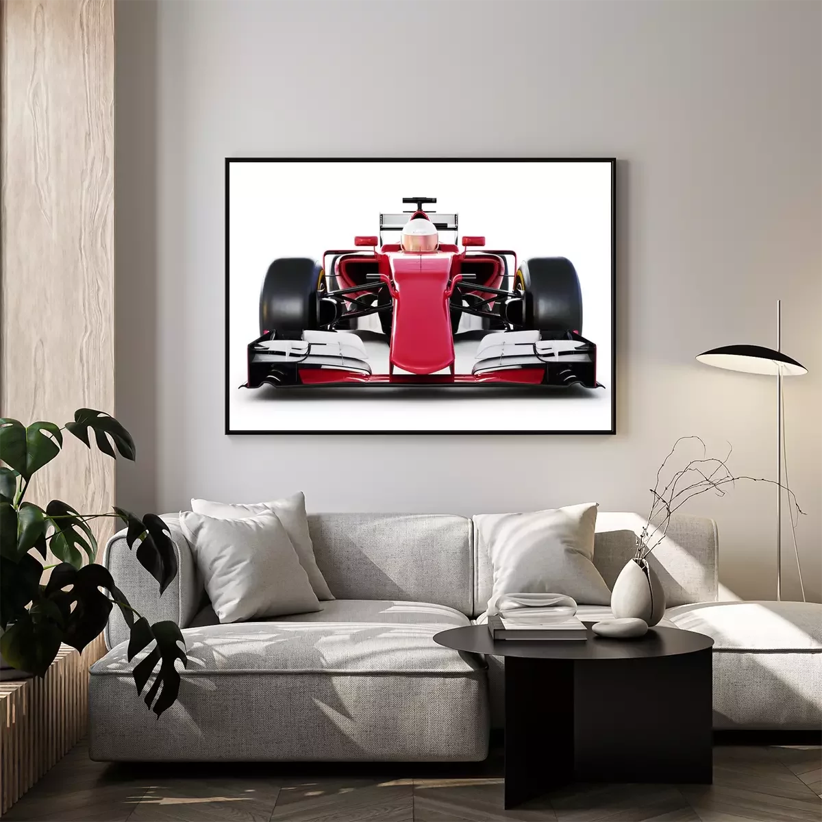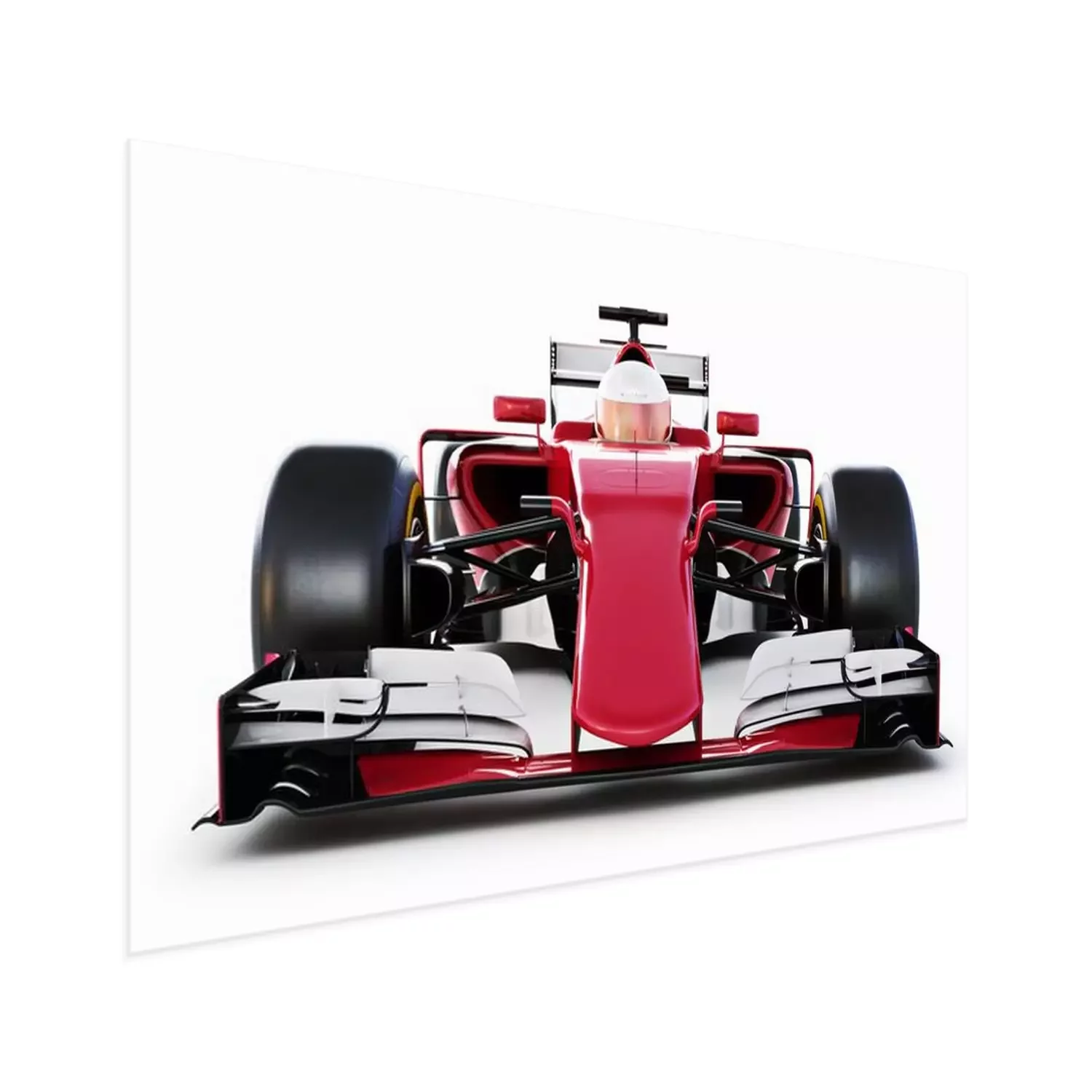 Poster: Race auto en chauffeur vooraanzicht op een witte achtergrond geïsoleerd. 3D-rendering