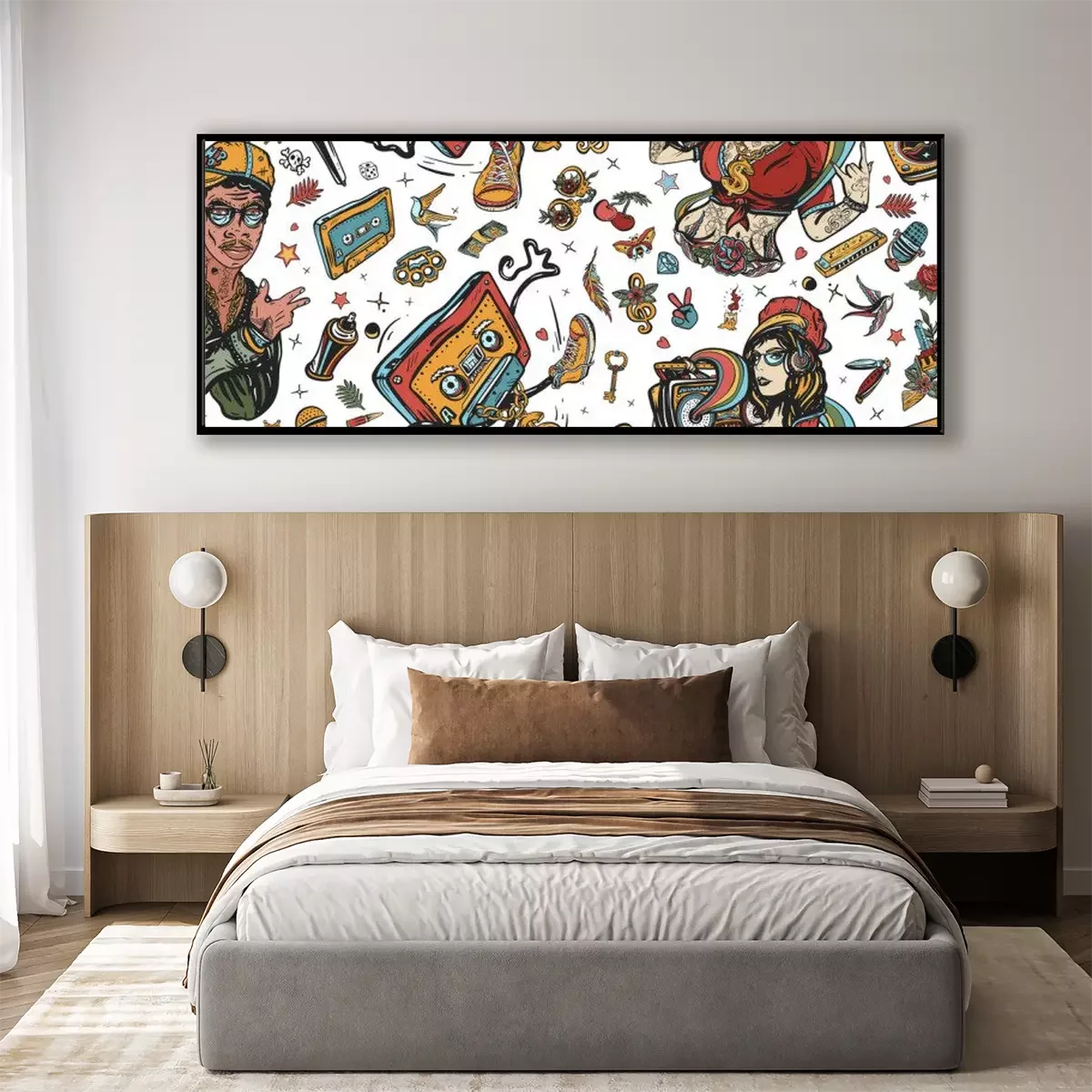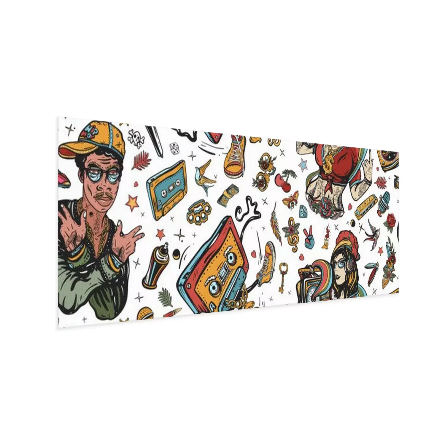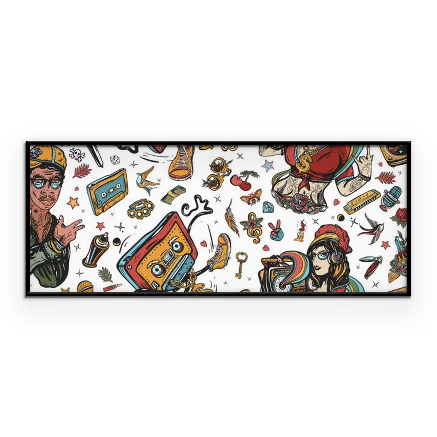 Poster: Rap music seamless pattern. Old school tattoo style. Hip hop girl, swag woman. African American man rapper. Audio cassette, break dance art. Street ghetto lifestyle. Pop culture musical background