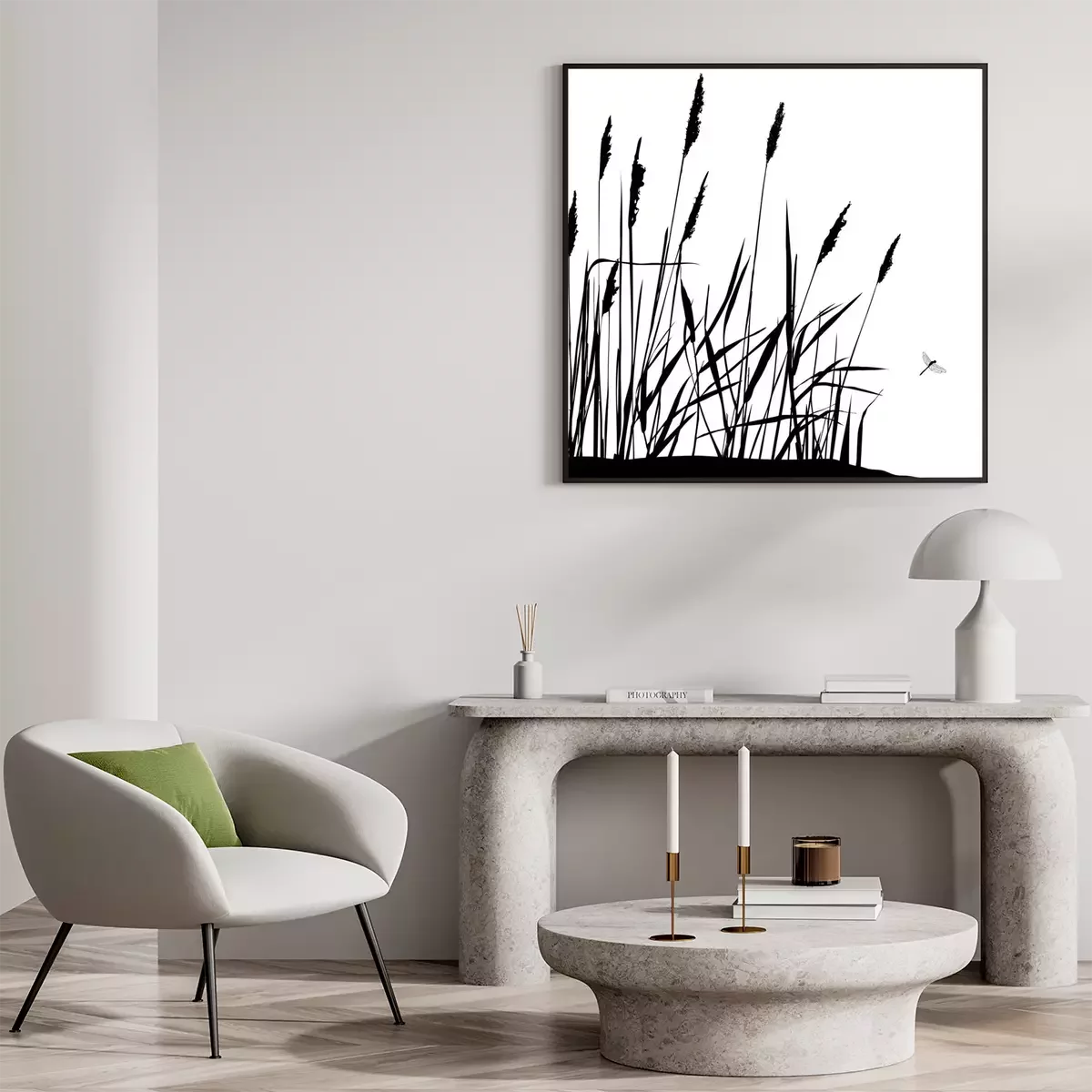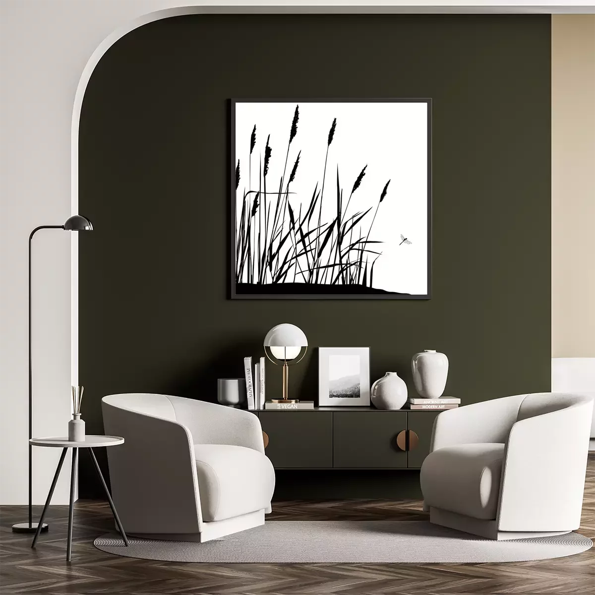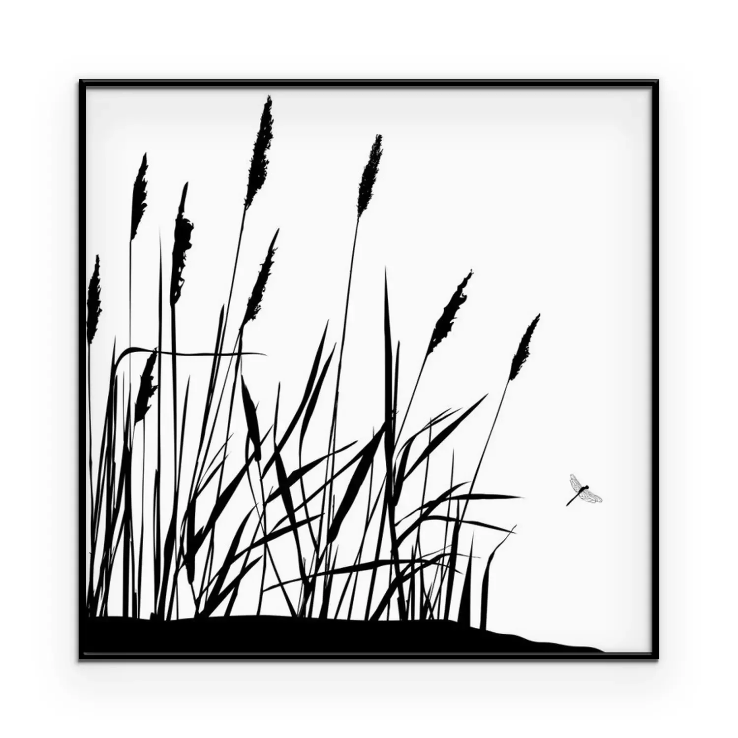 Poster: Reed en vliegende libelle - zwart en wit vector illustratie