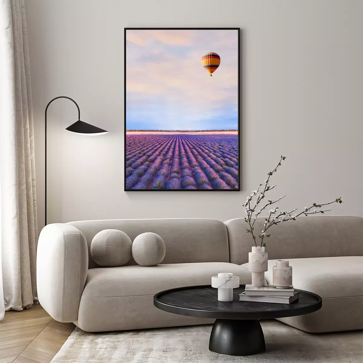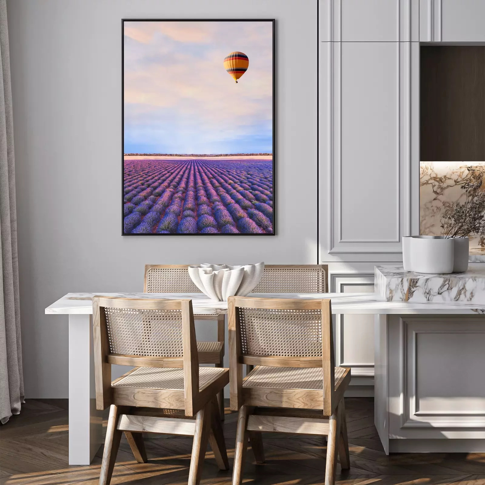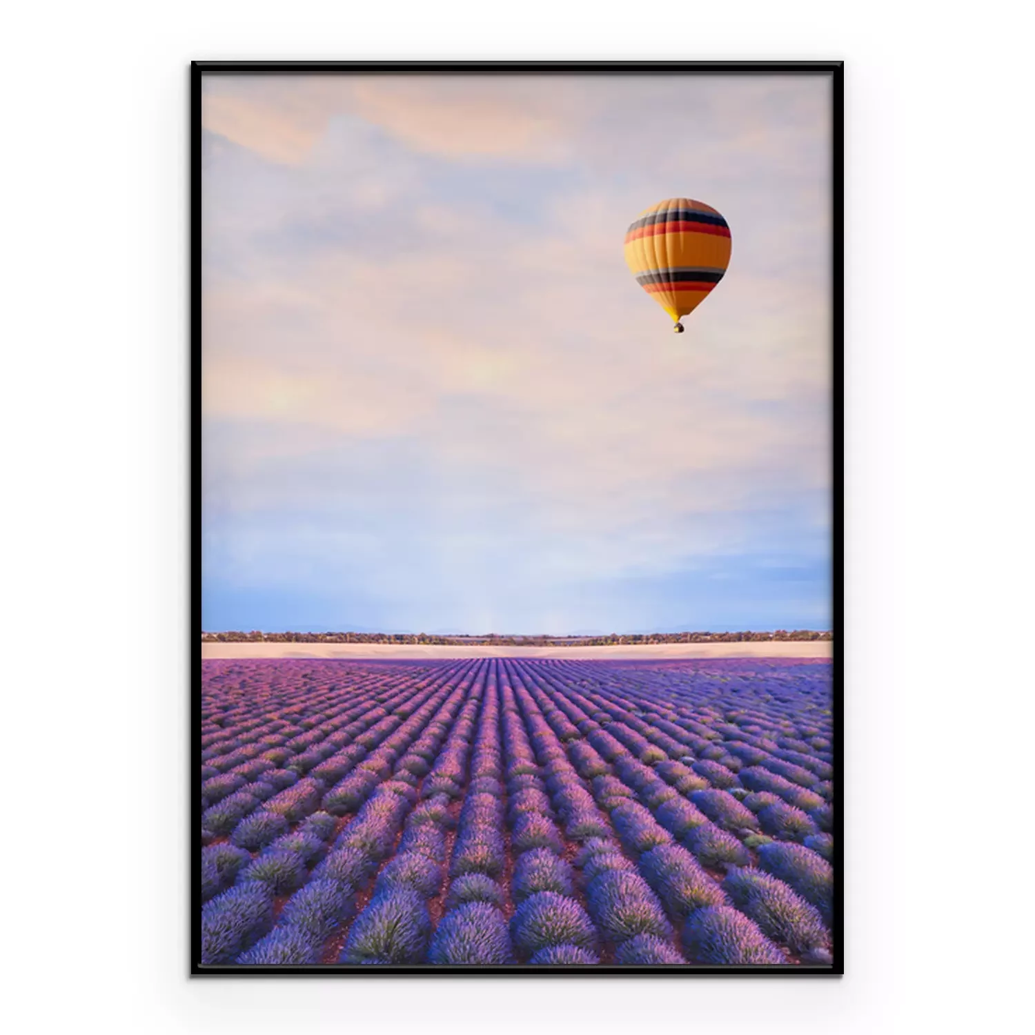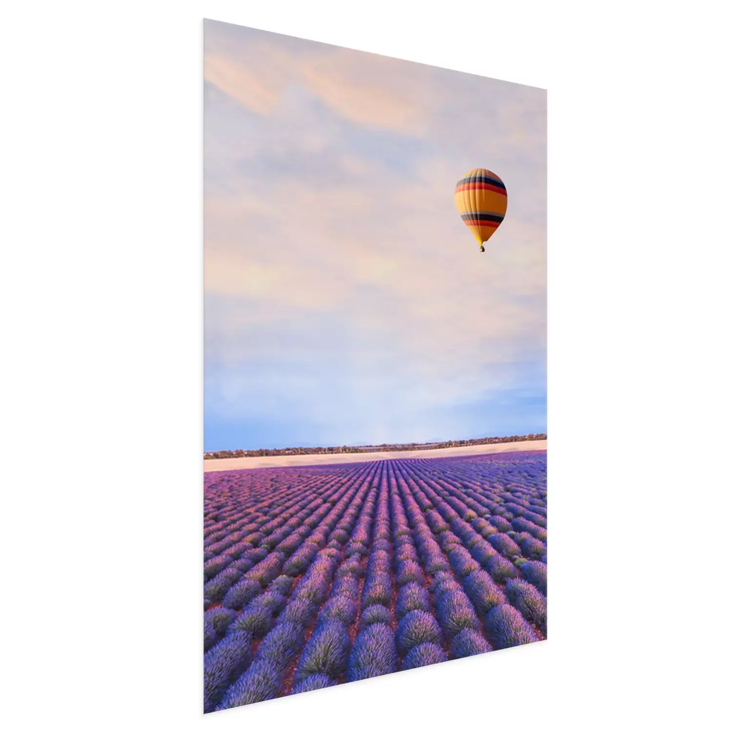 Poster: reisbestemming, mooie droom inspirerende landschap met hete luchtballon vliegen boven lavendelvelden in de Provence, toerisme in Frankrijk