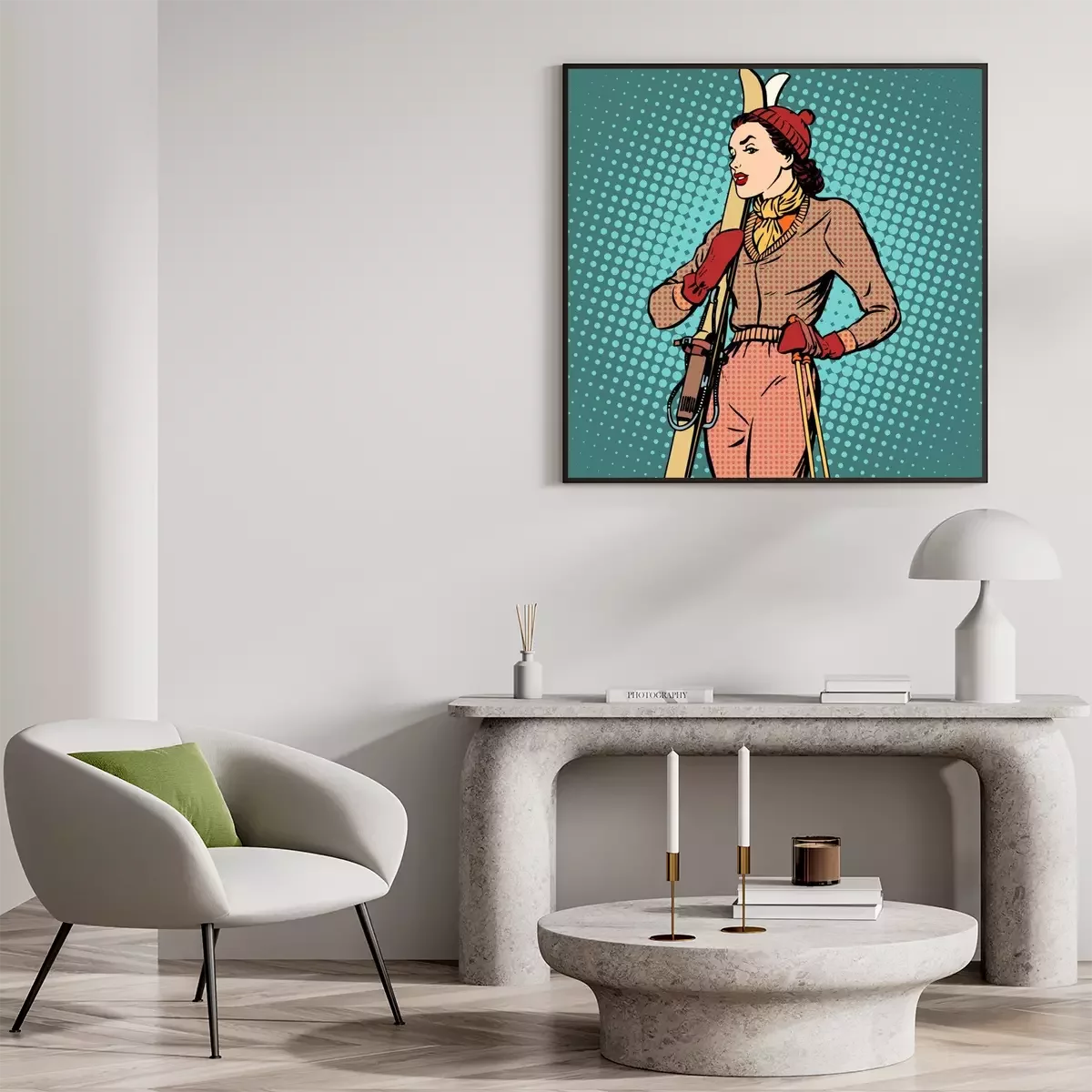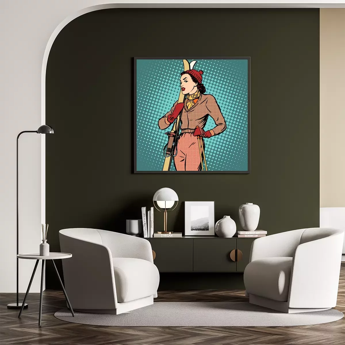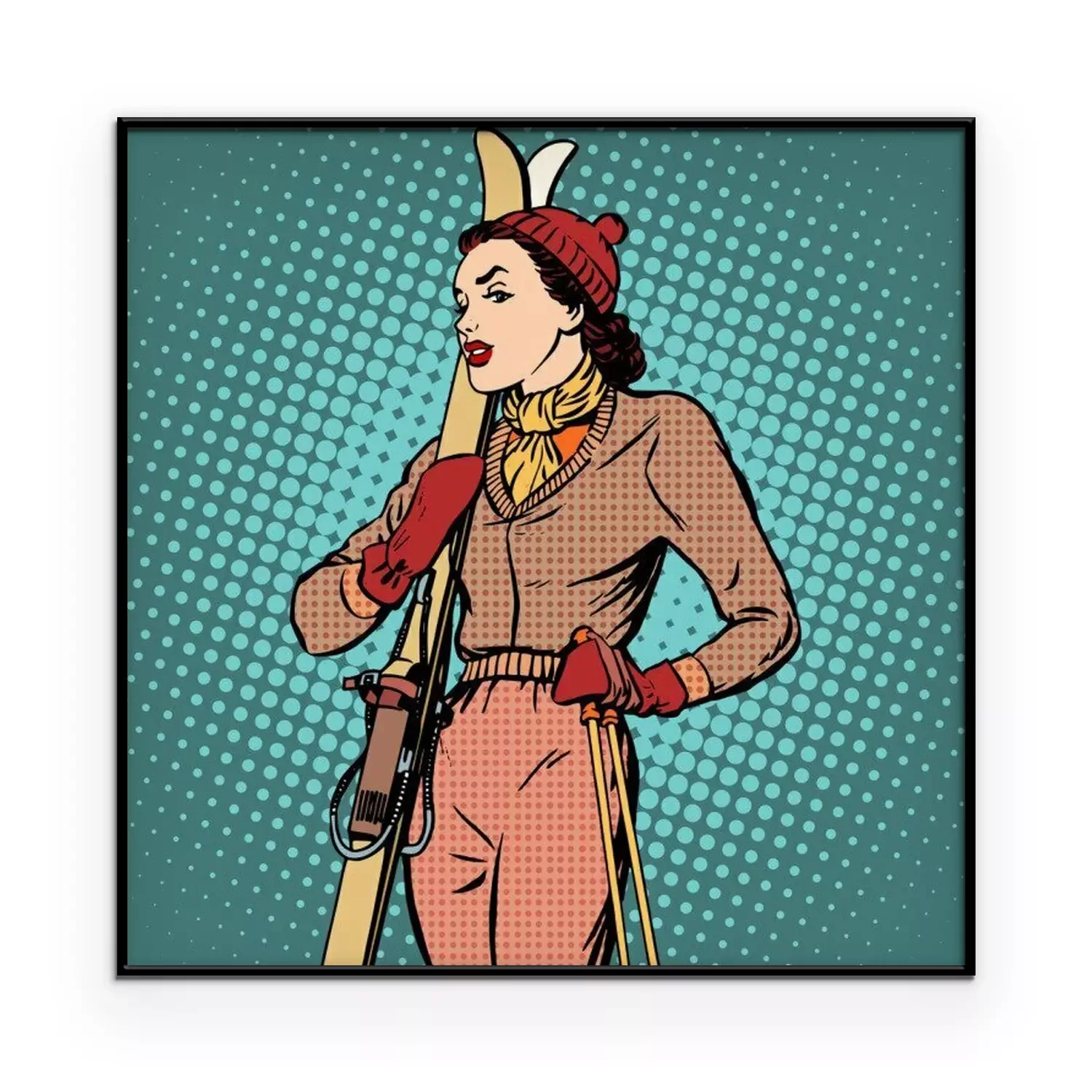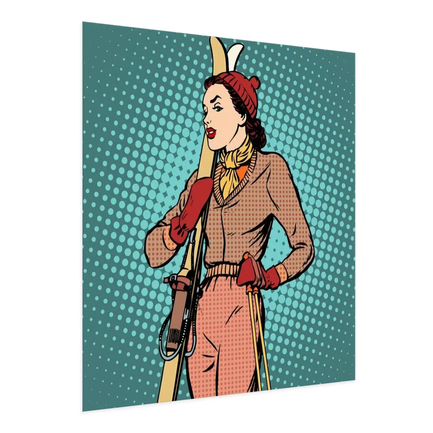Poster Retro-achtige afbeelding van een vrouw op ski's.
