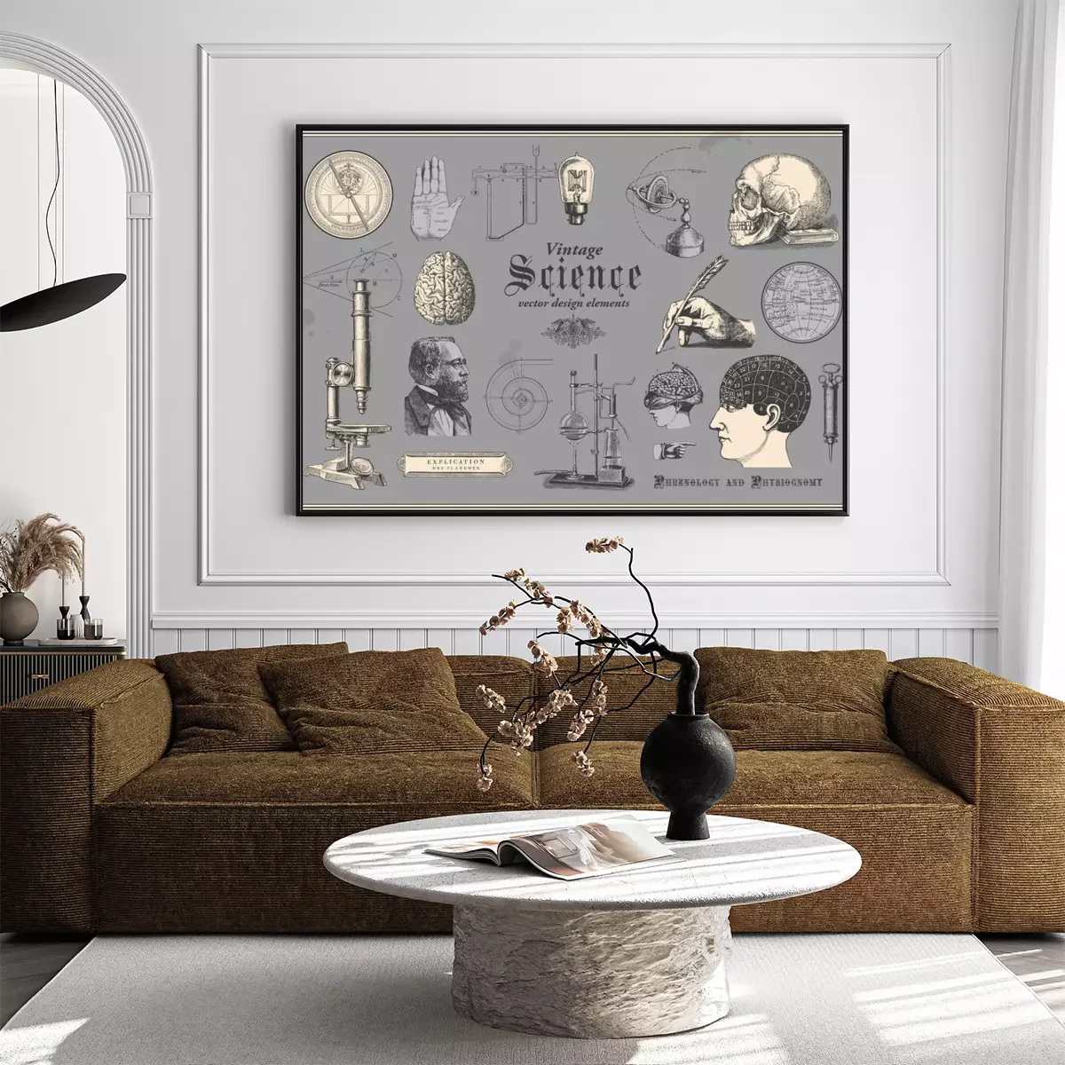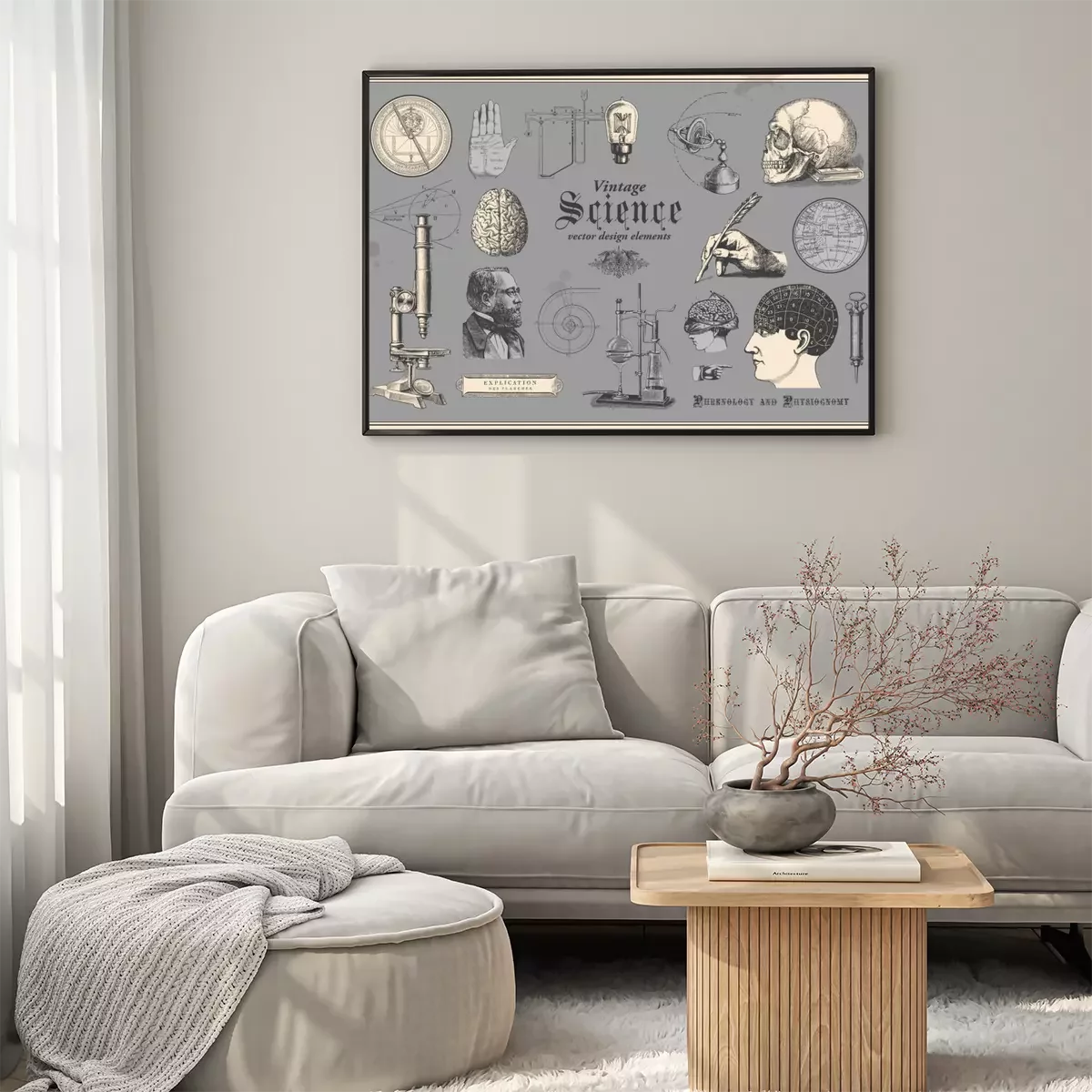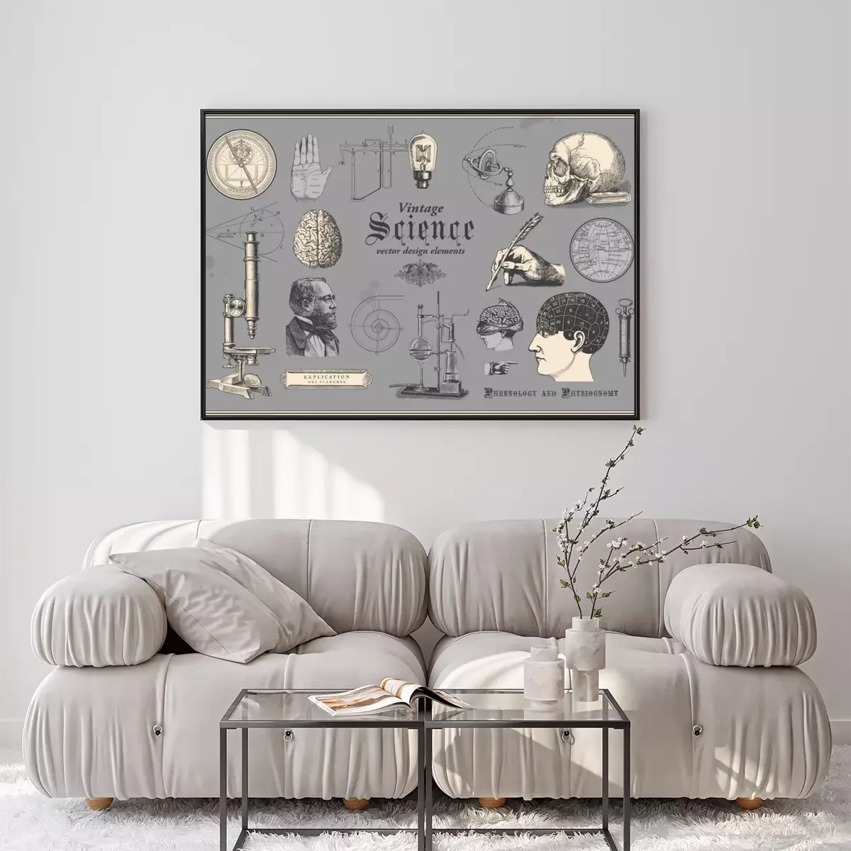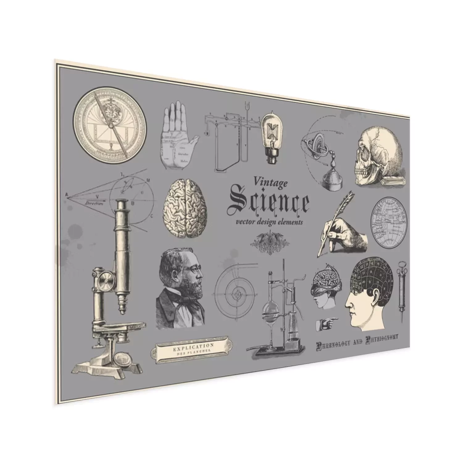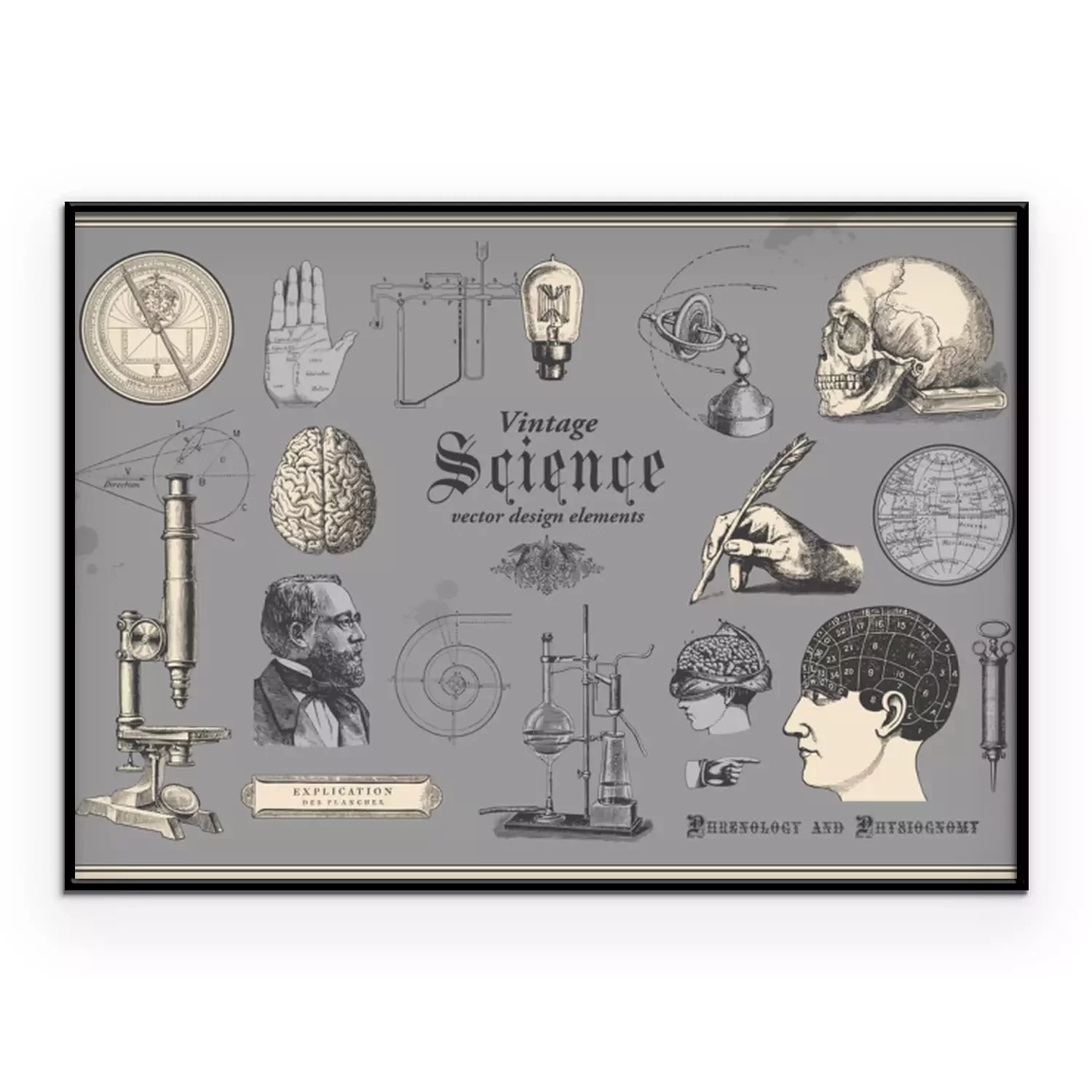 Poster: retro grafisch ontwerp elementen: vintage science - collectie van vintage tekeningen met disciplines zoals geneeskunde, frenologie, chemie, palm lezing (Handlijnkunde) en nautische navigatie