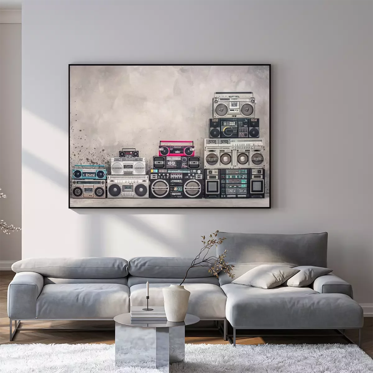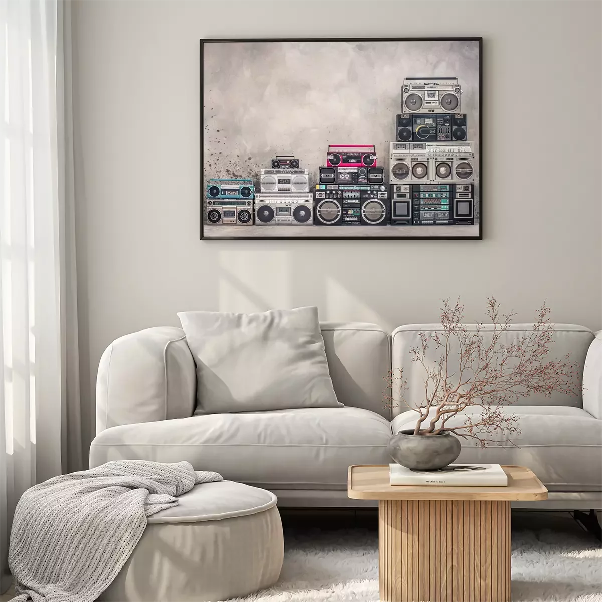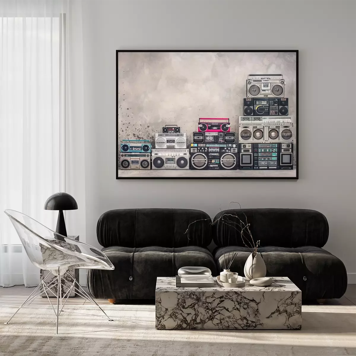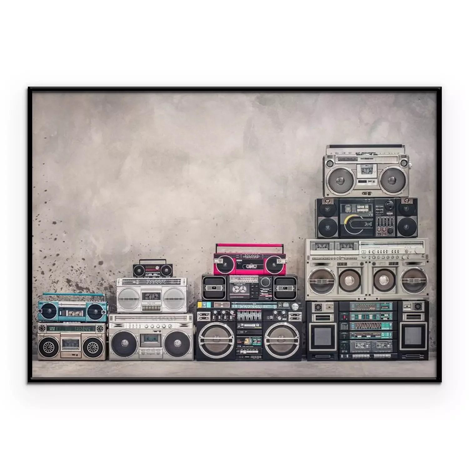 Poster: Retro old school design getto blaster boombox stereo radio cassettebandrecorders toren van circa 1980 voorste betonnen muur achtergrond. Vintage stijl gefilterde foto