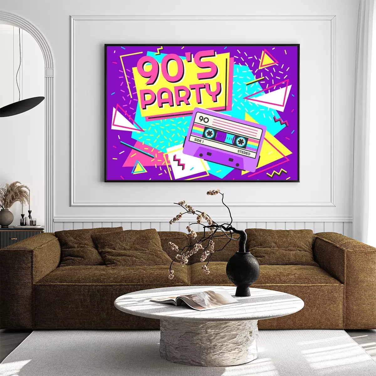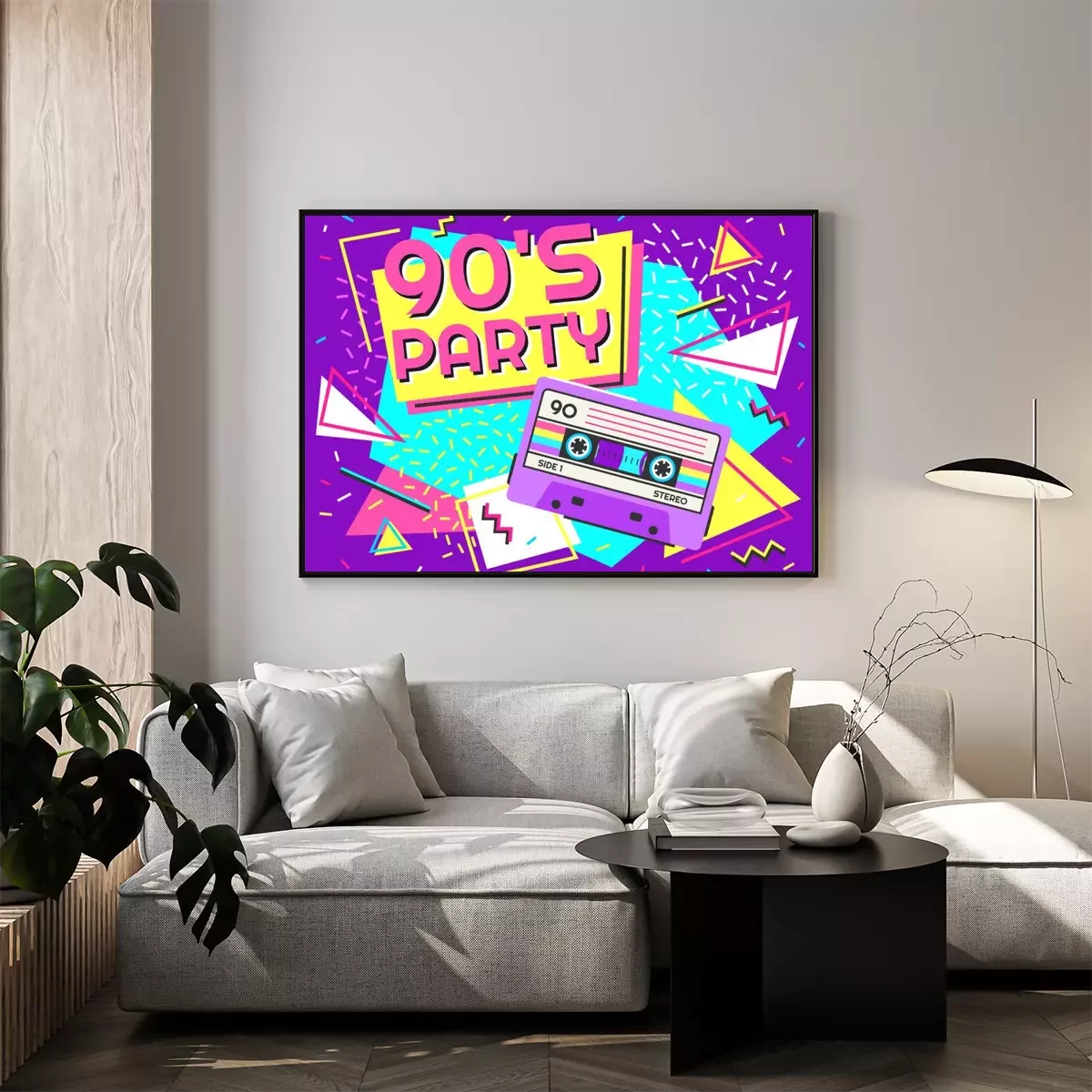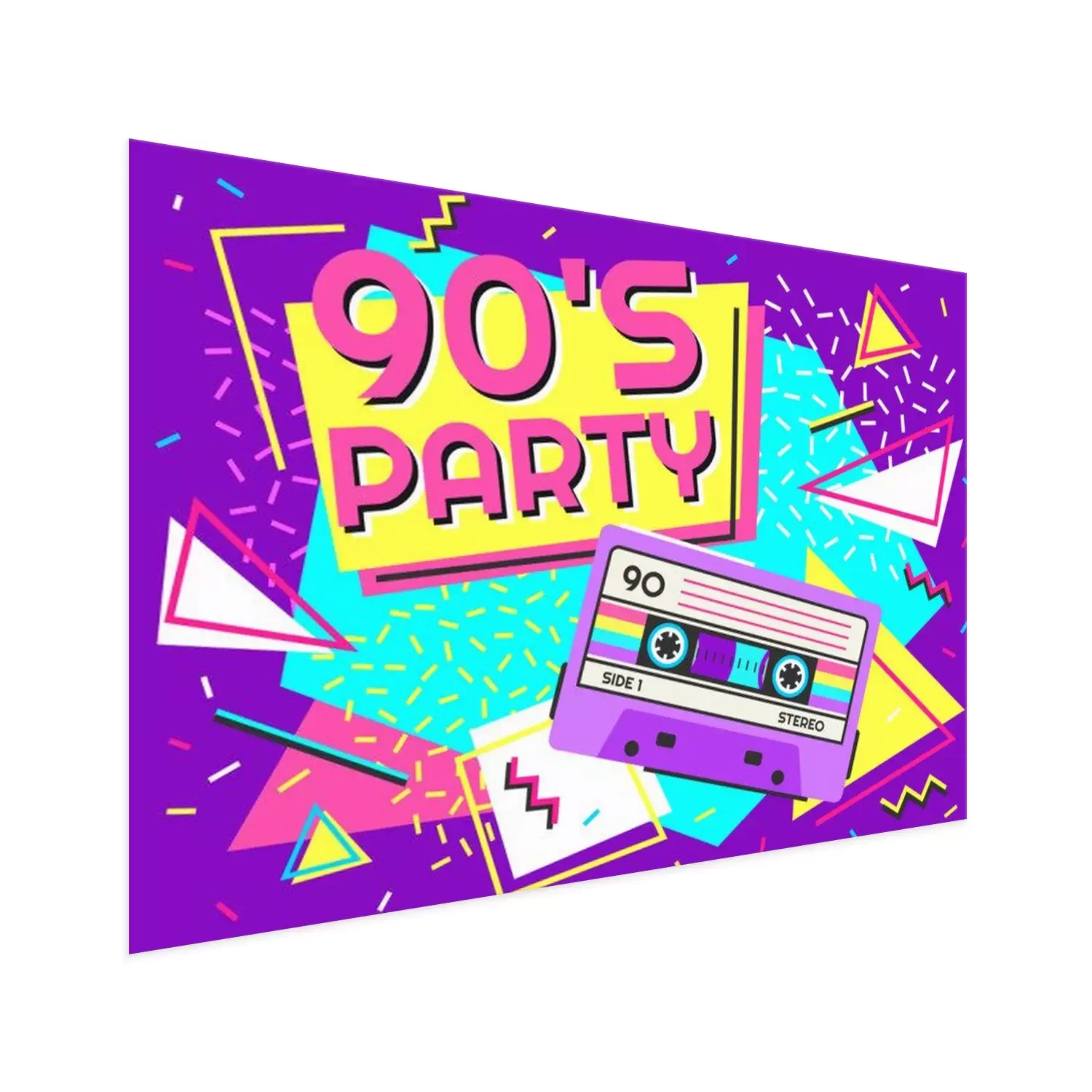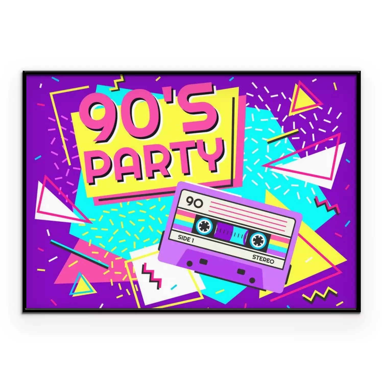 Poster: Retro party poster. Nineties music, vintage tape cassette banner and 90s style. Radio invitation card, dance time parties advertisement poster vector background illustration