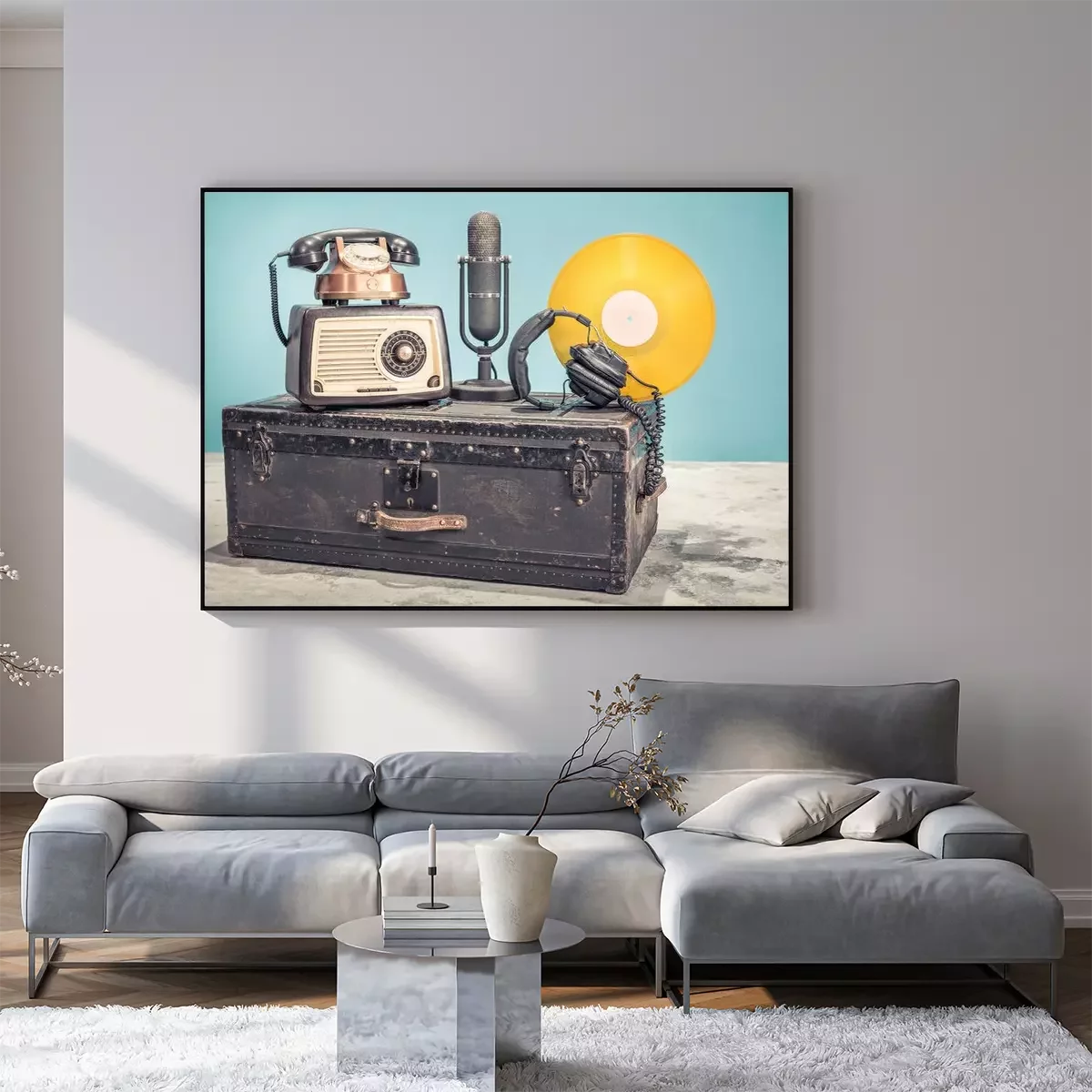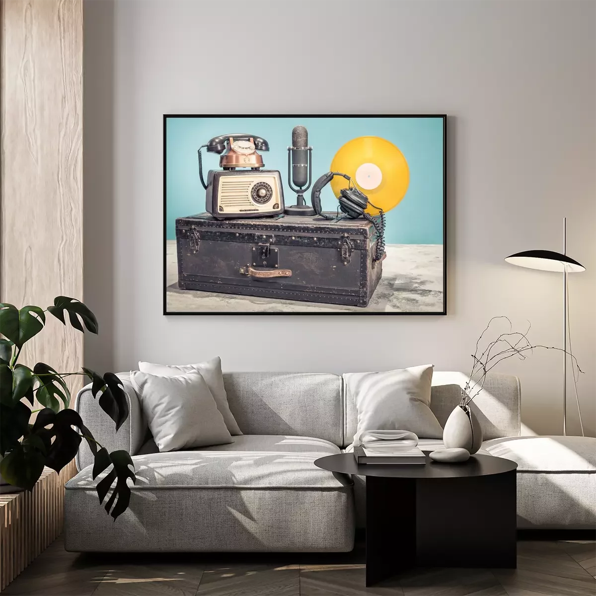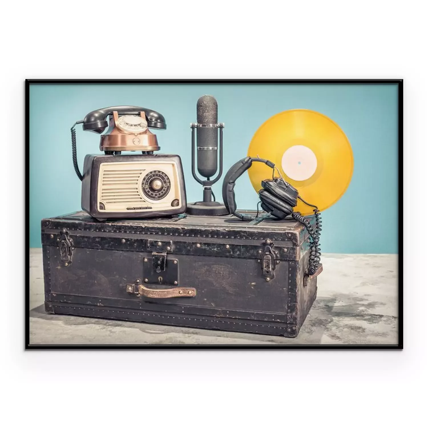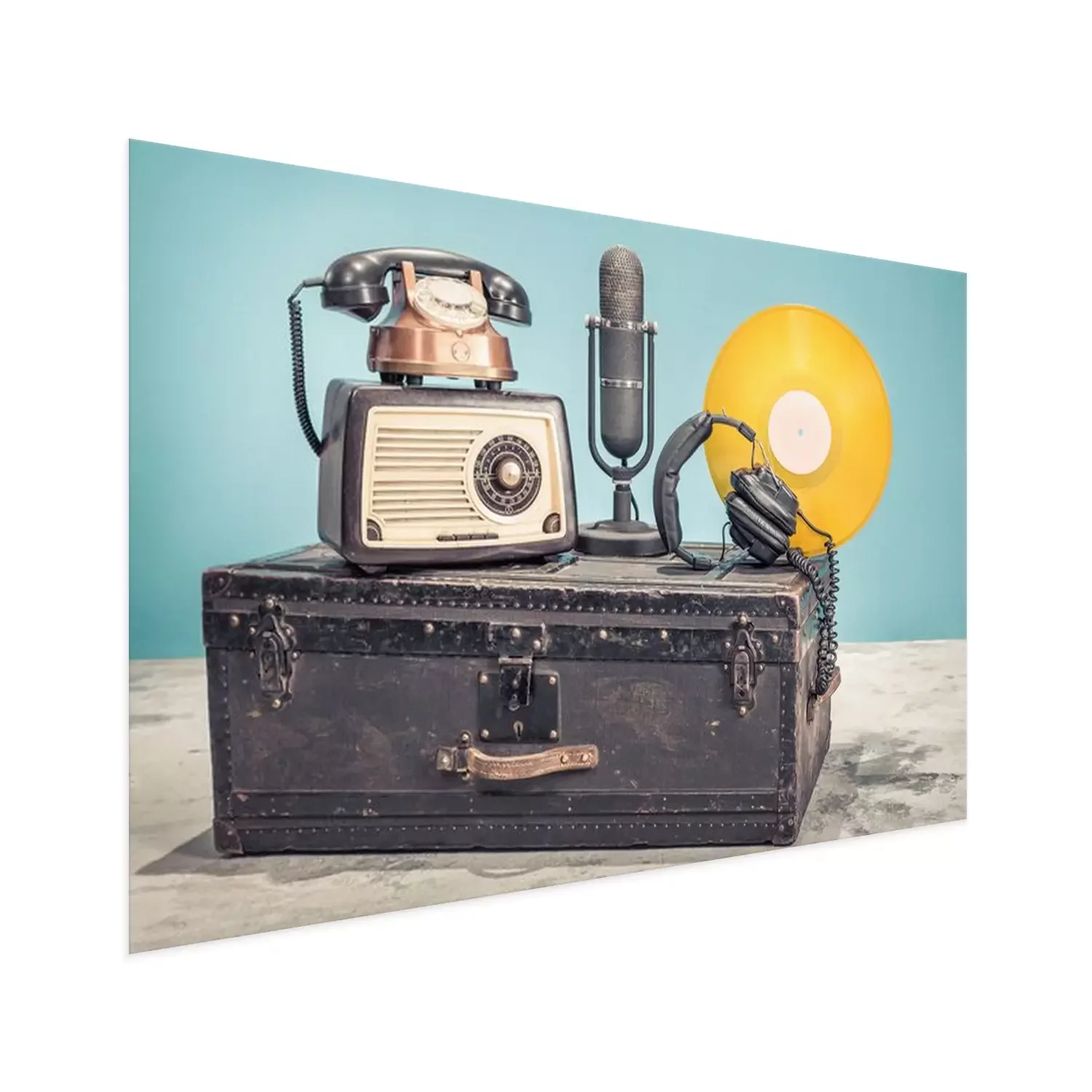 Poster: Retro radio uit de jaren 60, oude koperen telefoon, studiomicrofoon uit de jaren 50 en goudkleurige vinylschijf opnemen circa 70s, koptelefoon op oude klassieke reiskoffer. Vintage stijl gefilterde fo