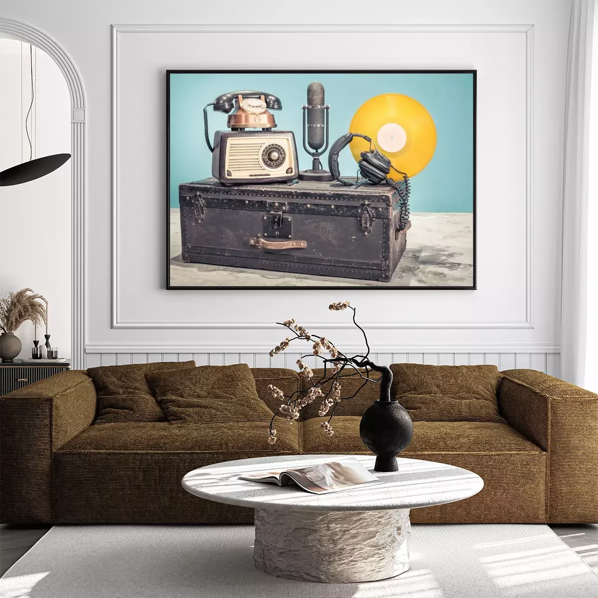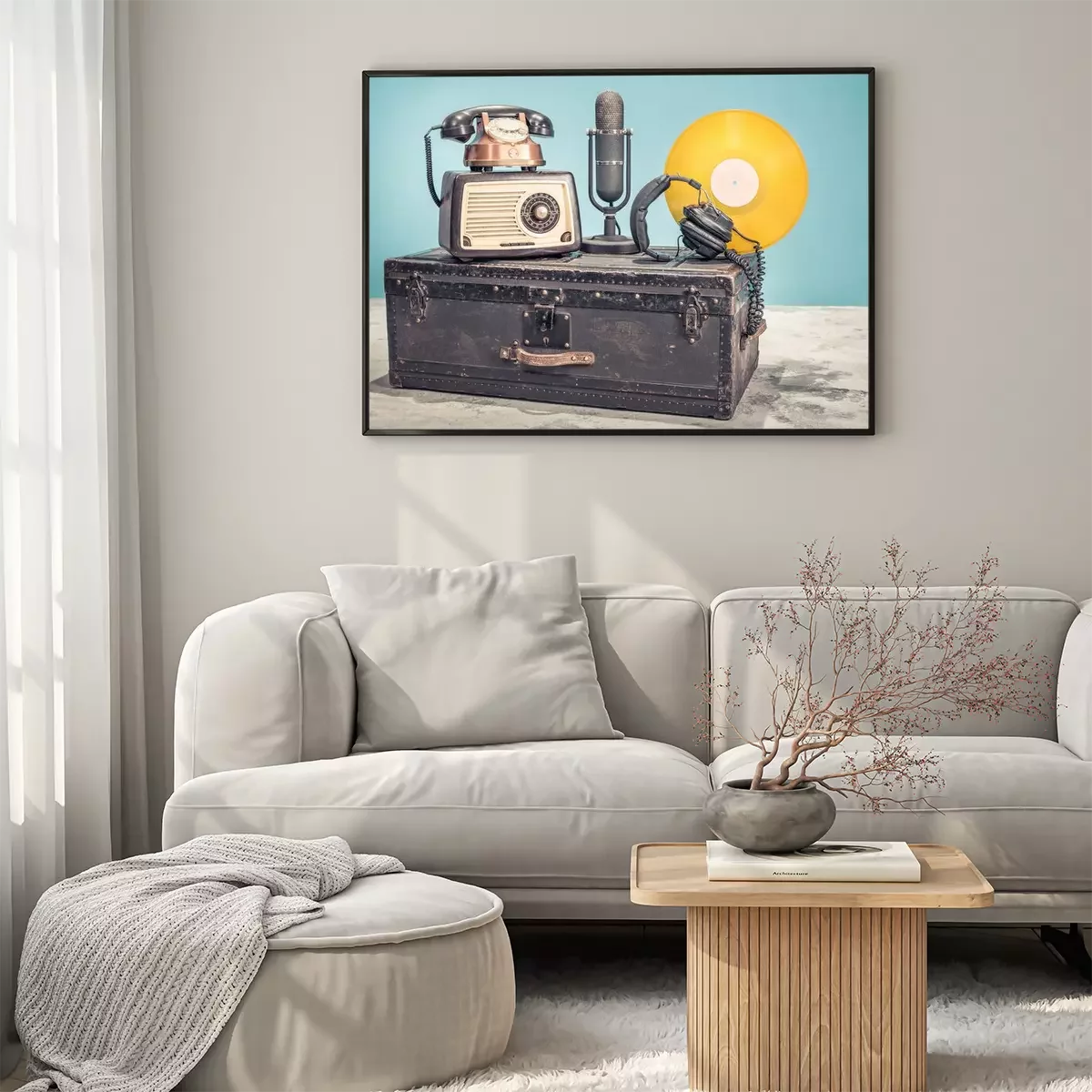 Poster Retro radio uit de jaren 60, oude koperen telefoon, studiomicrofoon uit de jaren 50 en goudkleurige vinylschijf opnemen circa 70s, koptelefoon op oude klassieke reiskoffer. Vintage stijl gefilterde fo