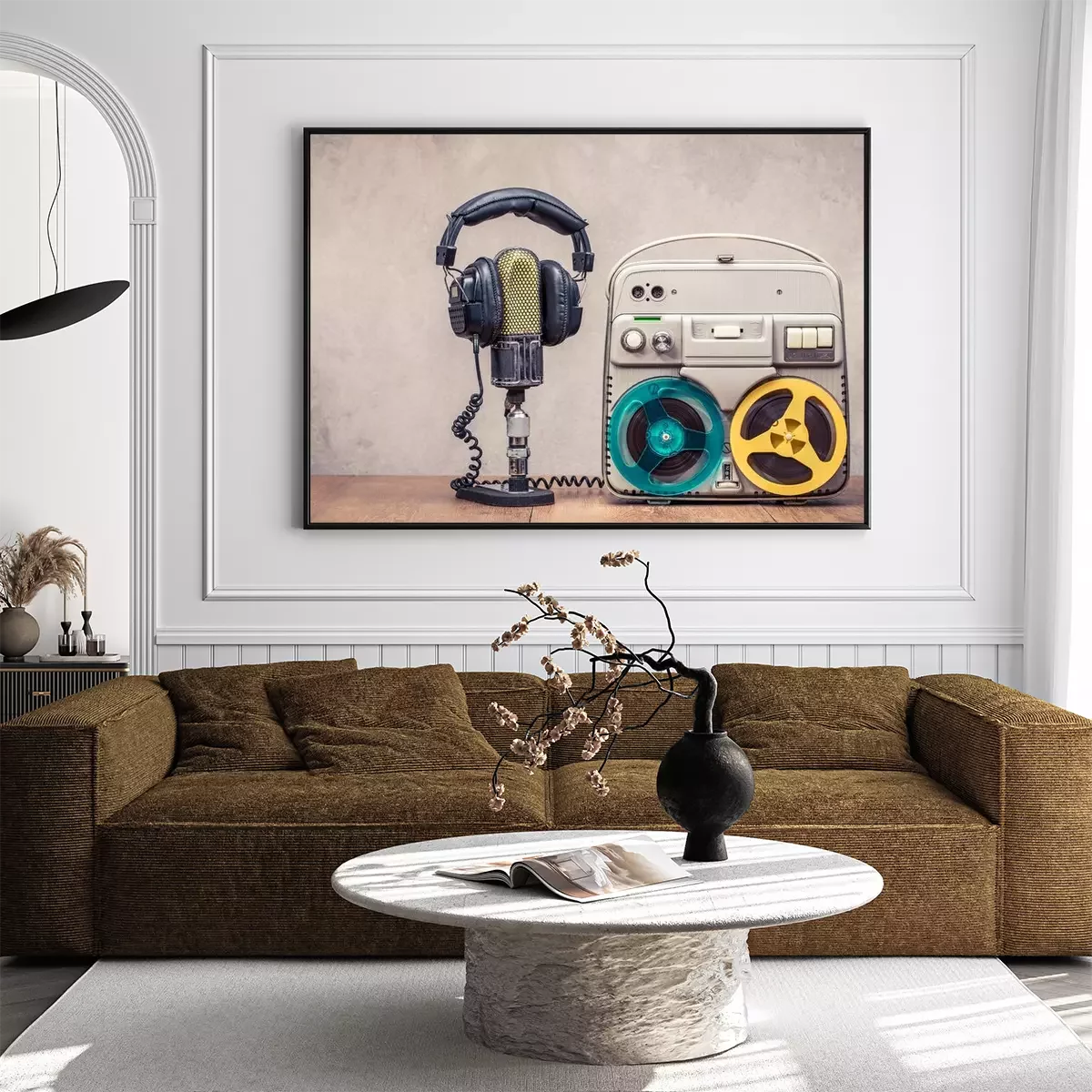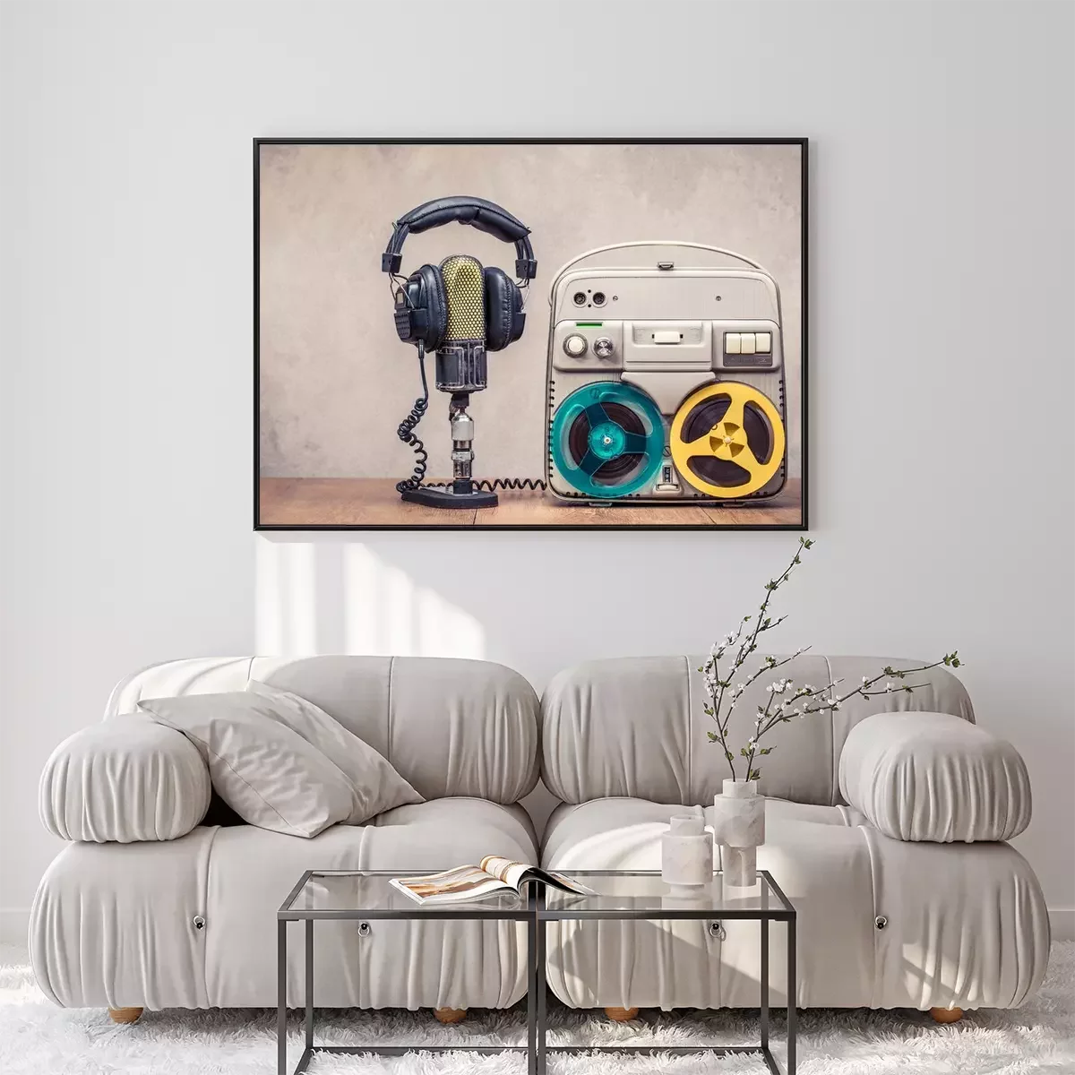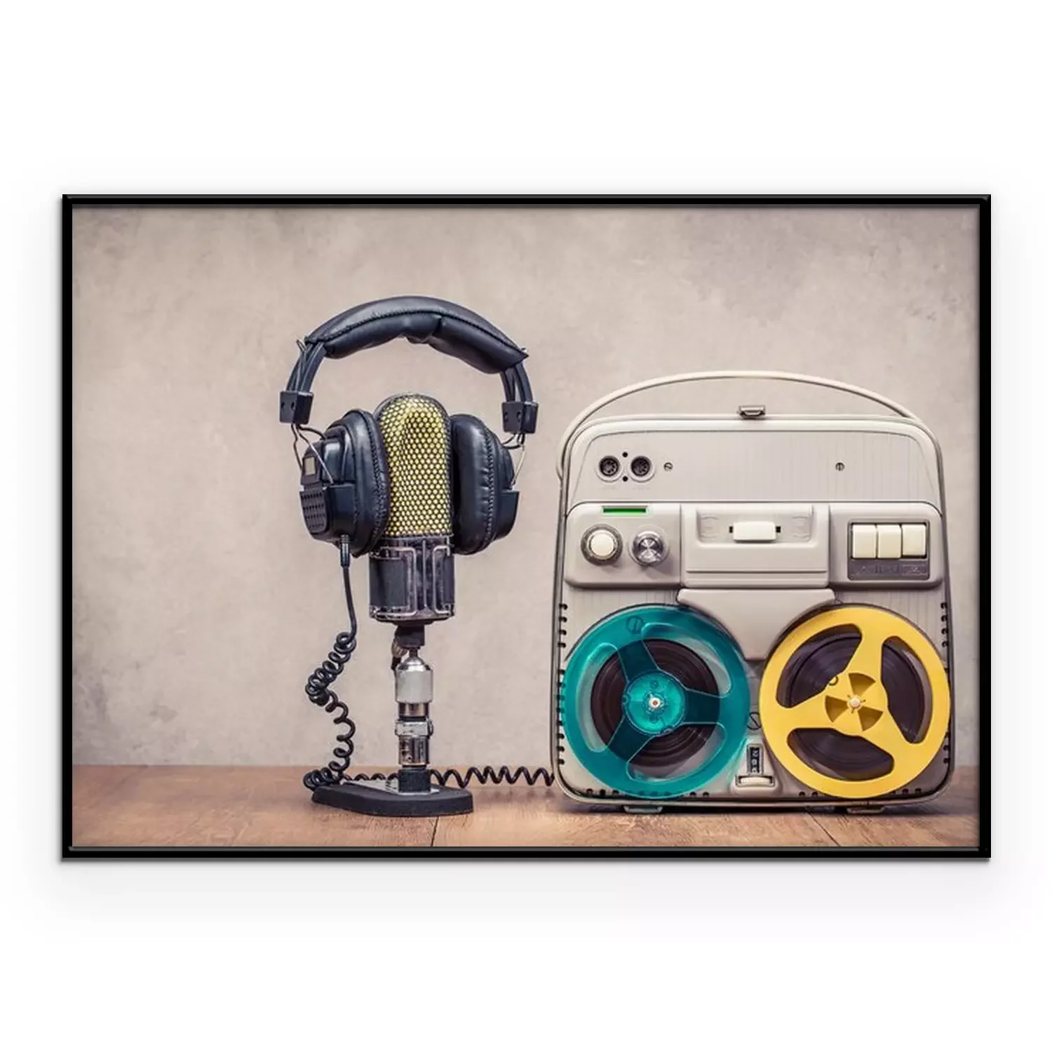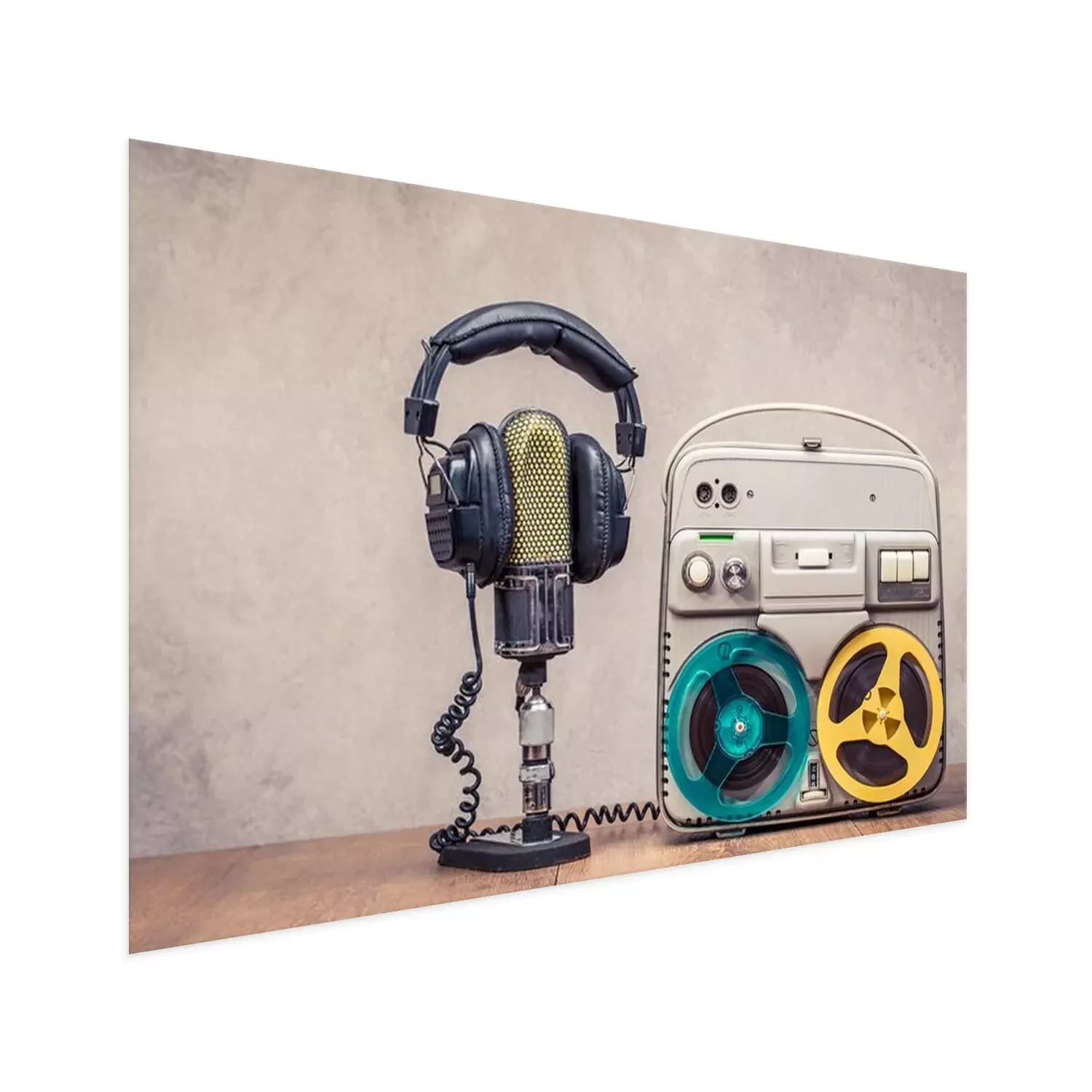 Poster: Retro spoel om de bandrecorder circa 60s te spoelen, microfoon en koptelefoon op houten tafel voorkant betonnen muurachtergrond. Vintage stijl gefiltreerde foto