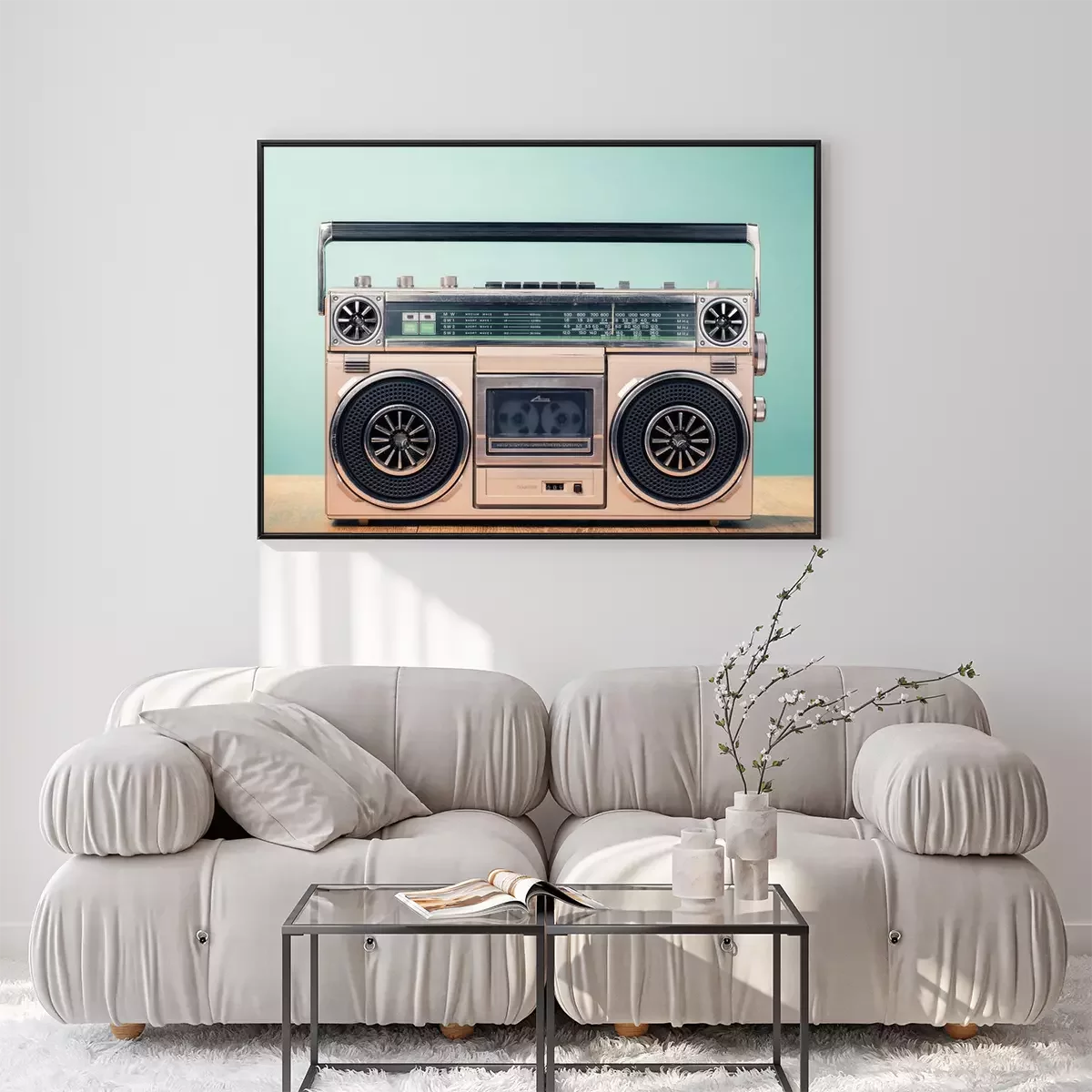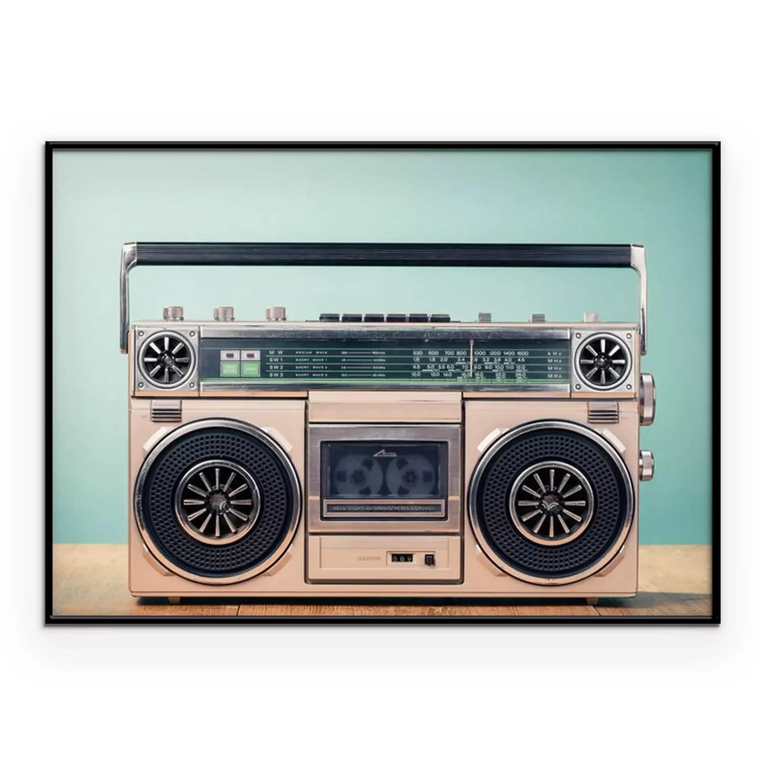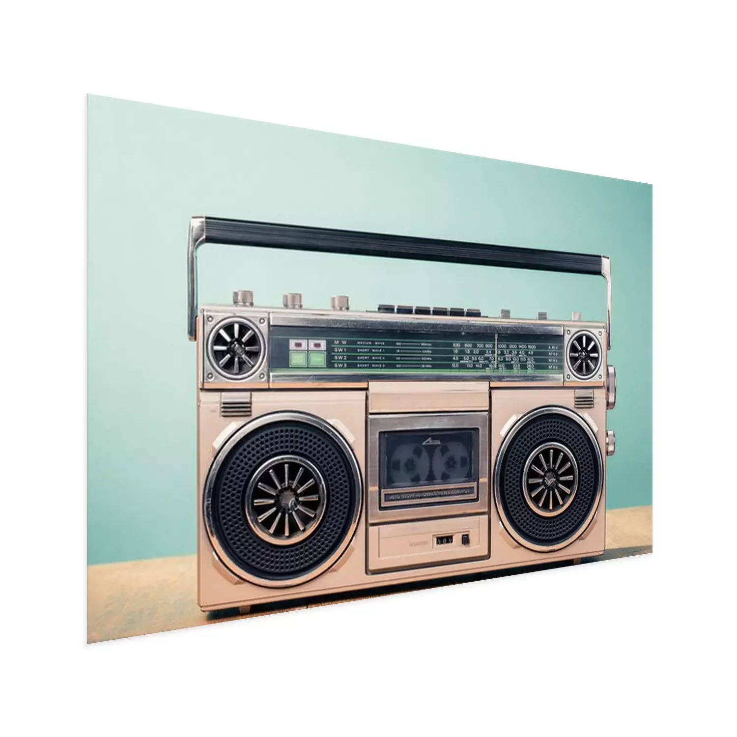 Poster: Retro verouderde cassette tape recorder uit de jaren 80 op tafel voor mint groene achtergrond. Vintage oude stijl gefiltreerde foto