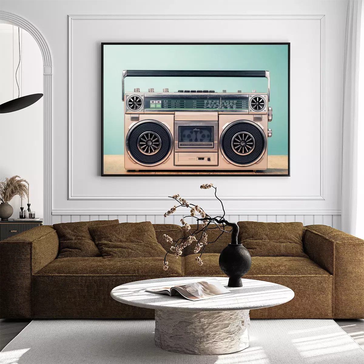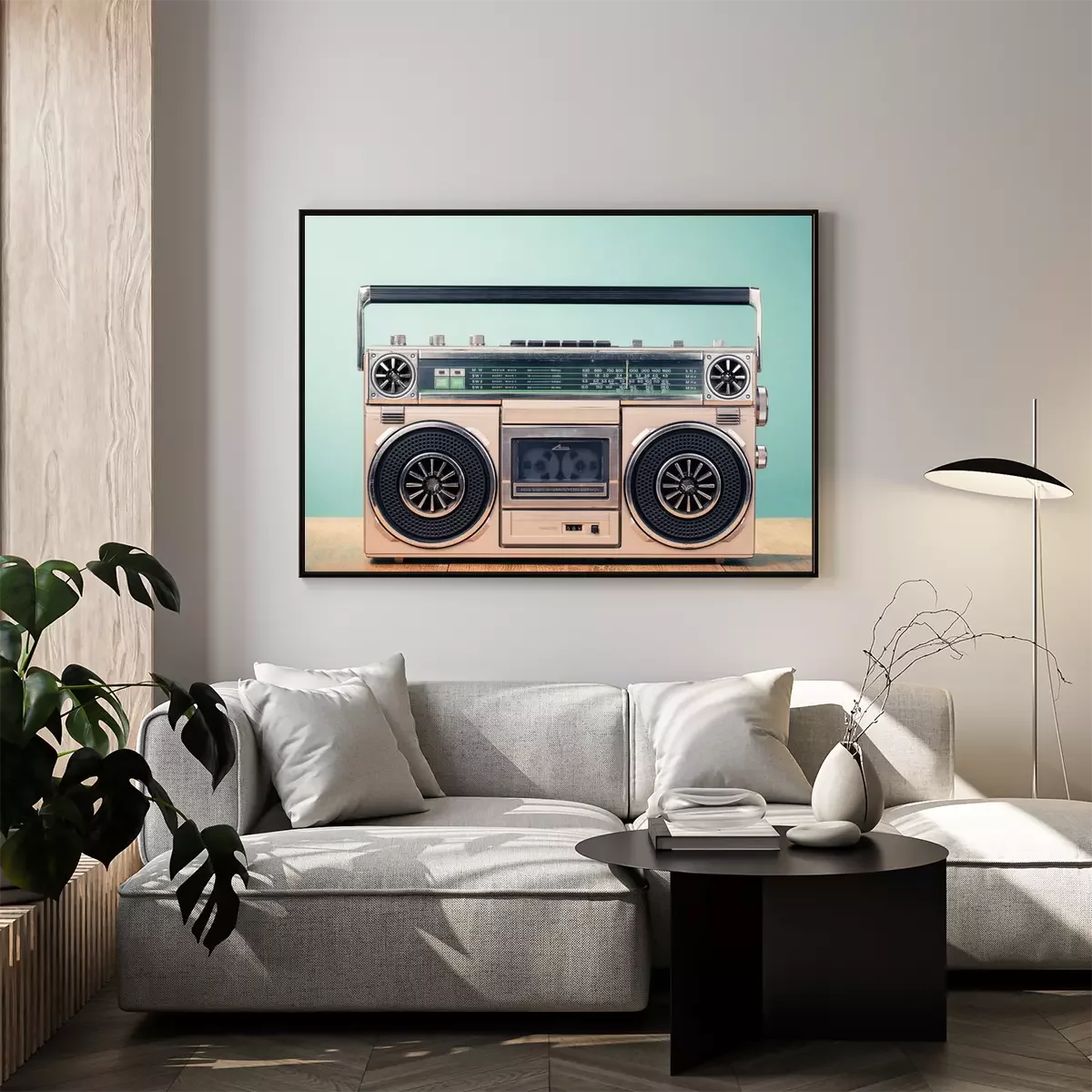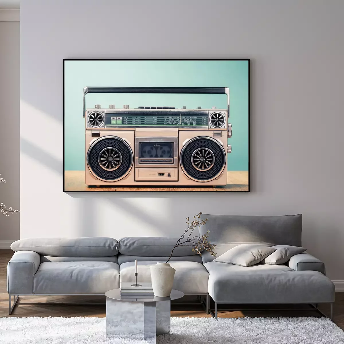 Poster: Retro verouderde cassette tape recorder uit de jaren 80 op tafel voor mint groene achtergrond. Vintage oude stijl gefiltreerde foto