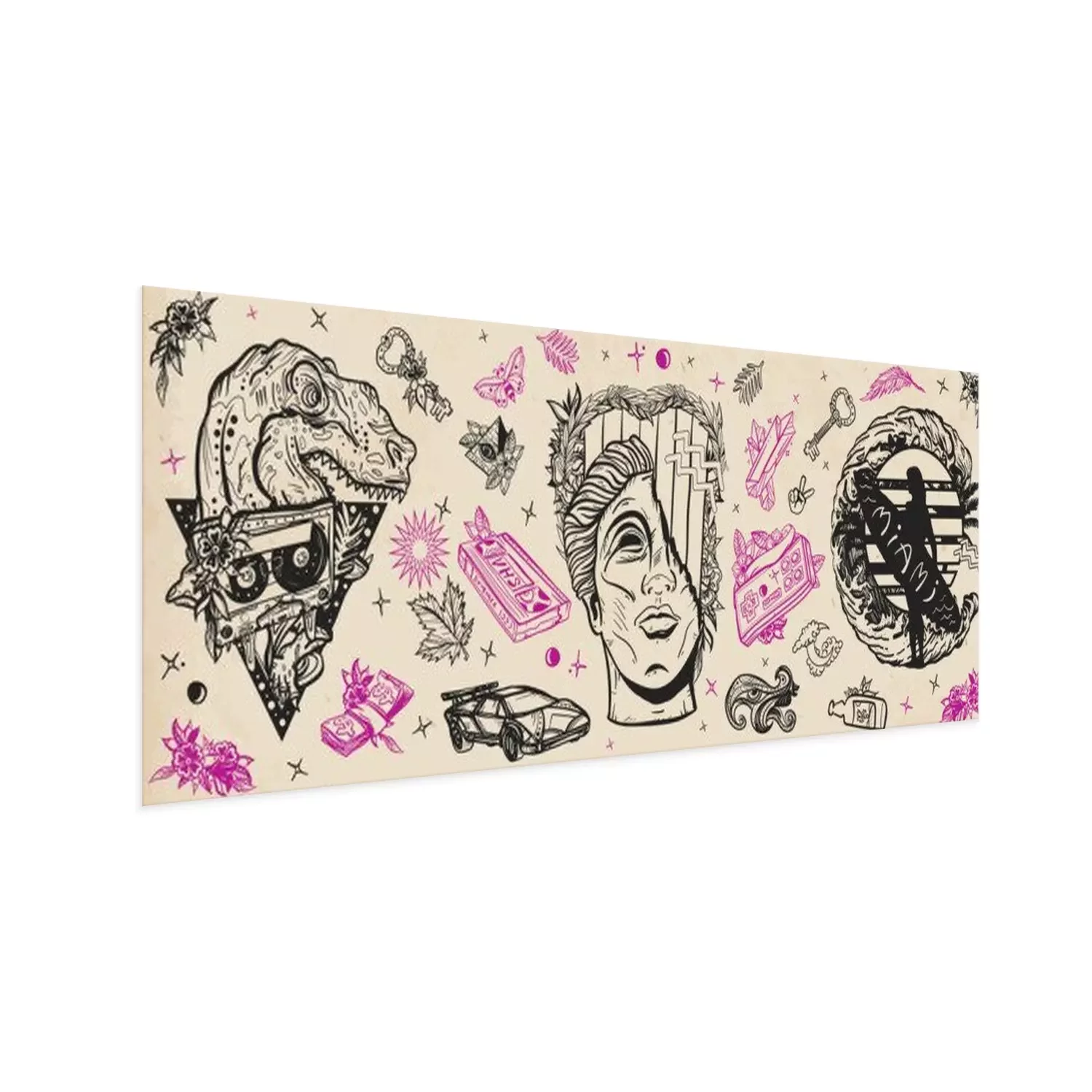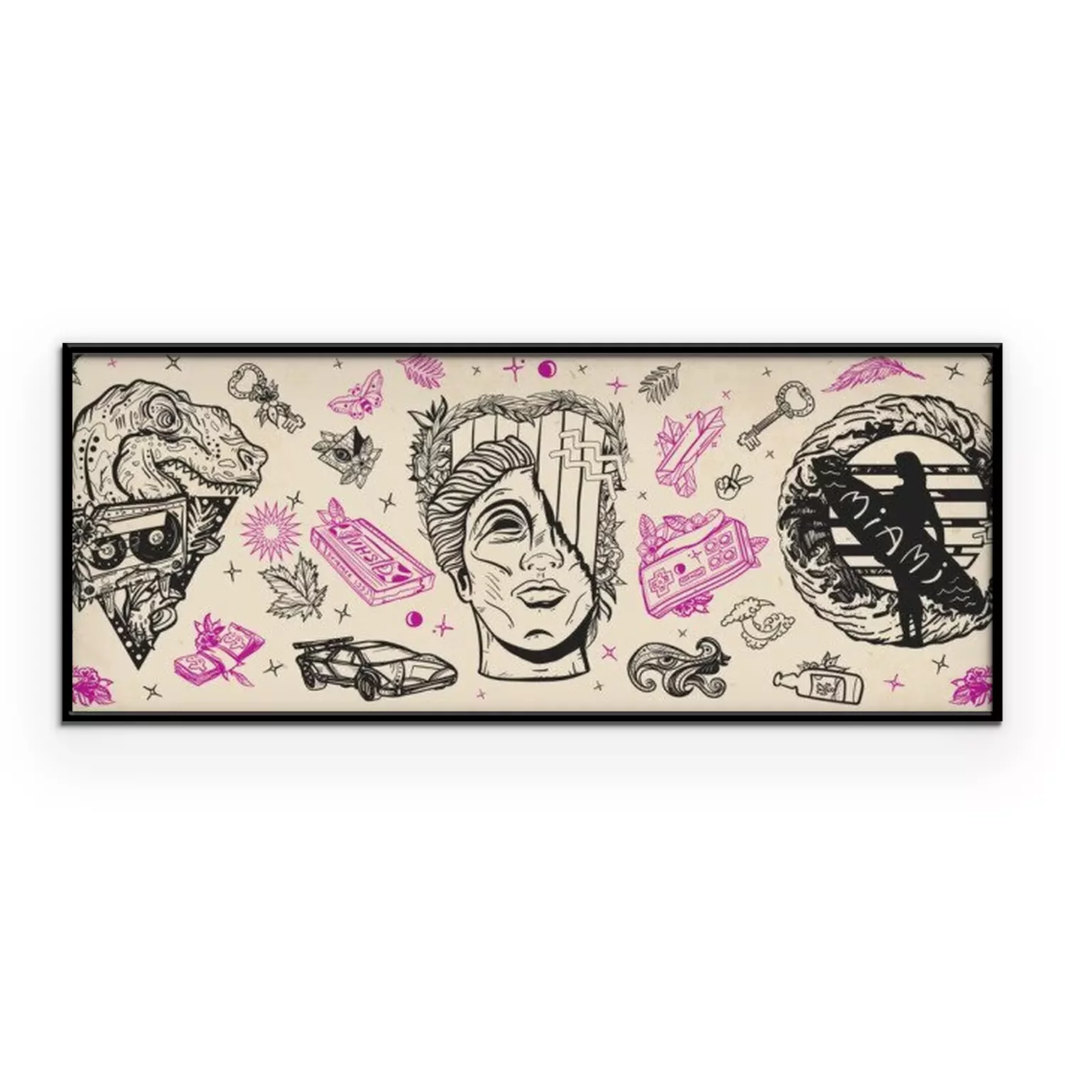 Poster: Retro wave music concept. Statue head, laser tyrannosaur, surfing woman, future car. Audio cassette, VHS type. Nostalgic cyberpunk style, 80s and 90s pop culture. Old school tattoo vector collection