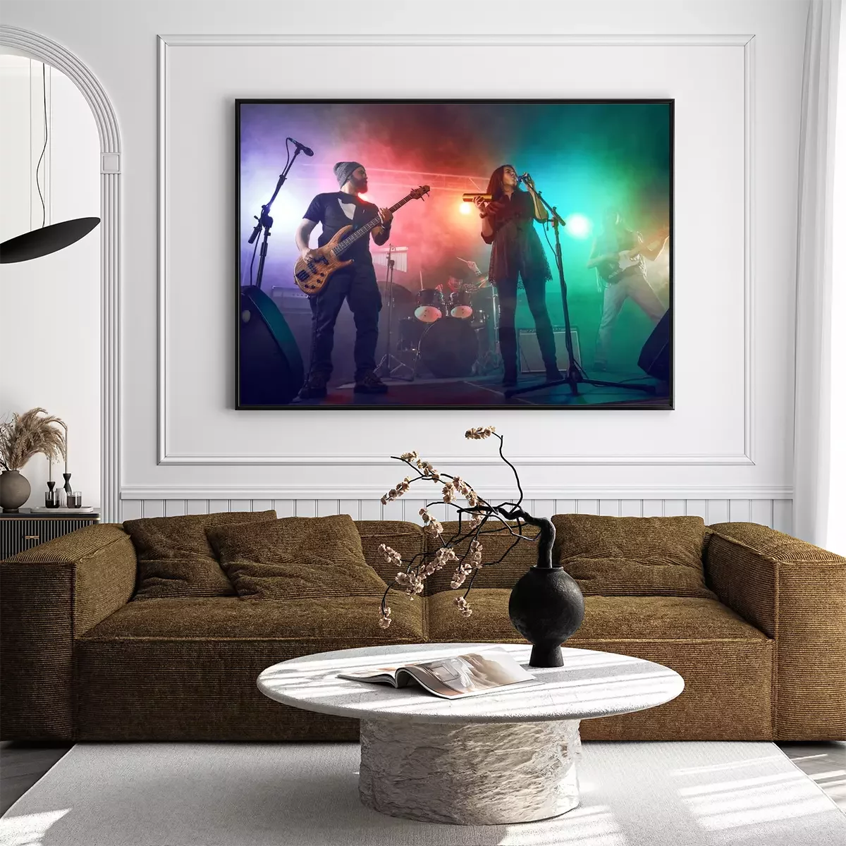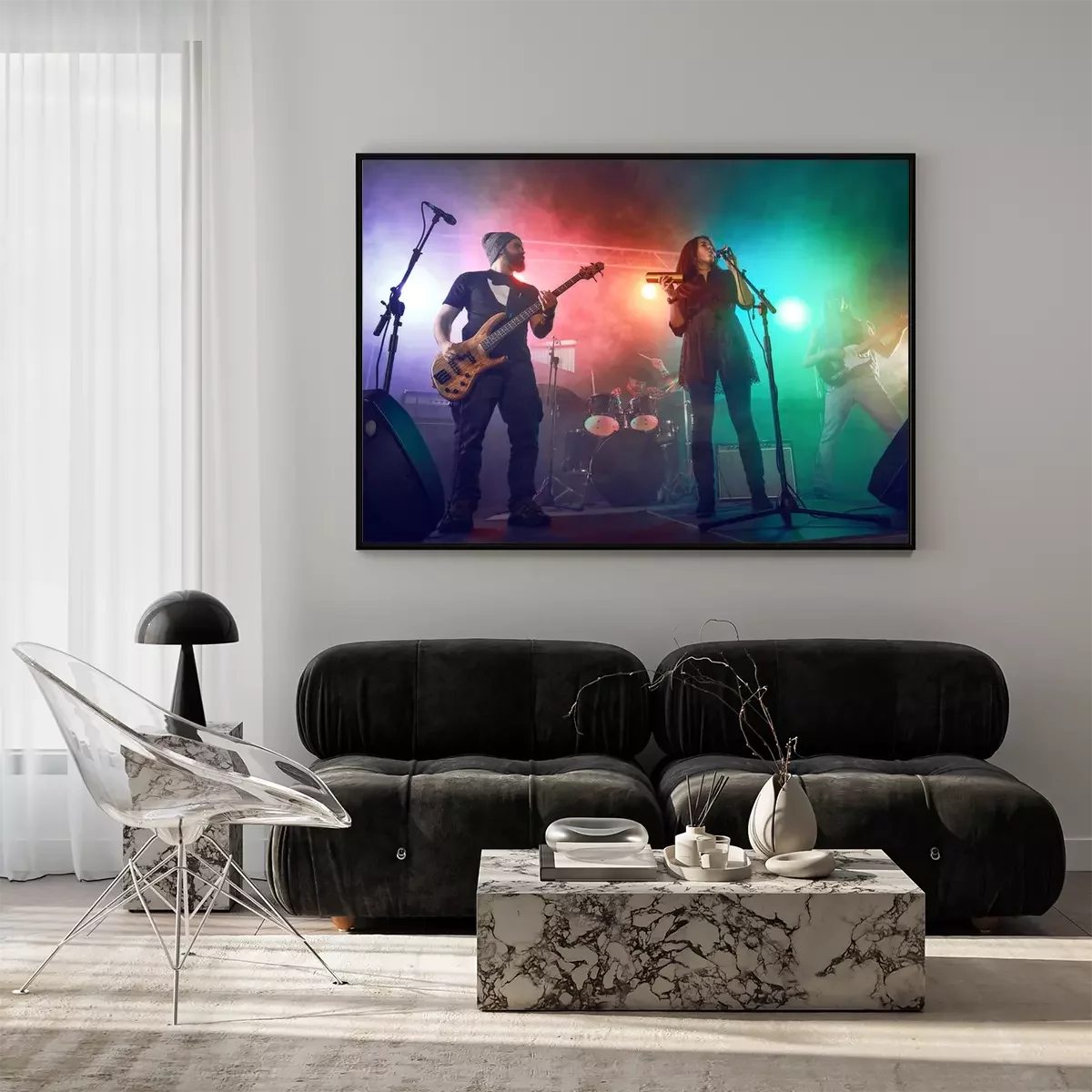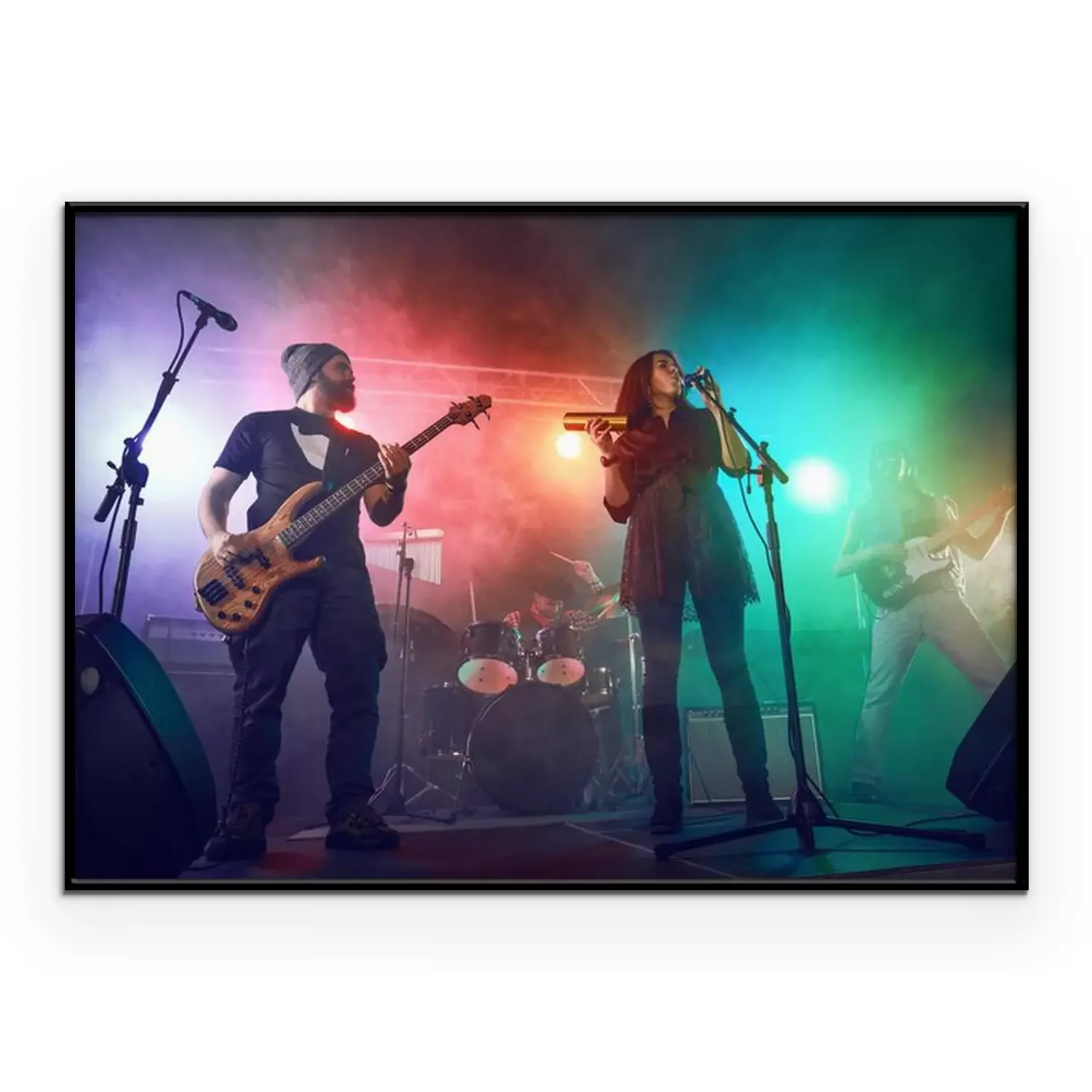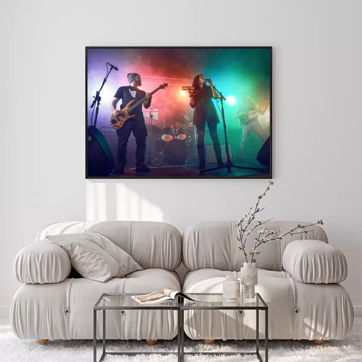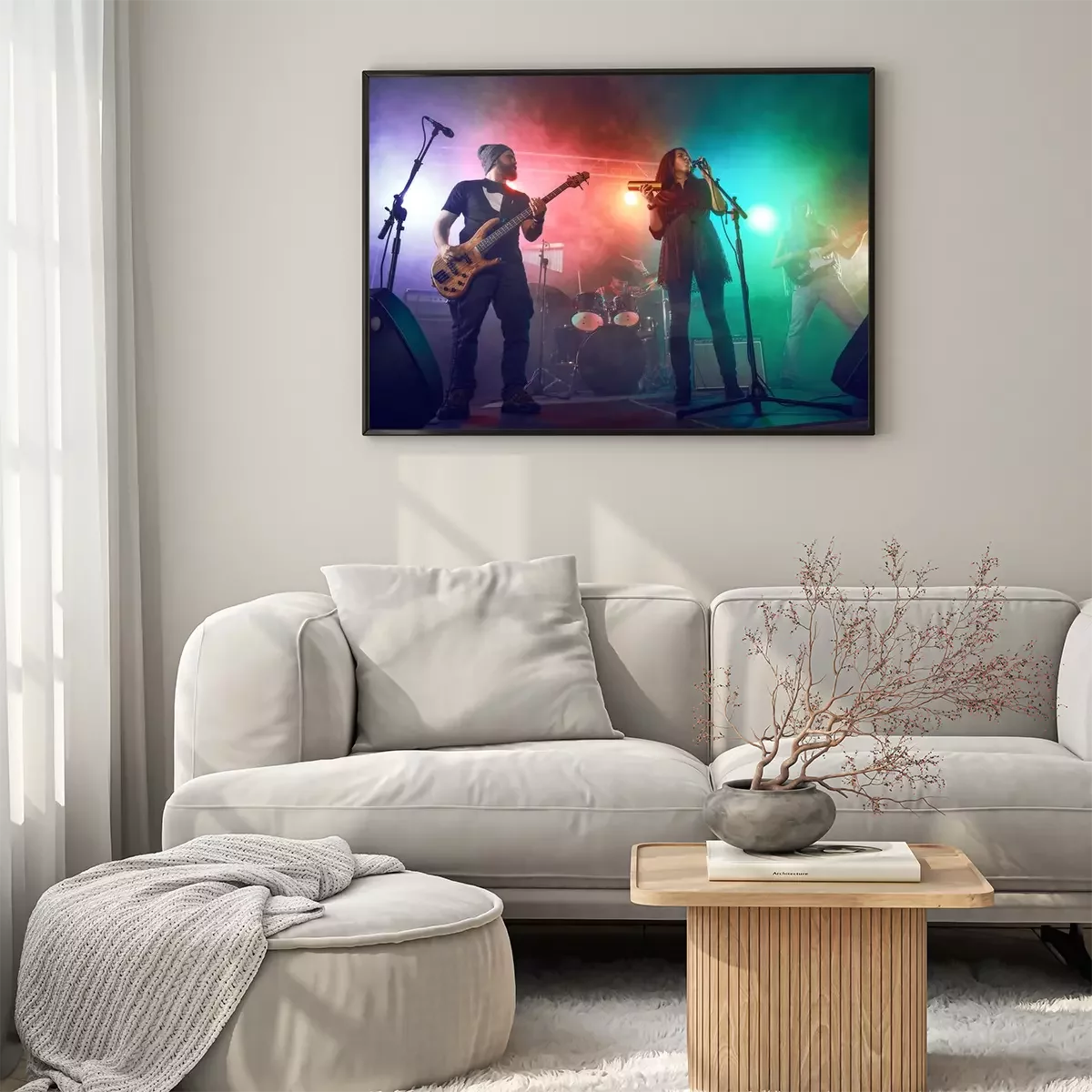 Poster: Rock band performs on stage. Guitarist, bass guitar and drums.