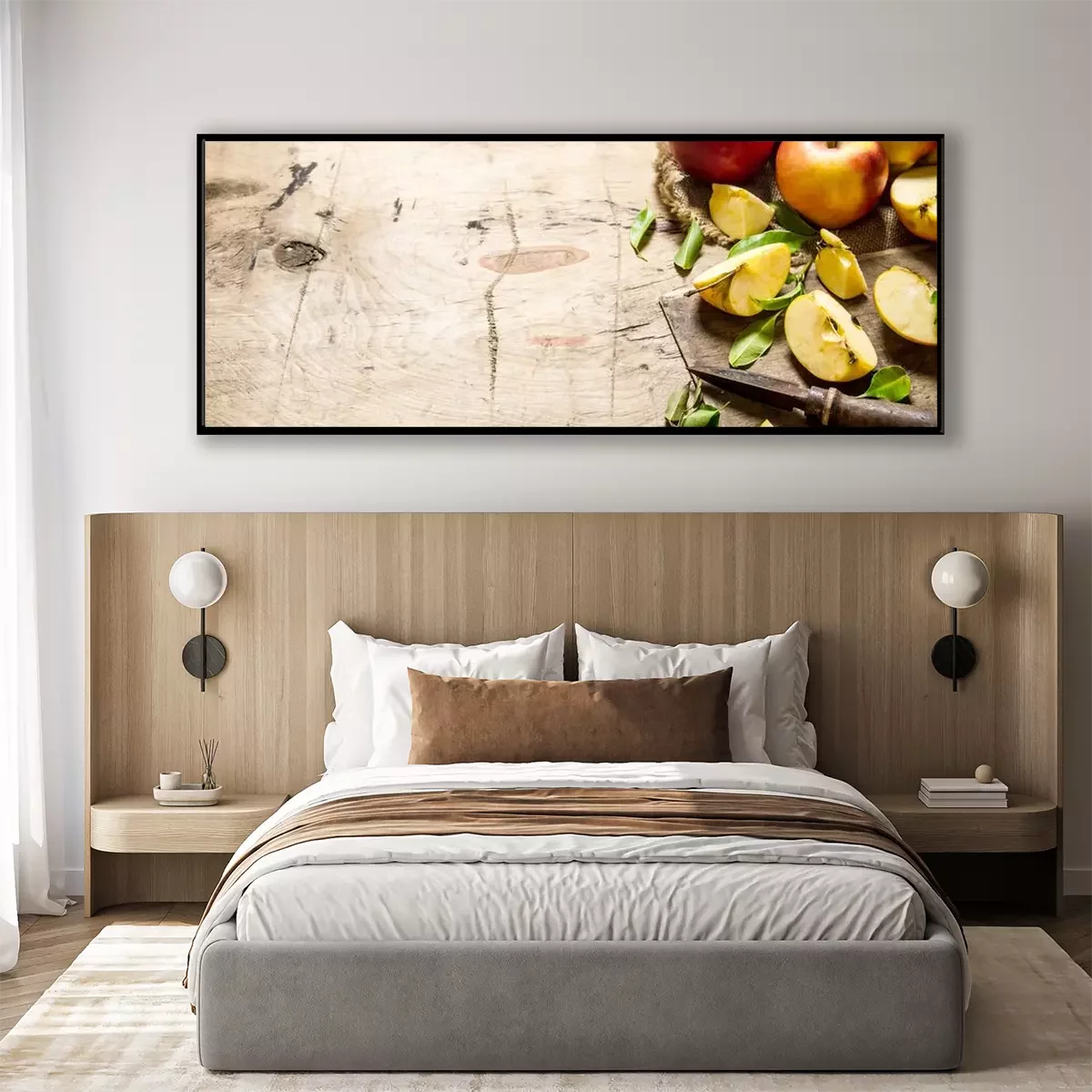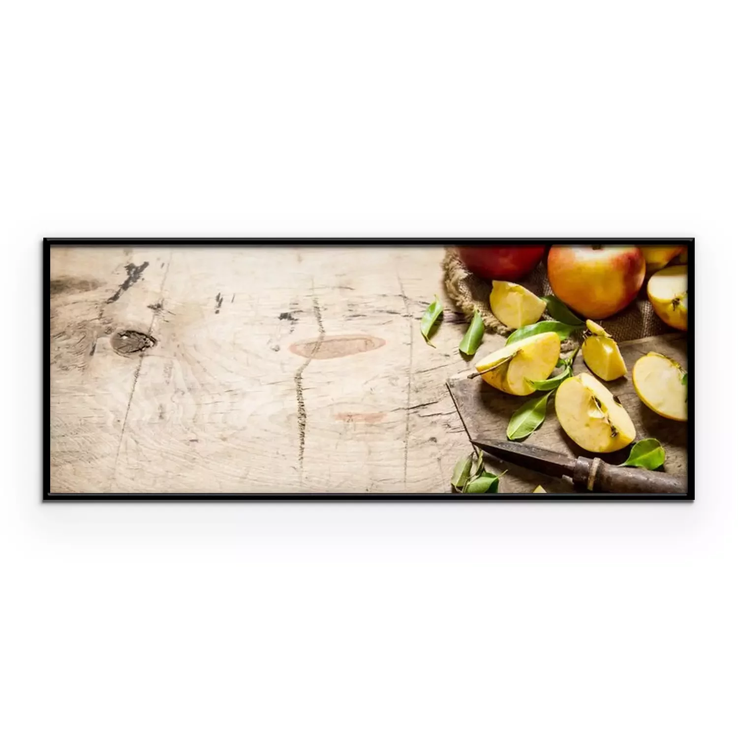 Poster: Rode appels gesneden met een mes. Vrije ruimte voor tekst.
