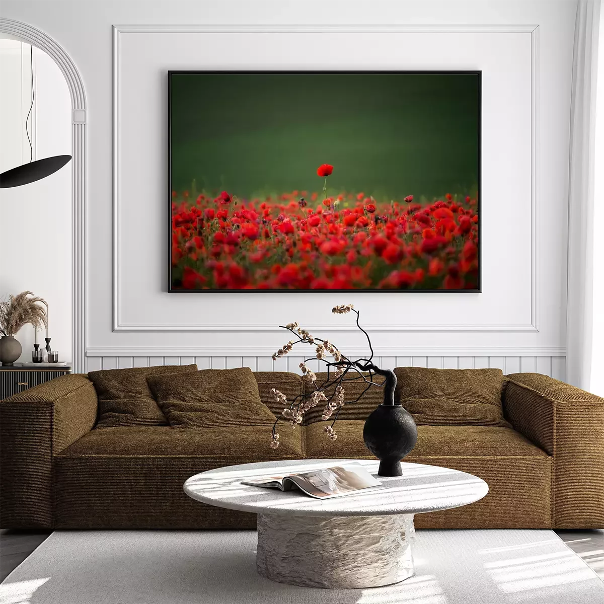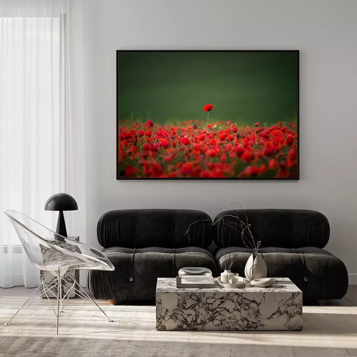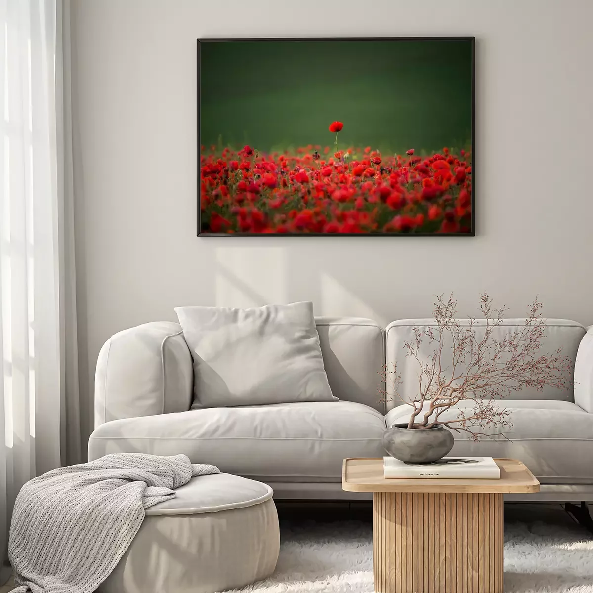 Poster: Rode papavers die een groene weide bedekken