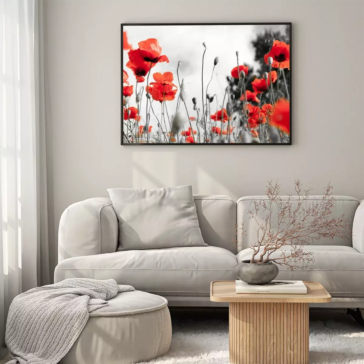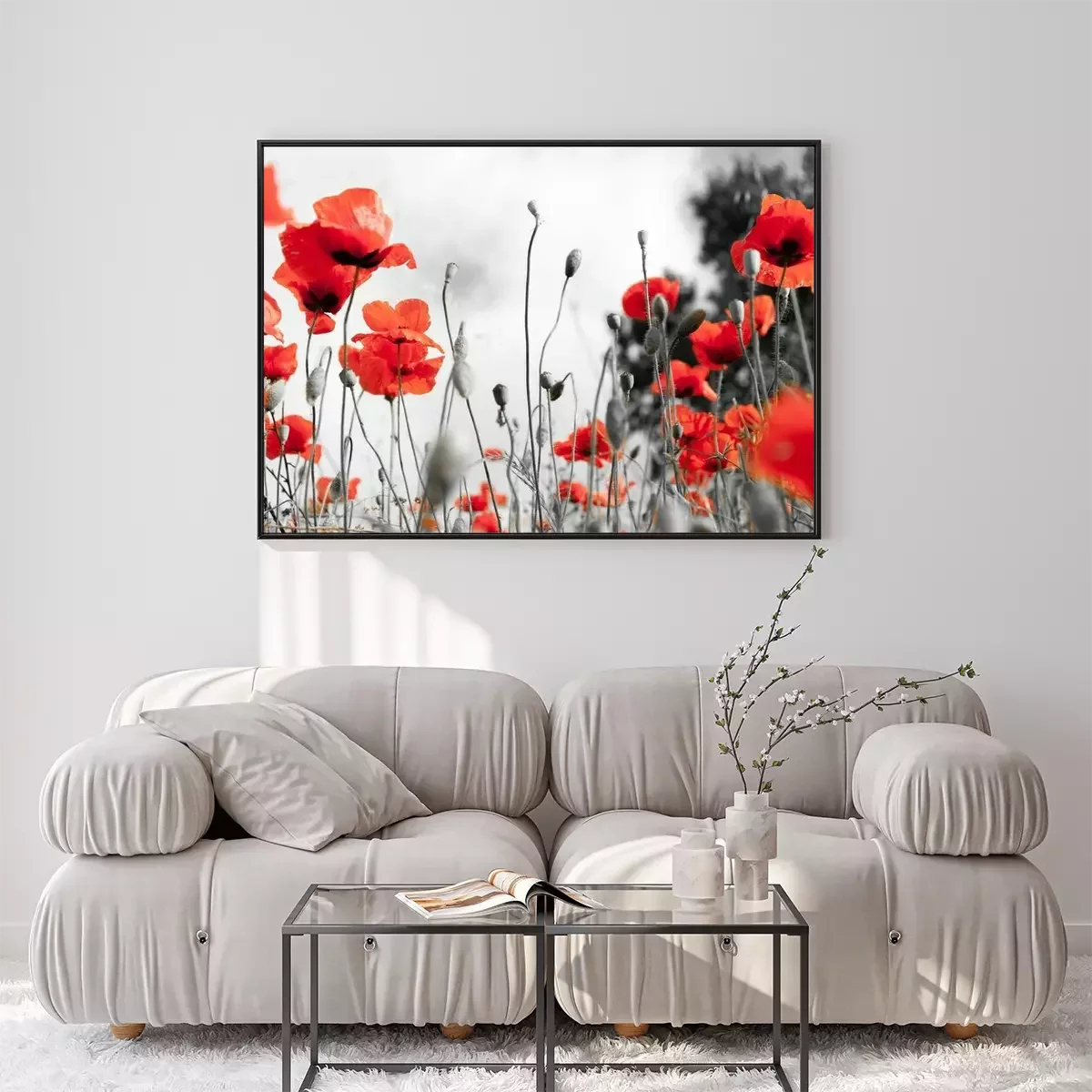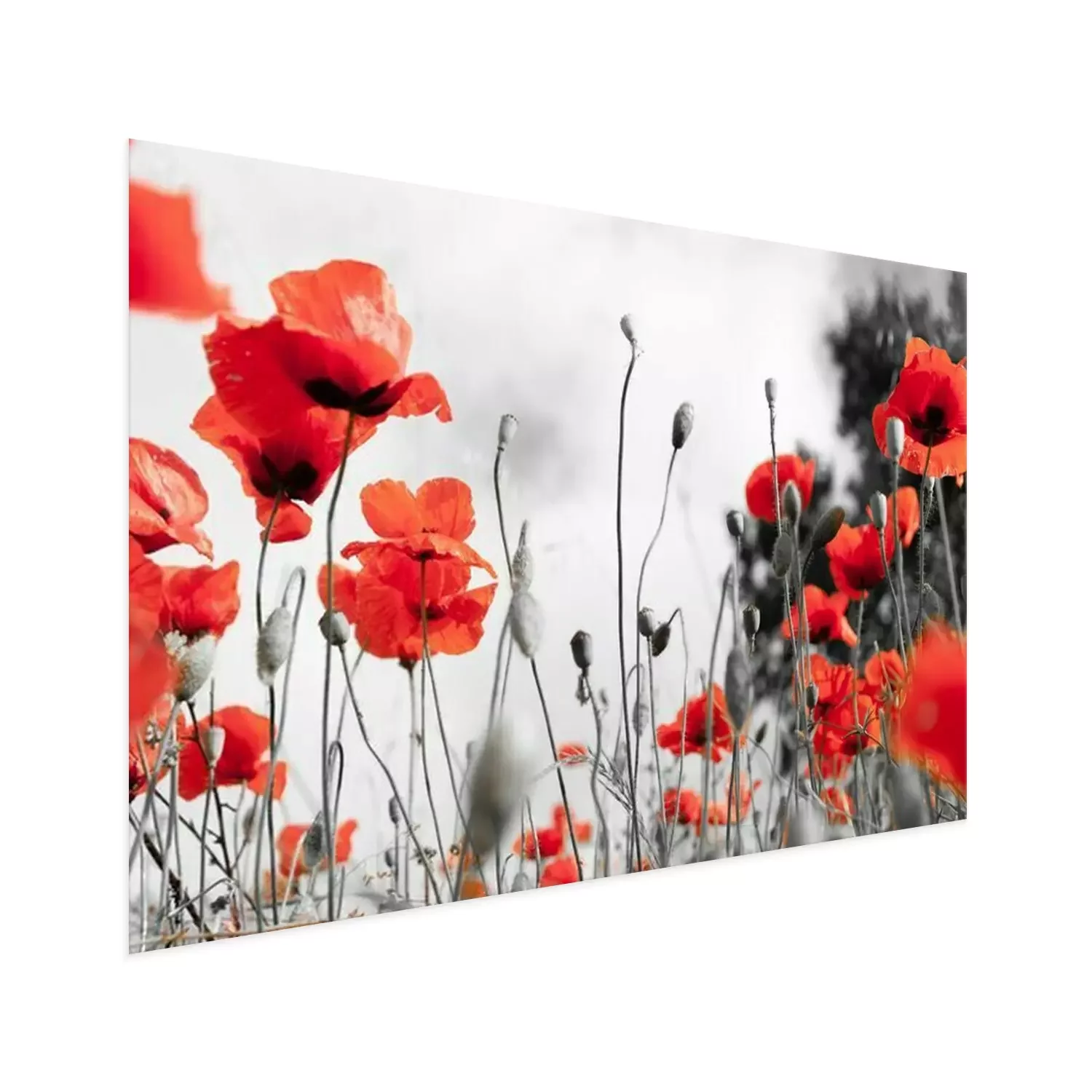 Poster: Rode papavers op de achtergrond van een zwart-witte weide
