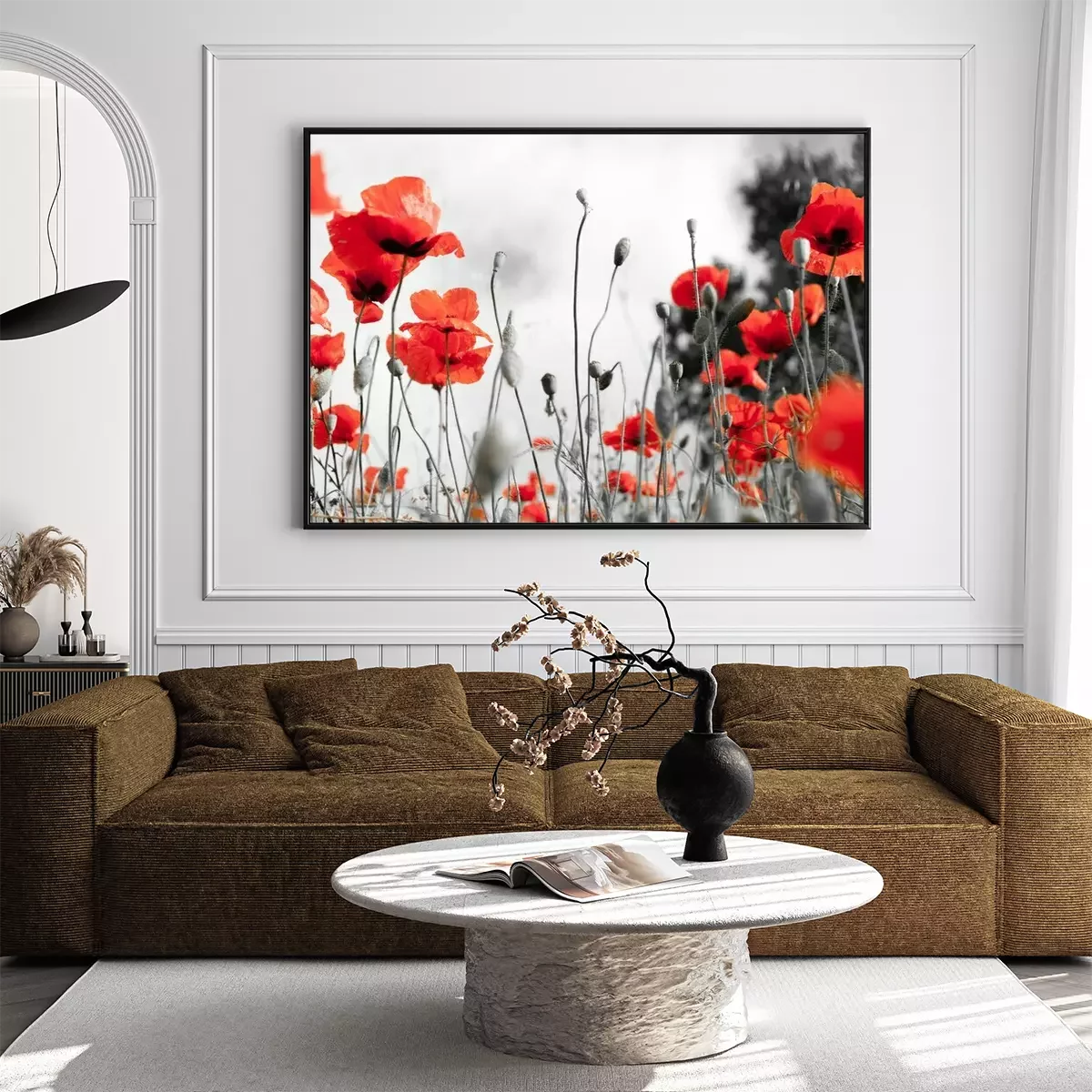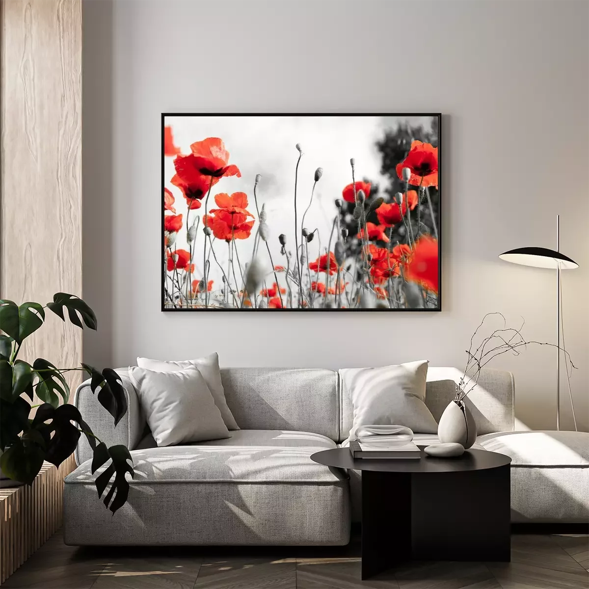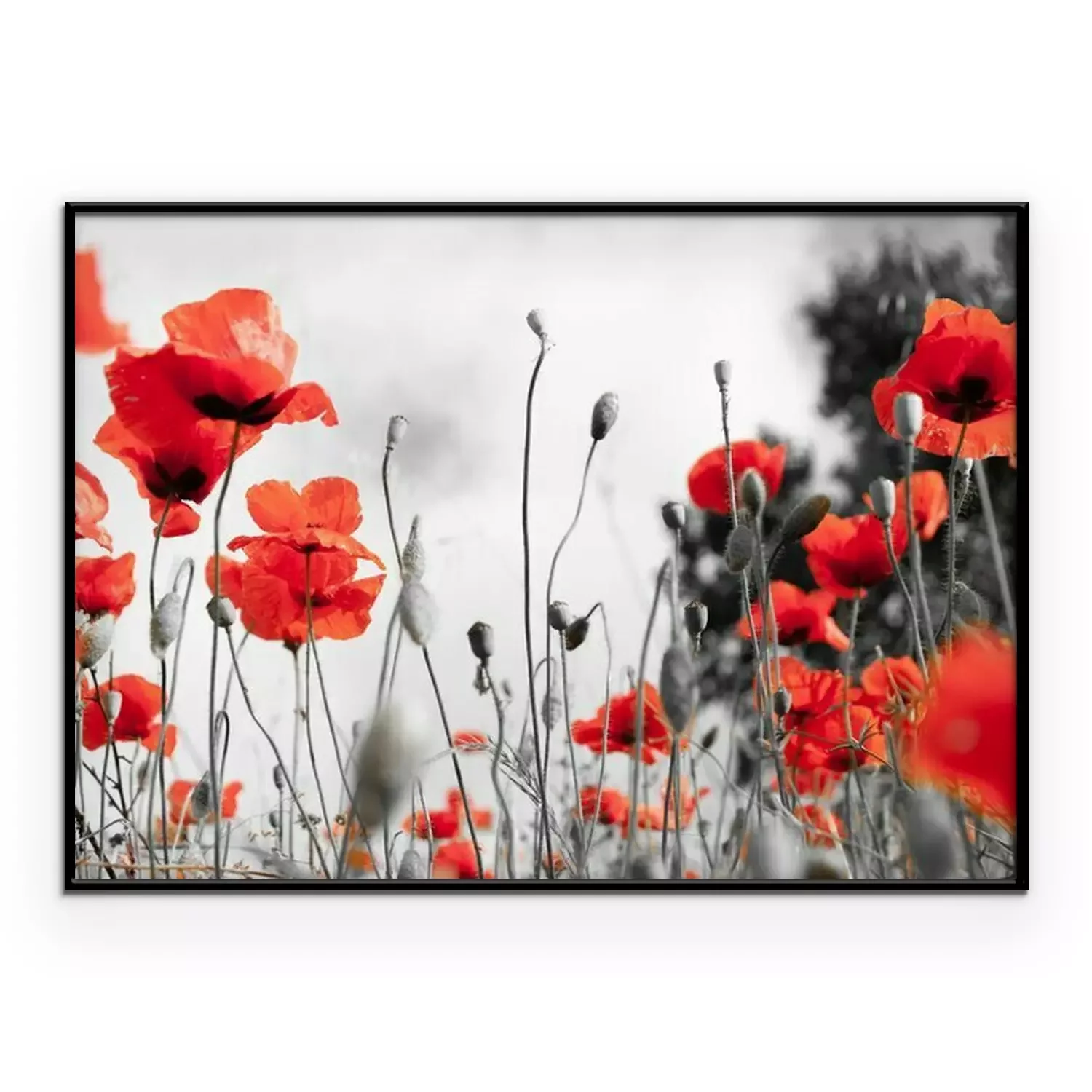 Poster: Rode papavers op de achtergrond van een zwart-witte weide