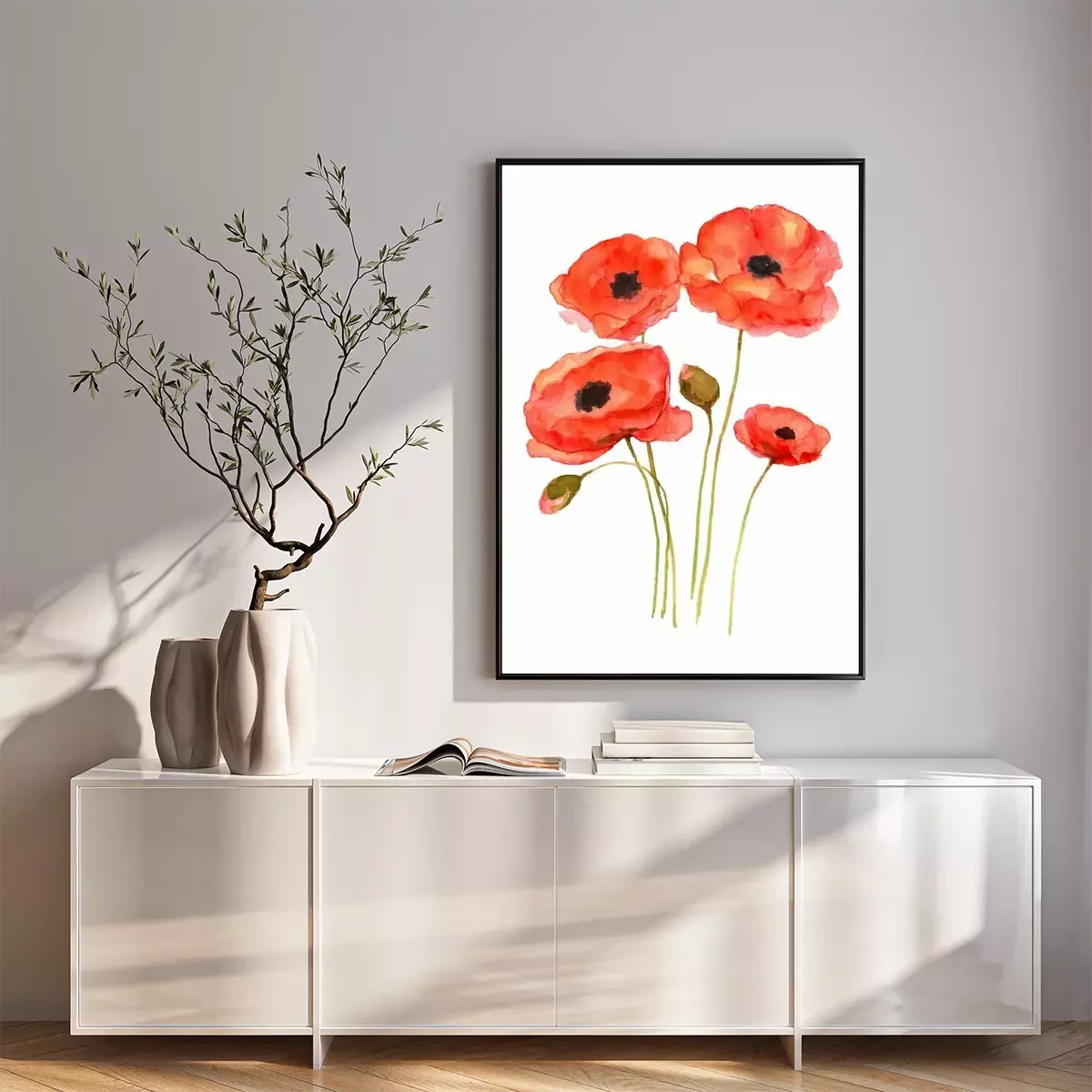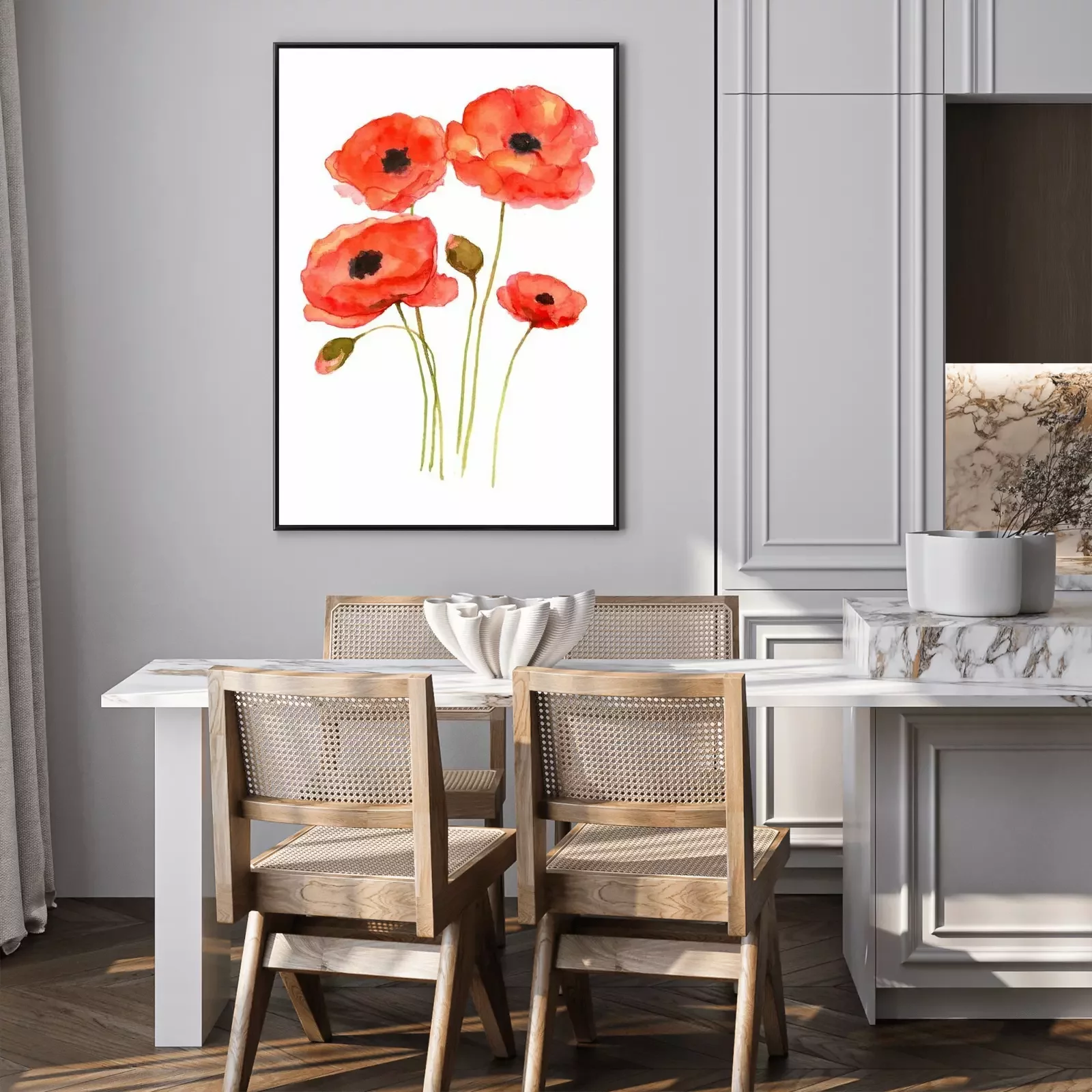 Poster: Rode papavers op een wit gearceerde achtergrond