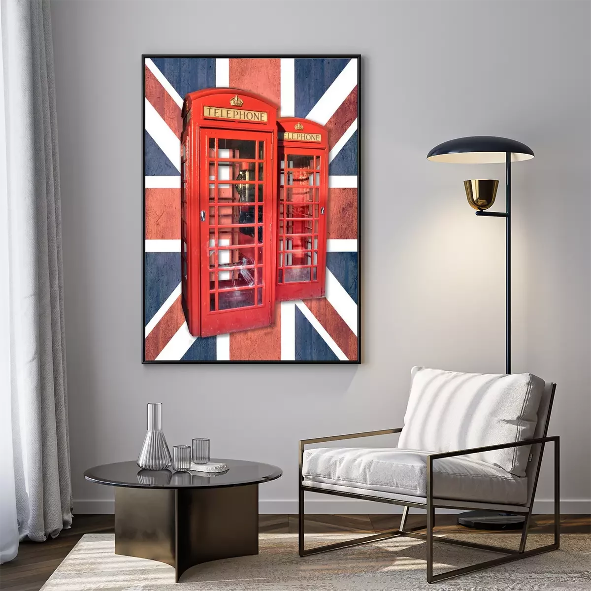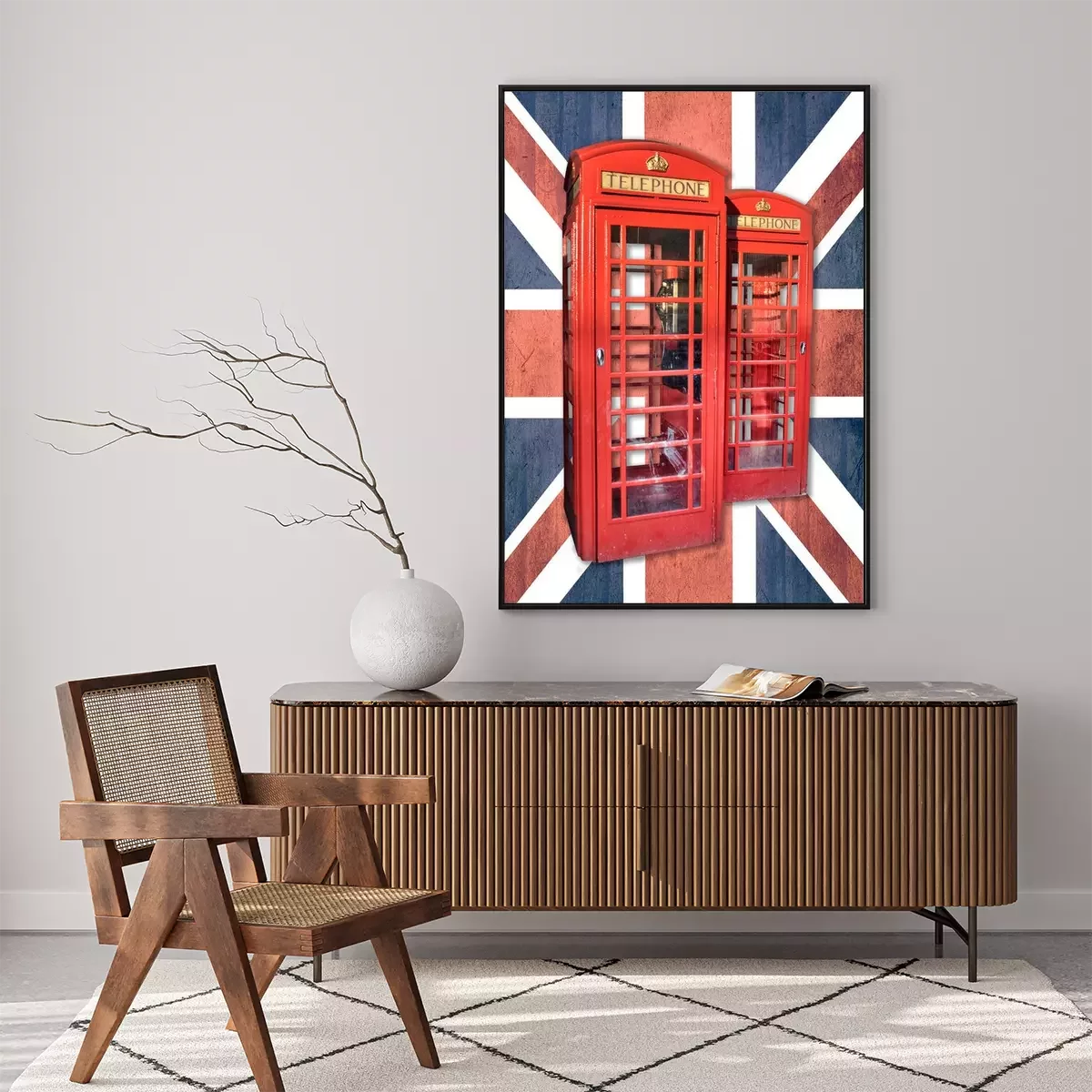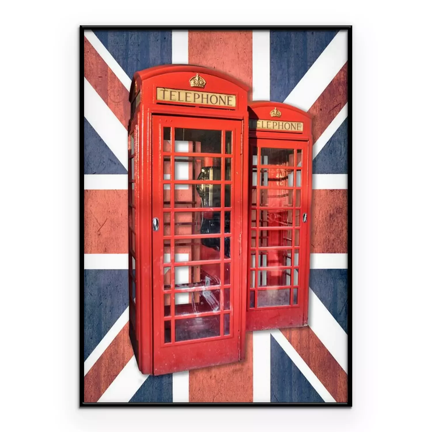 Poster: Rode telefooncellen op de achtergrond van de vlag