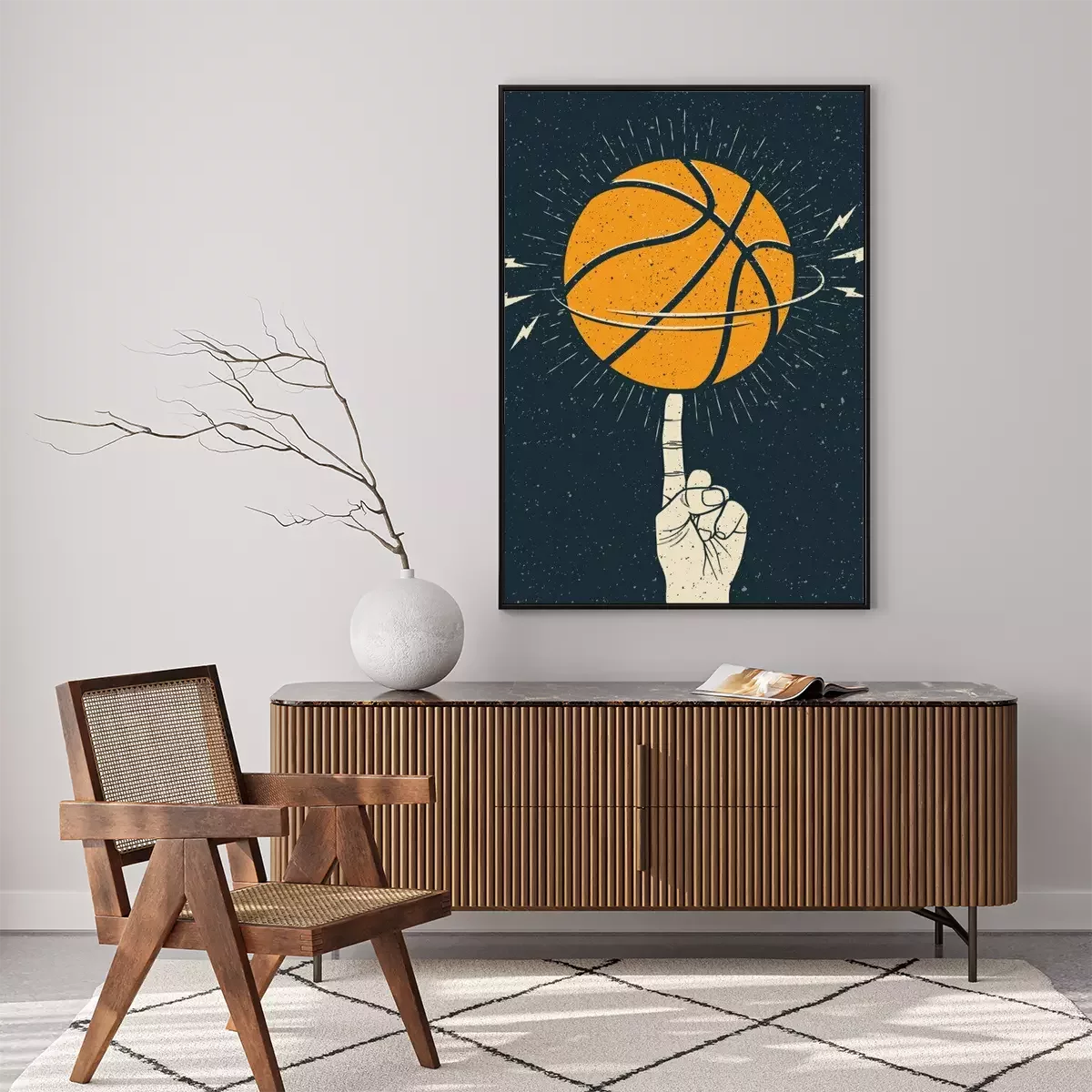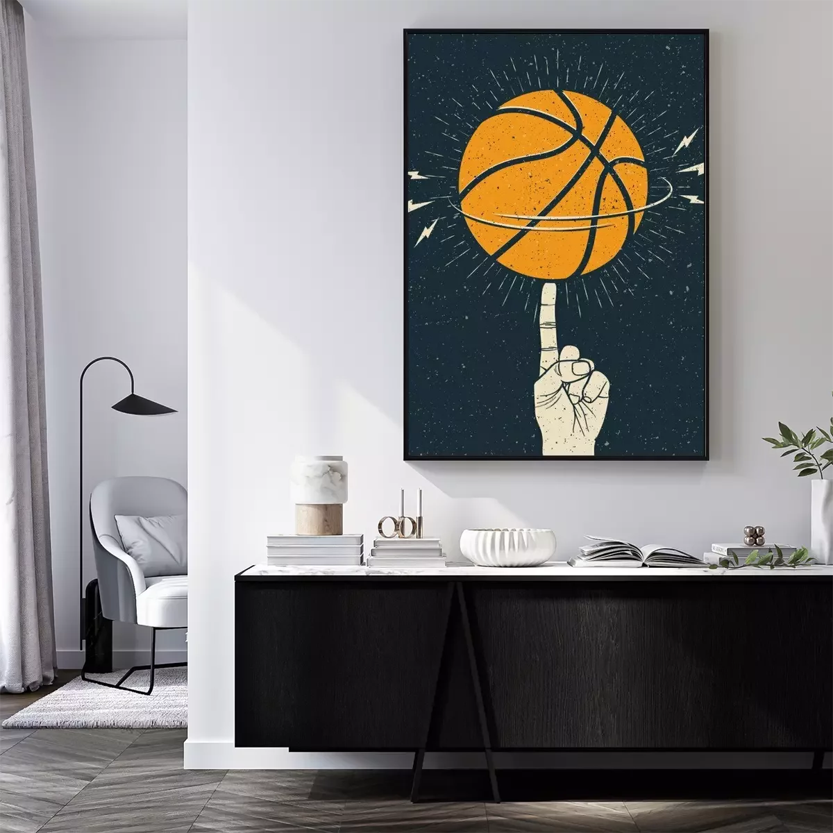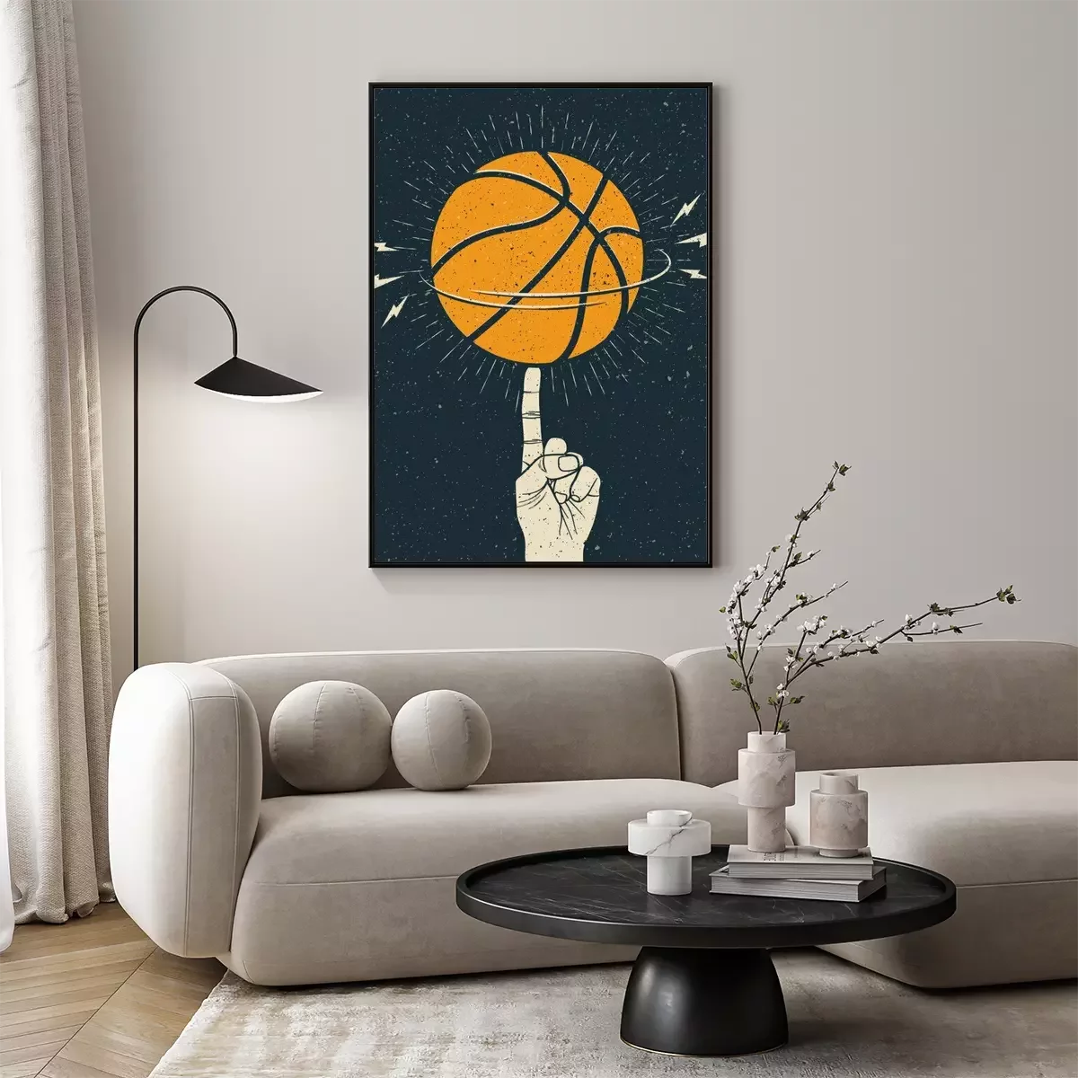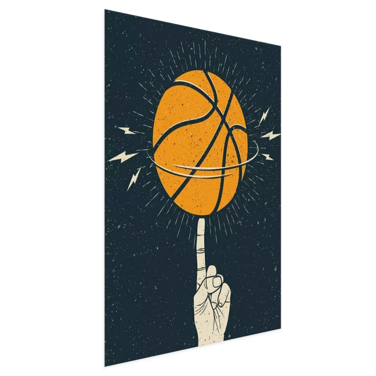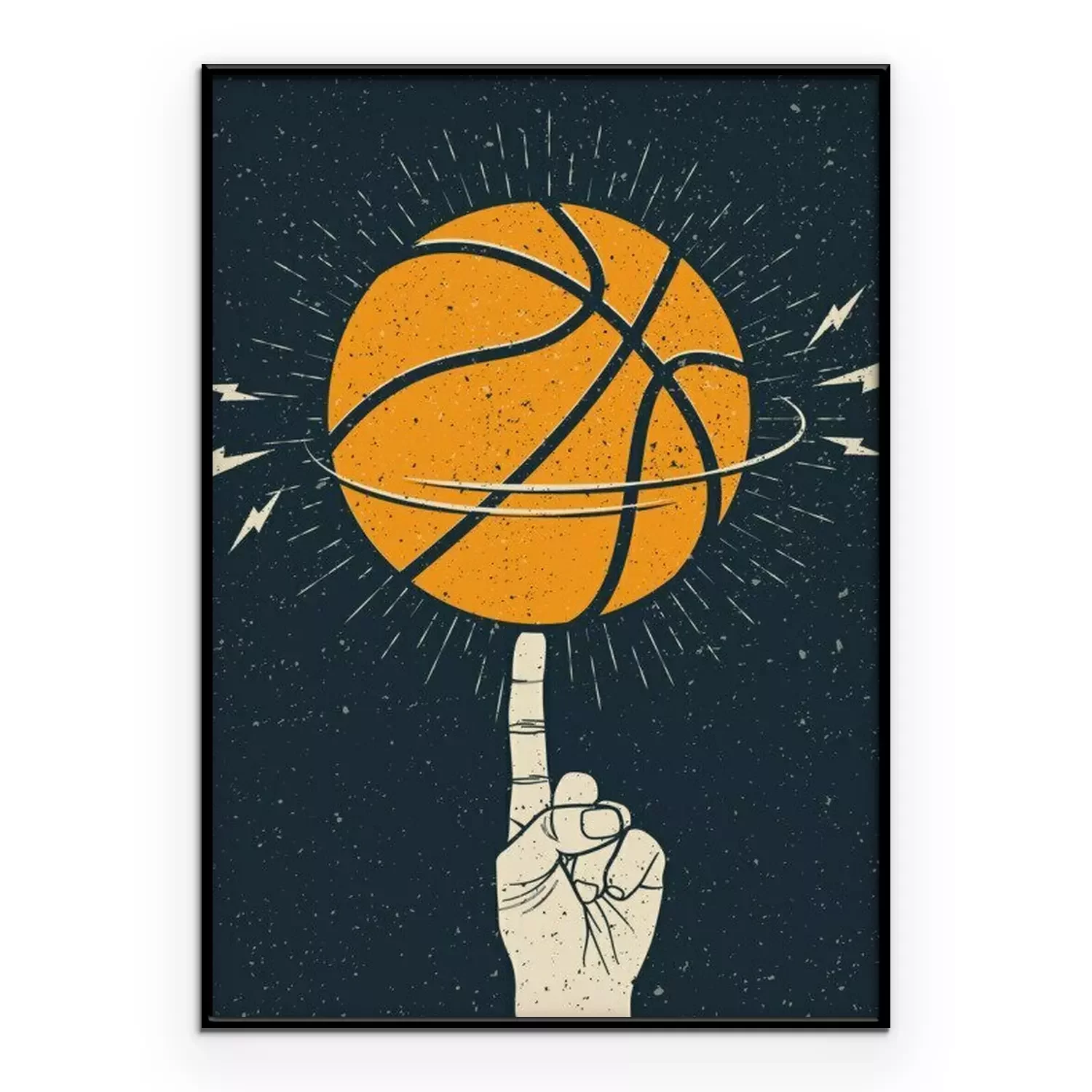 Poster Rotating orange basketball ball on a finger. Basketball themed illustration template for poster or flyer or sticker. Vintage styled vector illustration.