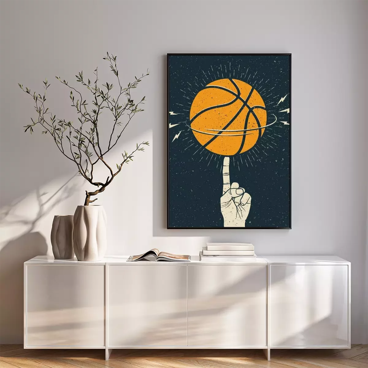 Poster: Rotating orange basketball ball on a finger. Basketball themed illustration template for poster or flyer or sticker. Vintage styled vector illustration.