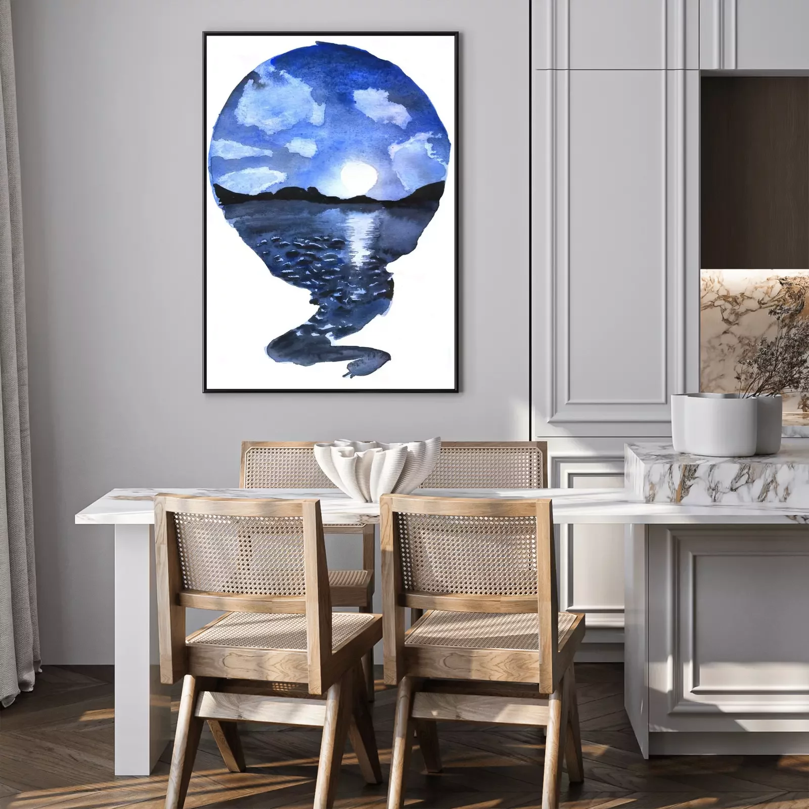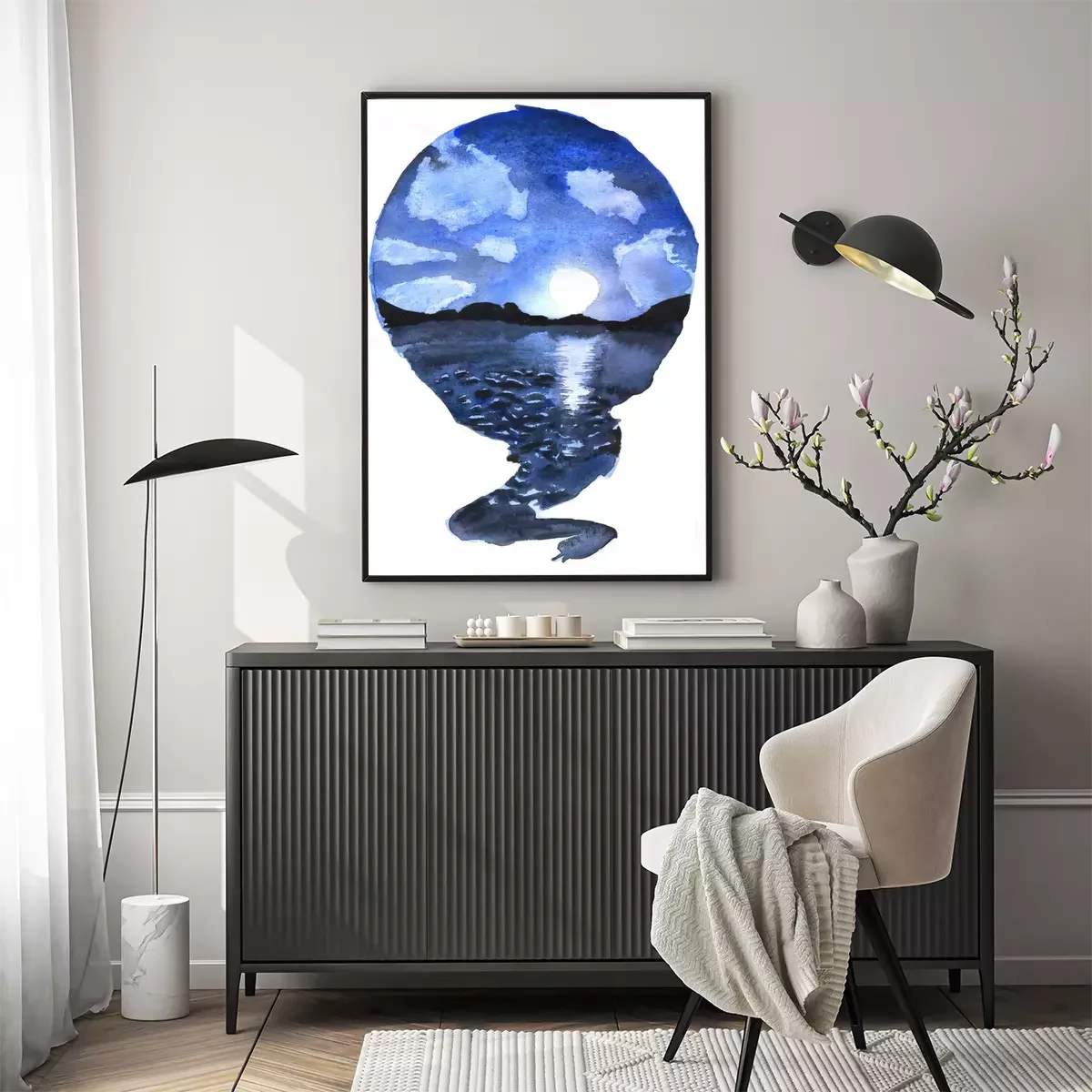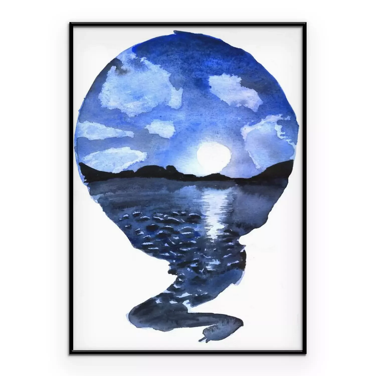 Poster: round watercolor drawing landscape nature, lake, night, full moon
