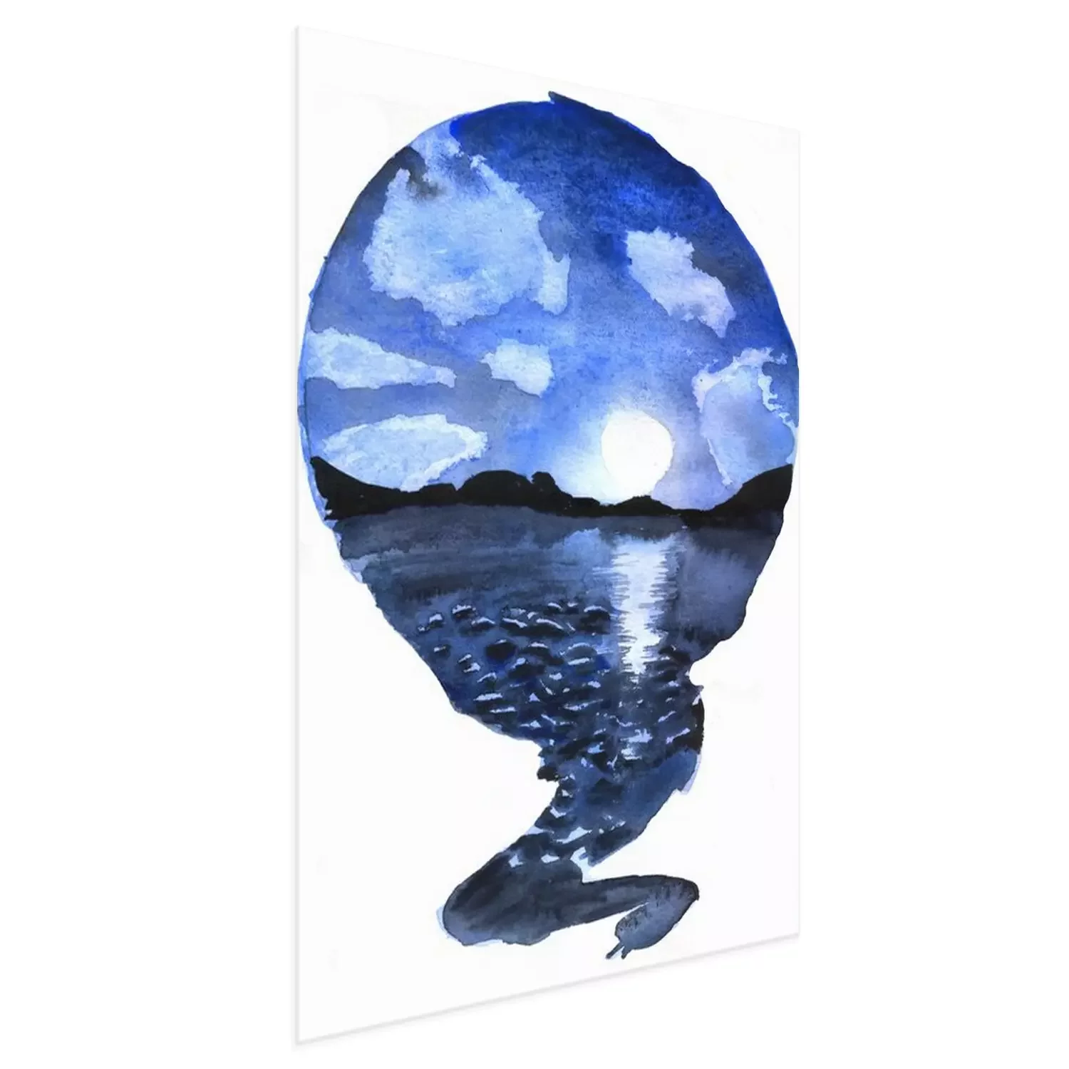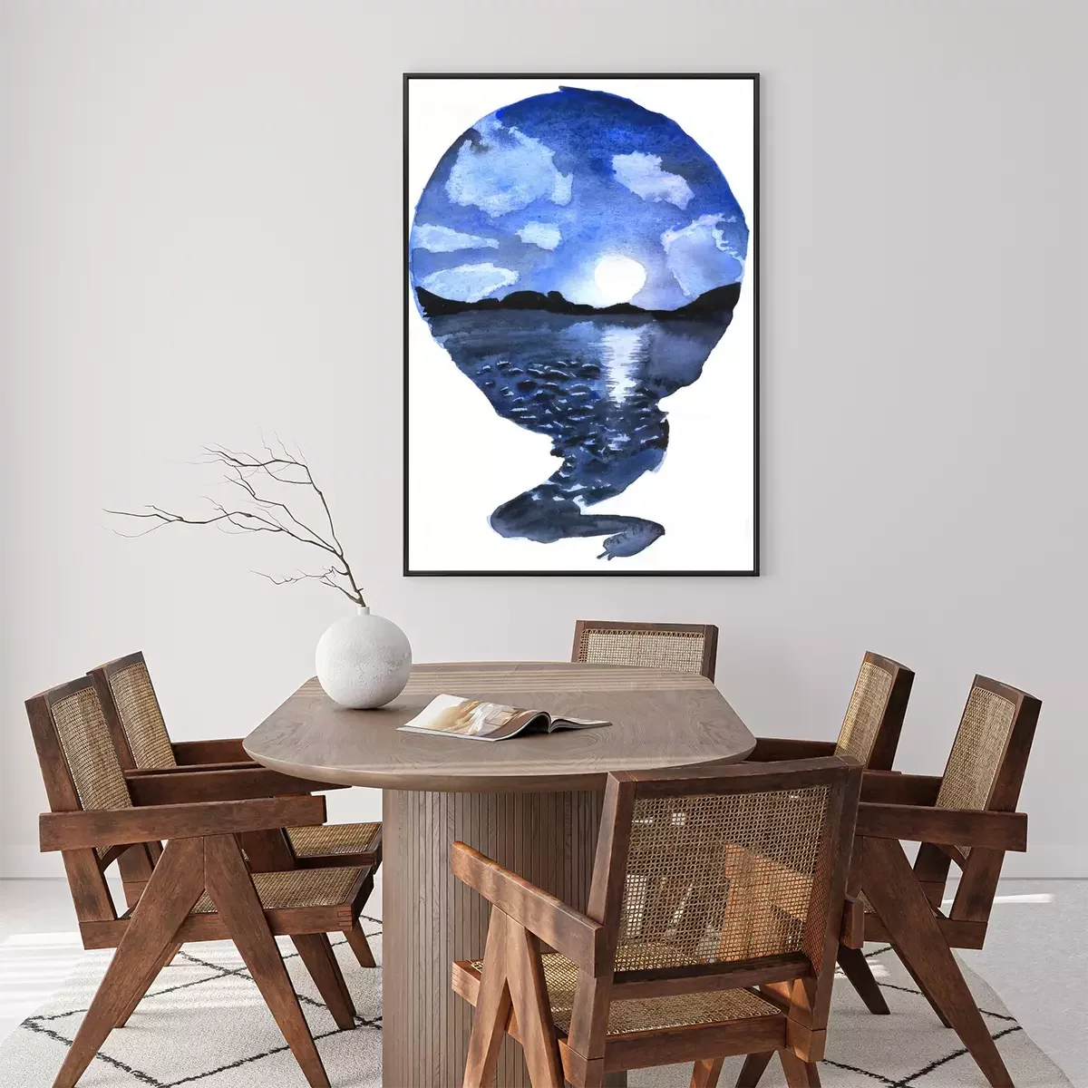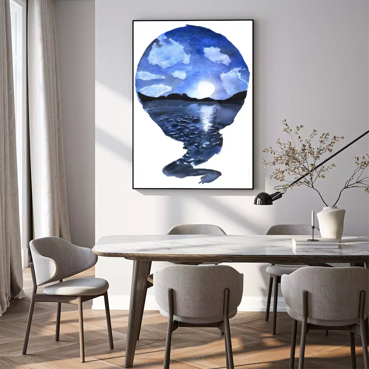 Poster: round watercolor drawing landscape nature, lake, night, full moon