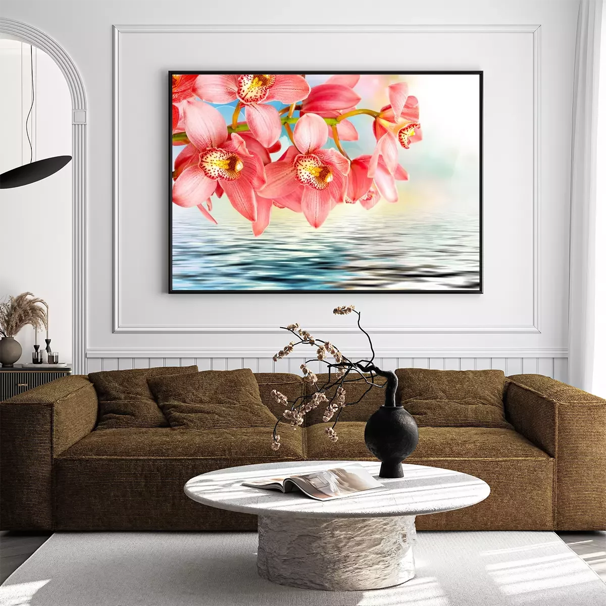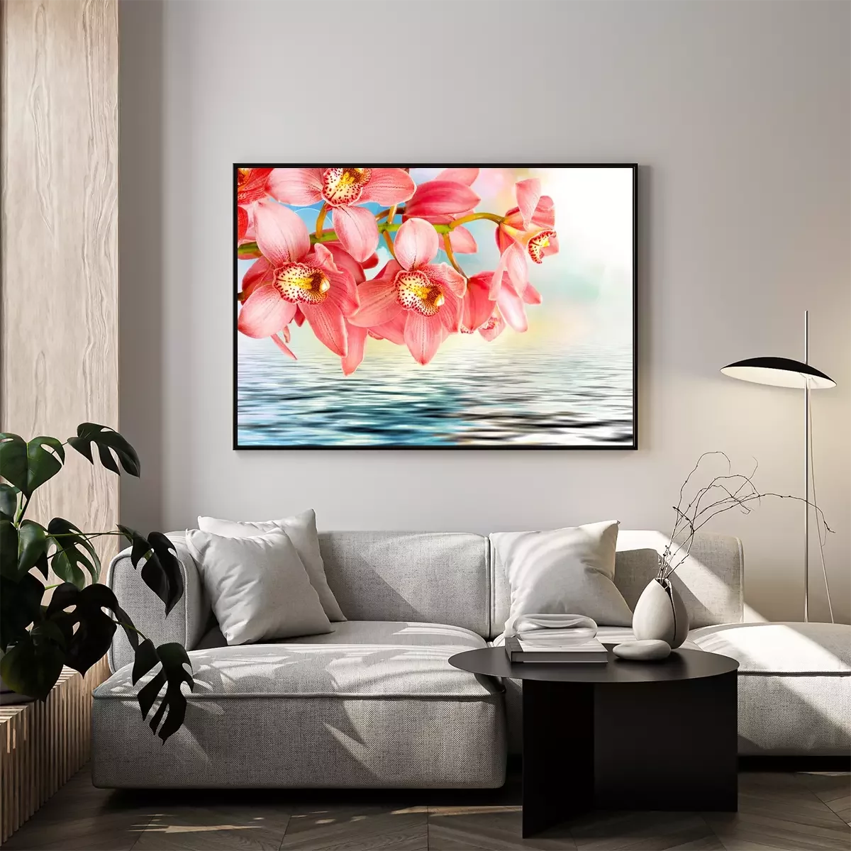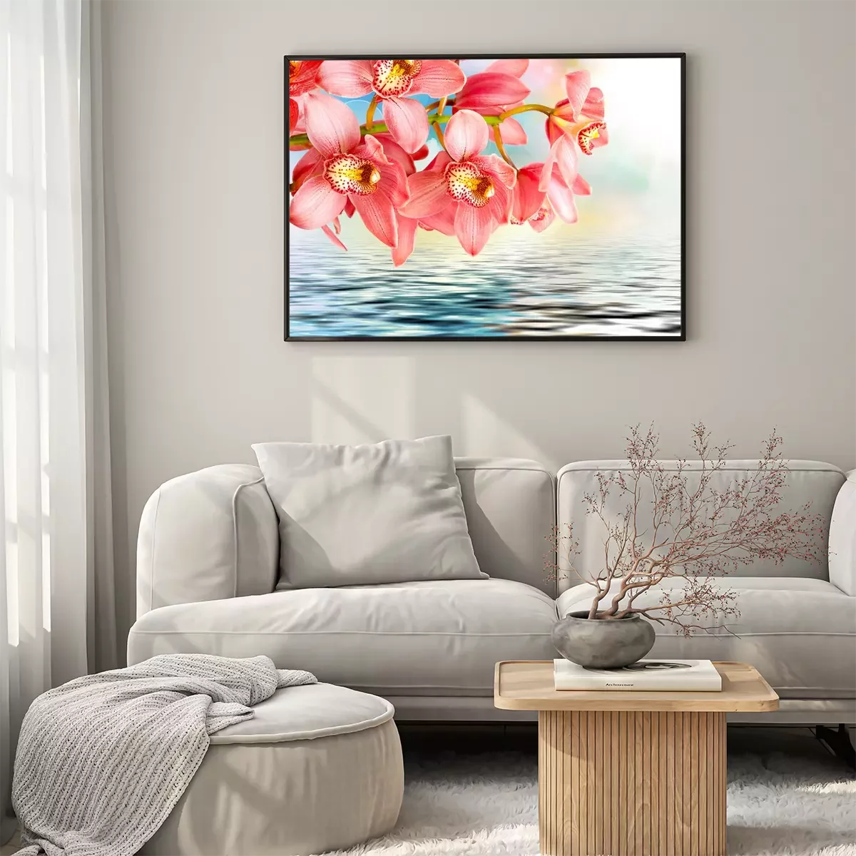 Poster: Roze bloemen die over het wateroppervlak vallen